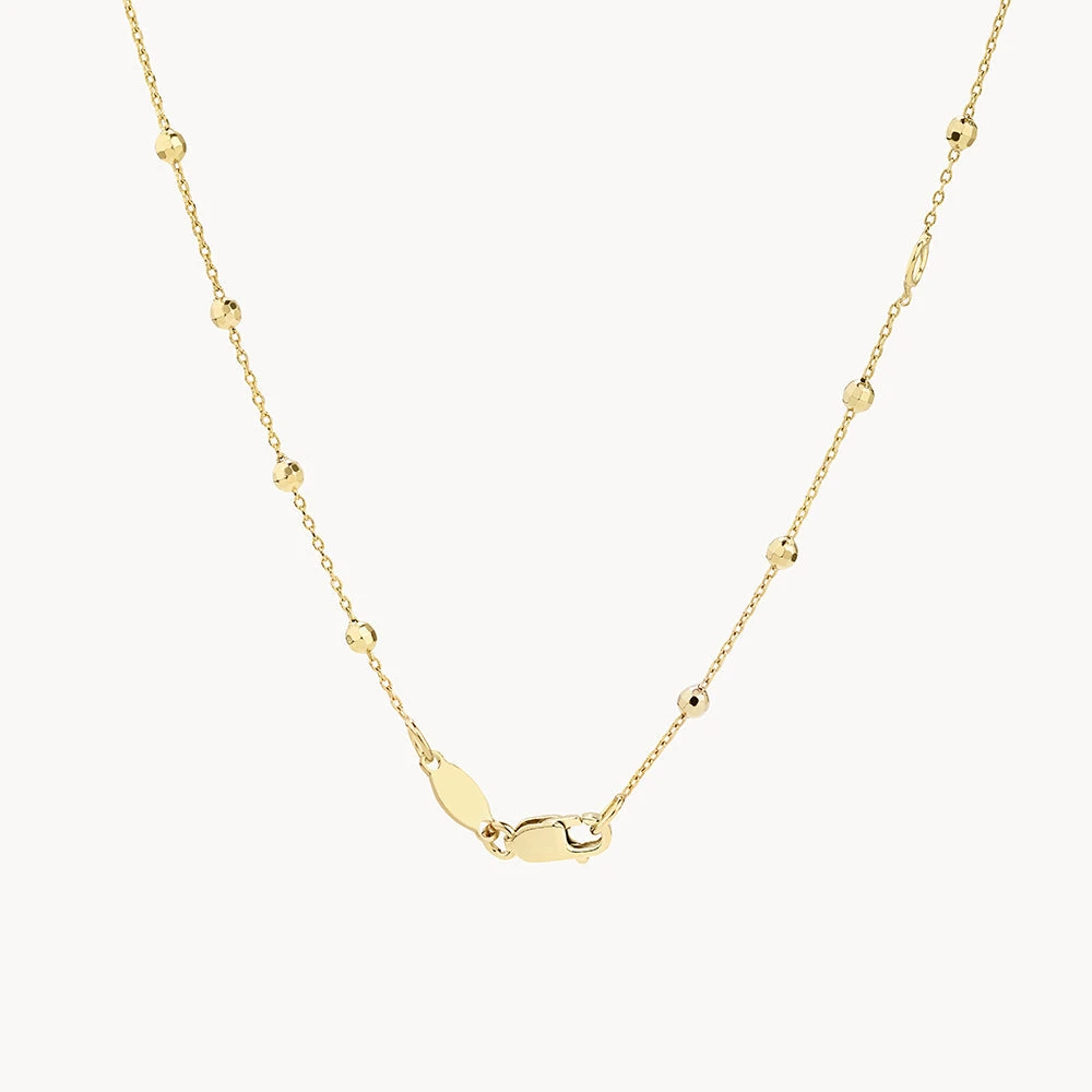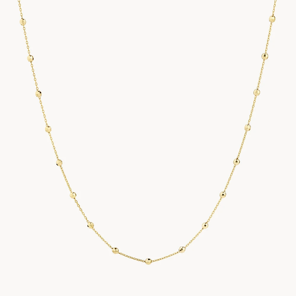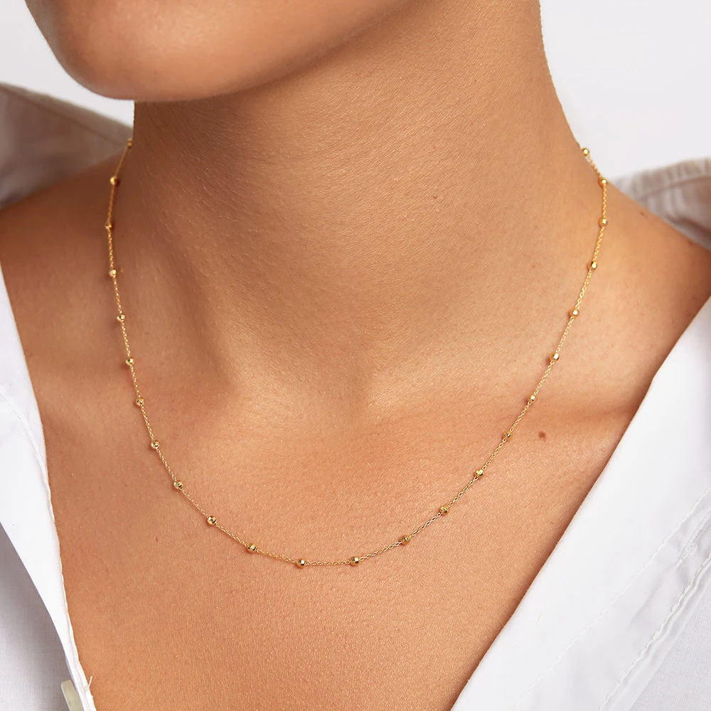 Dainty and stylish, the bauble necklace in gold features gold sphere beads along a fine dainty chain. Plated in 18k fine gold over a sterling silver core, this gold chain necklace catches the light. The perfect beaded gold chain necklace with classic sphere balls to hang your pendant or layer with a gold paperclip necklace.