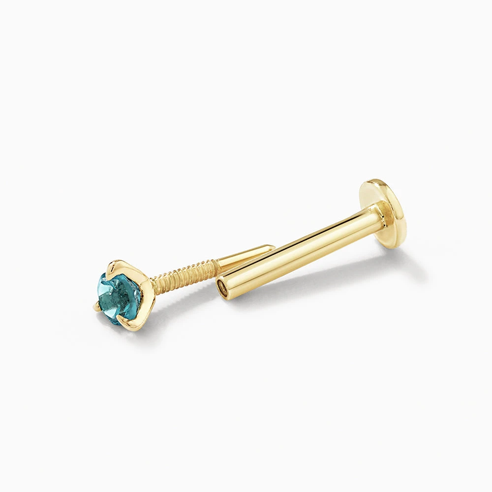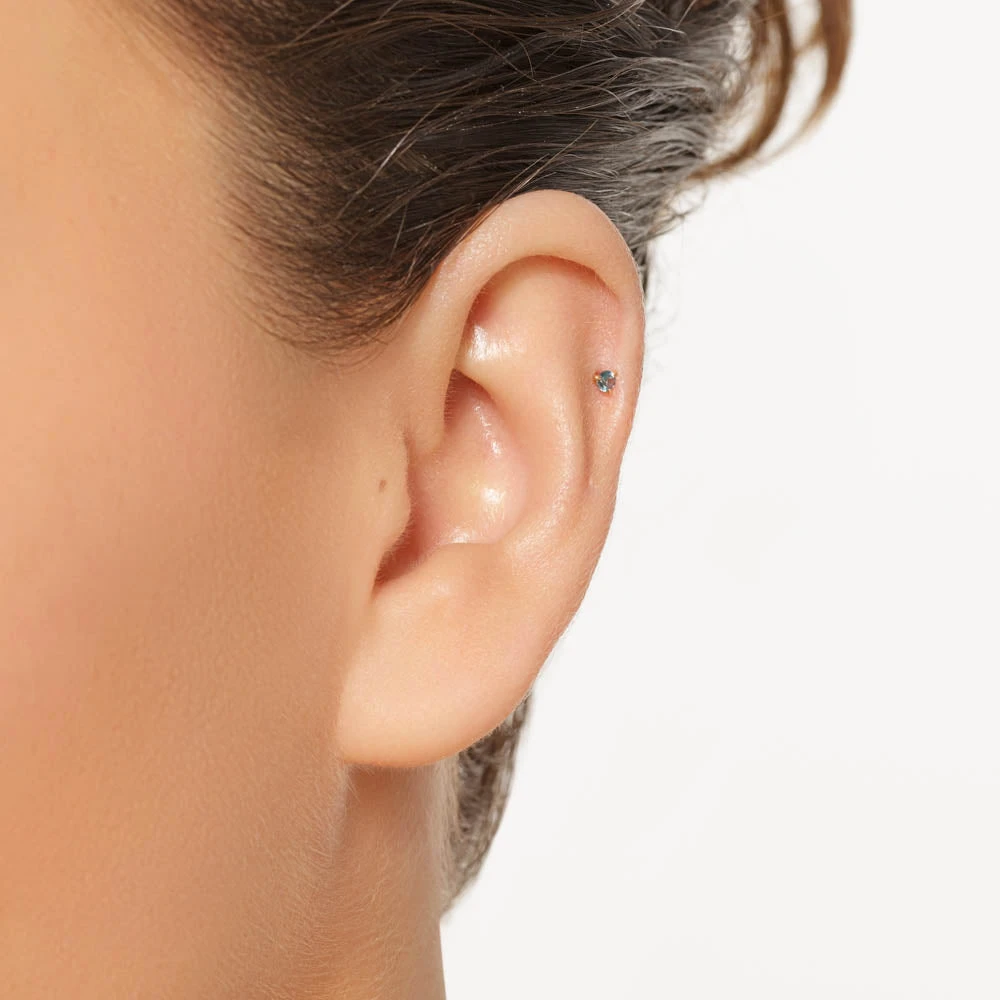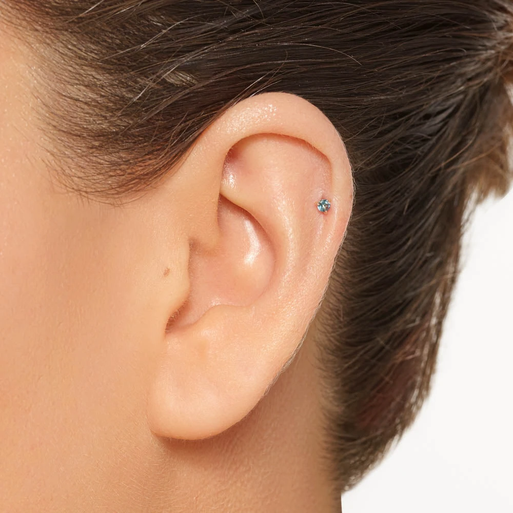 Bring a creative yet timeless touch of colour to your curated ear stack, with this single blue topaz helix earring. Crafted in 10k yellow gold and featuring an AA grade, round brilliant cut London Blue topaz, this stud is subtle yet unexpected. Featuring a comfortable flat back design and 8mm post, it’s created specially to be worn in your helix piercing. Pair it back with your yellow gold or diamond ear stack for an elevated look.