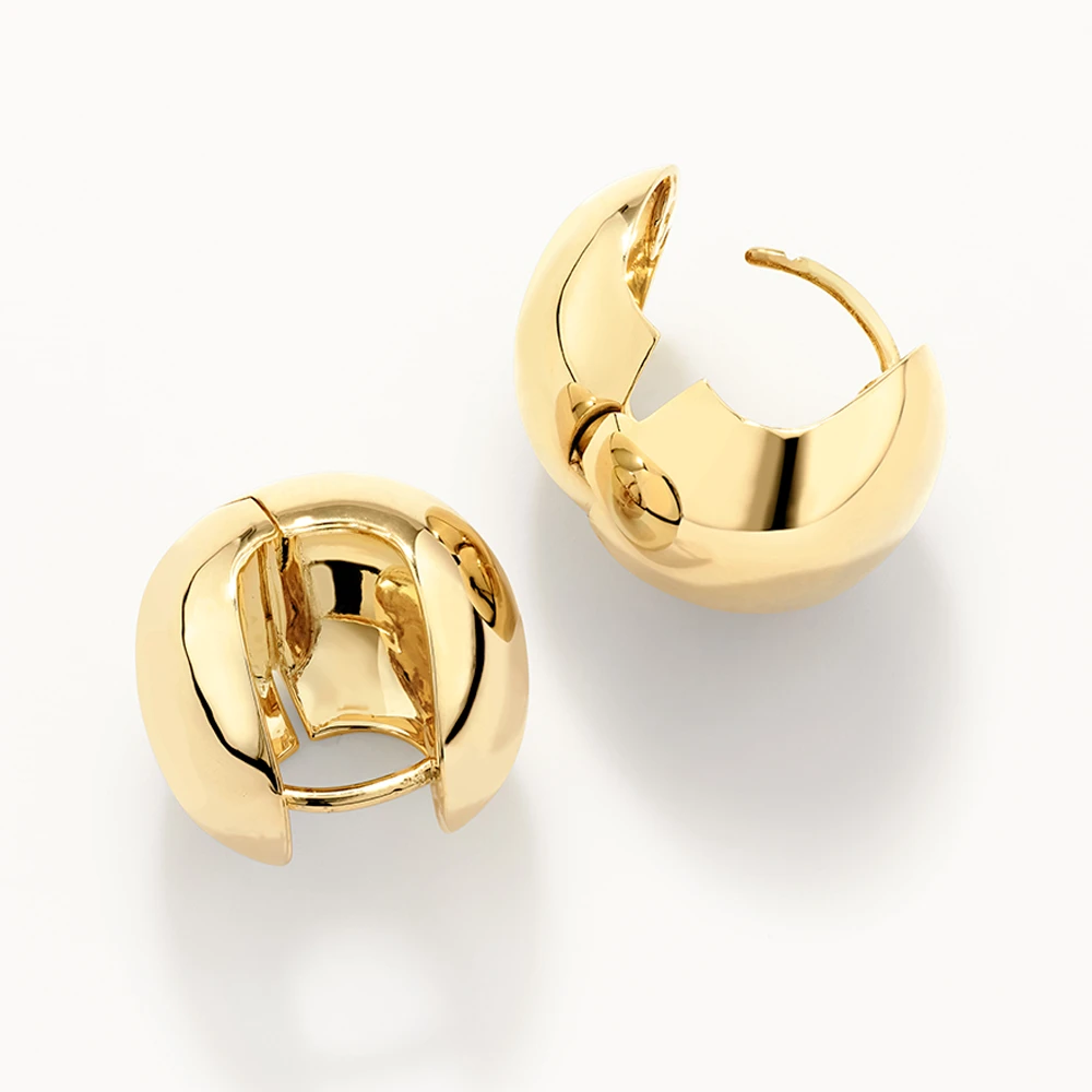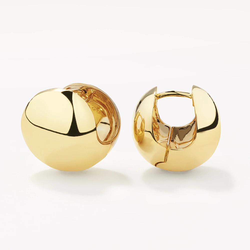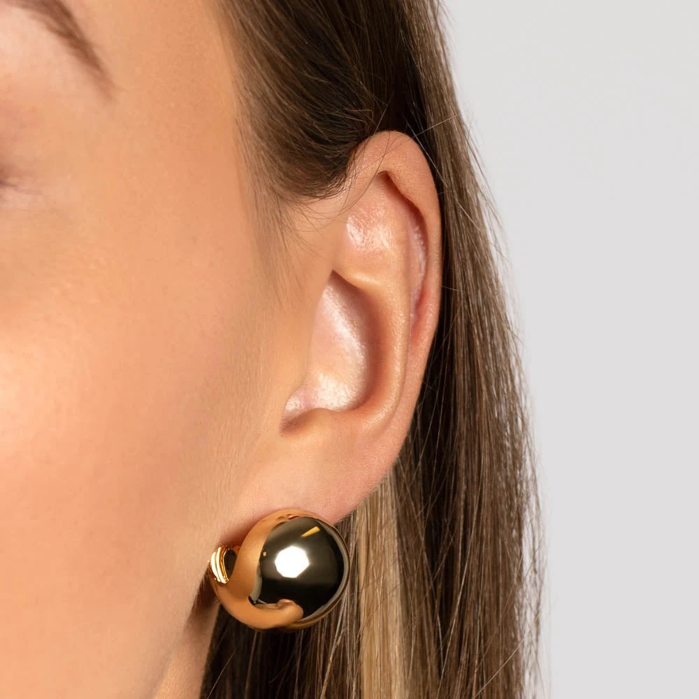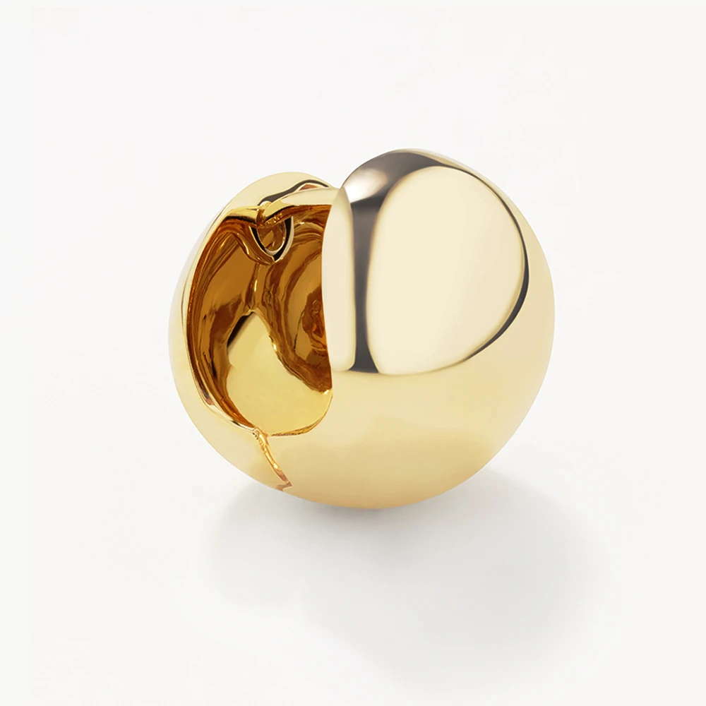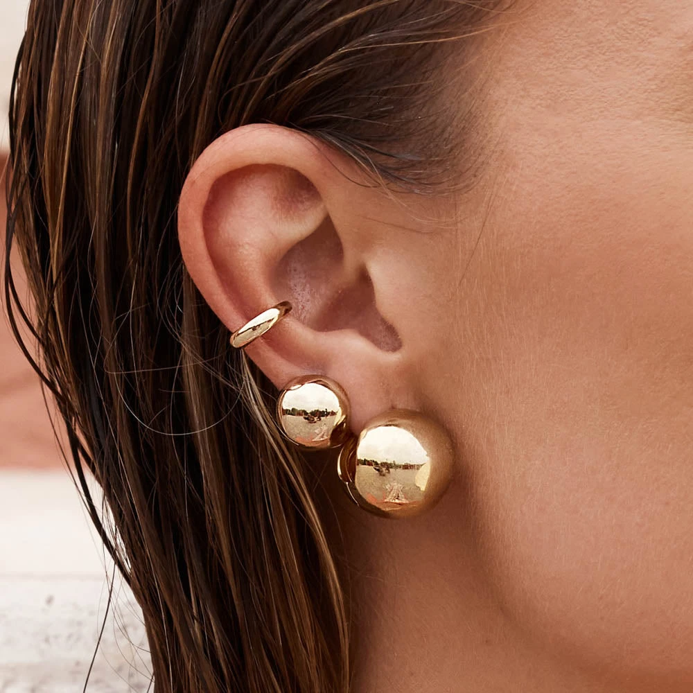 These ball hoops are the chunky, statement huggie earring you’ve been dreaming of. With their bold, curvy proportions, these 18mm sphere-shaped gold huggies can be worn alone for effortless glam, or paired back with hoops and studs for an eye-catching stack. Also available in silver.