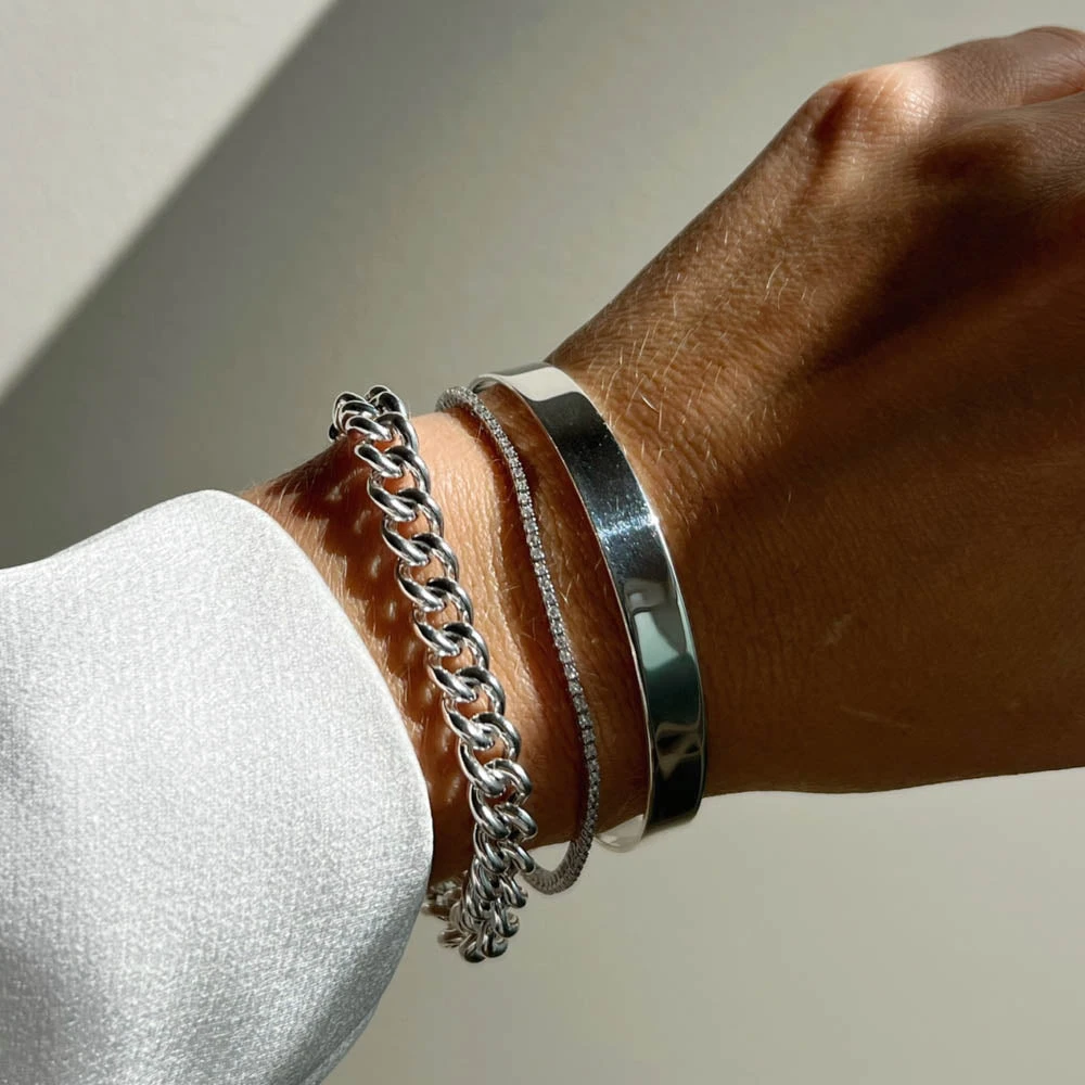 This statement bangle in polished 925 sterling silver is the ultimate balance of modern and timeless. A classic shape in a trending sleek design, the polished curve bangle in sterling silver is the perfect addition to your silhouette. For an extra chic look, wear it over the top of long sleeves and knits.