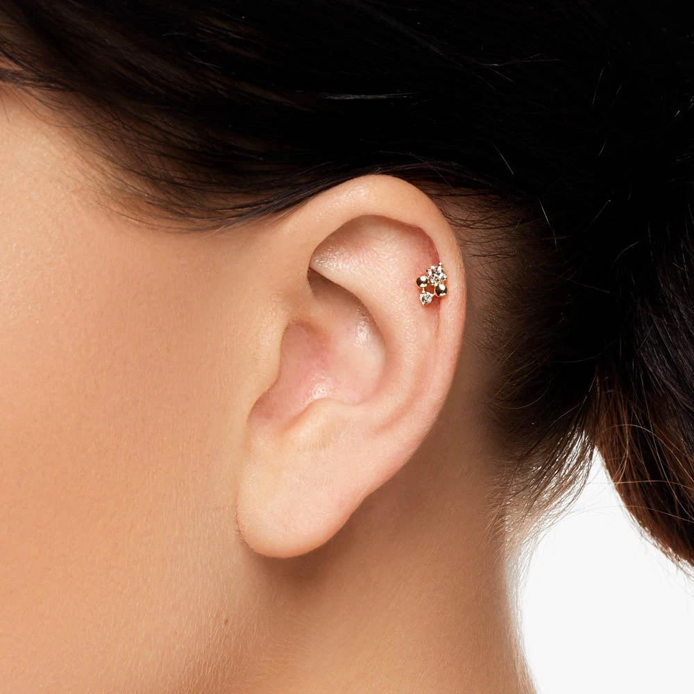 An elevated take on a flower earring, this flatback stud is a unique addition to your diamond helix jewellery collection. Featuring two natural diamonds and two gold balls in a quartet shape, this single stud earring is available in a 6.5mm and 8mm post length so you can choose your perfect fit. Crafted in 10k gold for forever-favourite status.