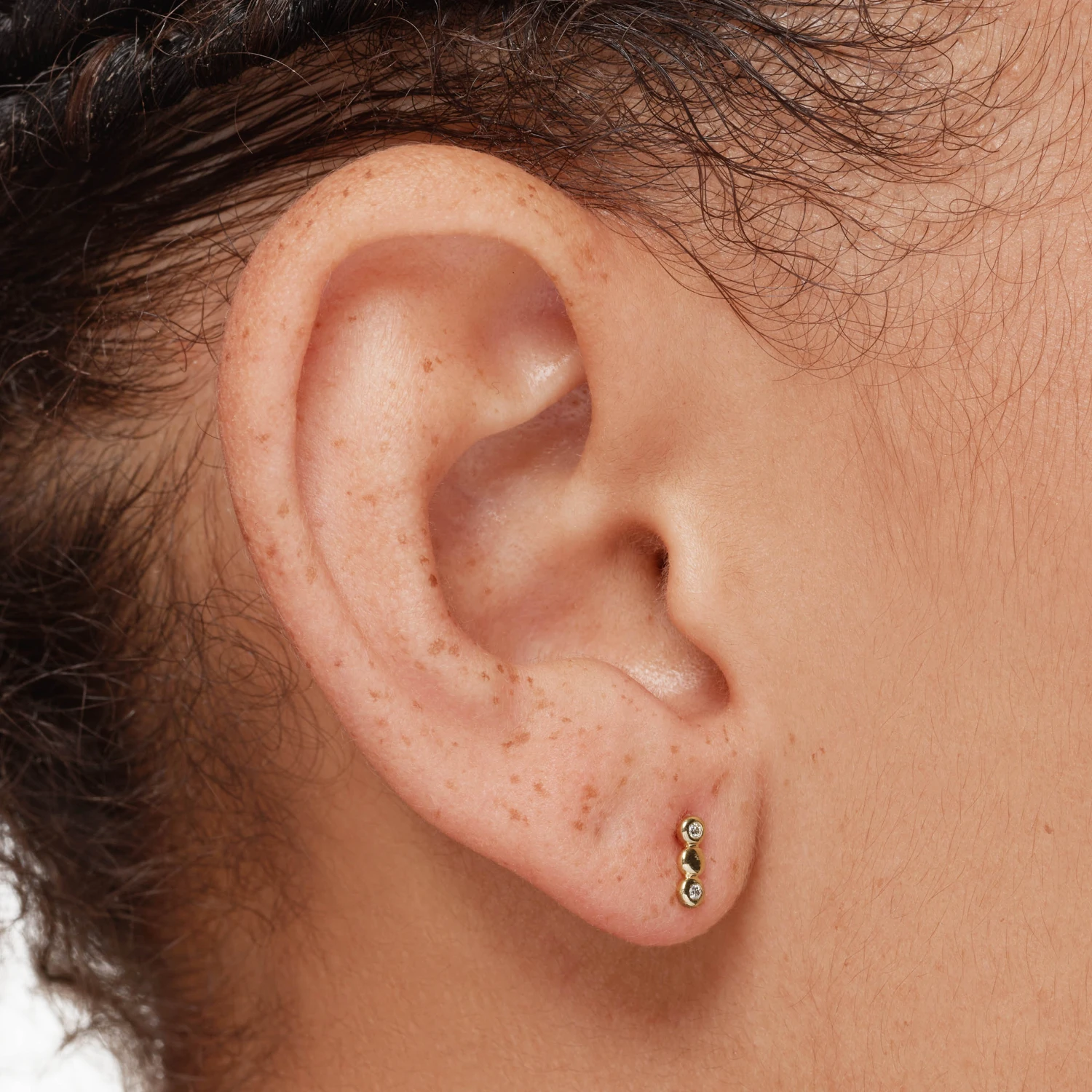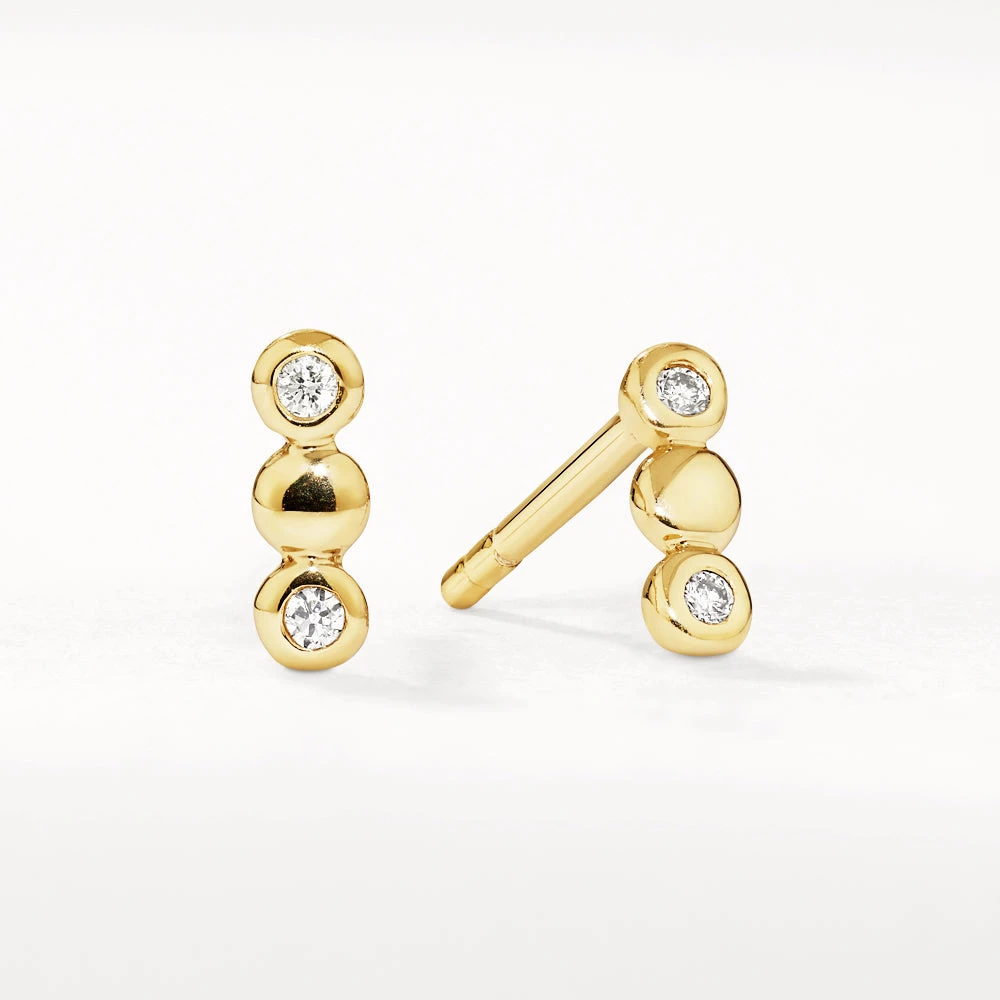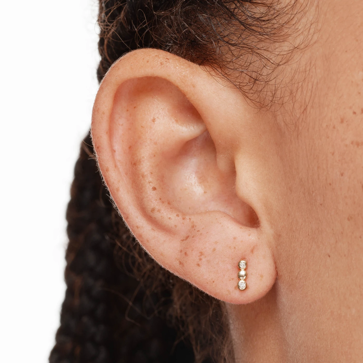 Elevate your earring wardrobe with these petite bezel set diamond earrings. Featuring a trio ball design, each with two natural diamonds, these stud earrings are crafted in 18kt fine gold plating.