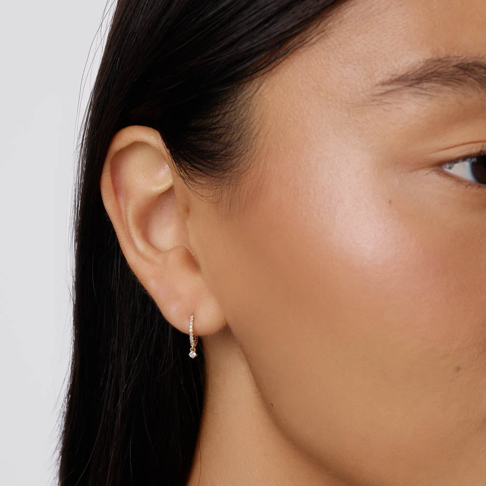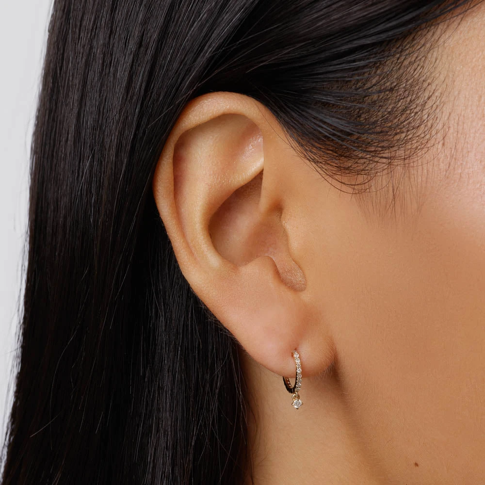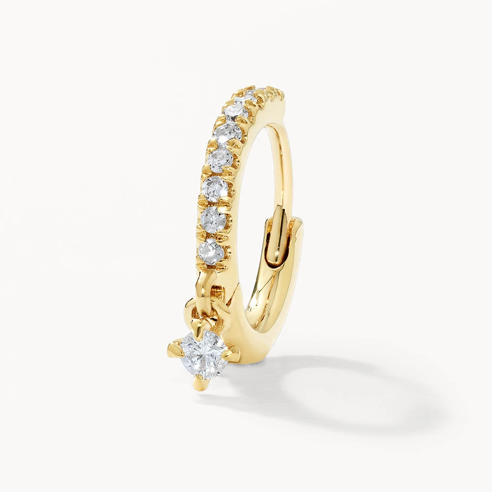 Elevate your curated ear look with this unique yet timeless, single diamond huggie. Combining a huggie and a diamond drop earring, this cartilage piercing style features a petite, swinging diamond pendant for light-catching movement. Featuring 10 natural diamonds in 10k solid gold, this single helix huggie will be your new wear-on-repeat favourite.