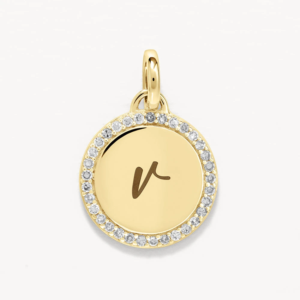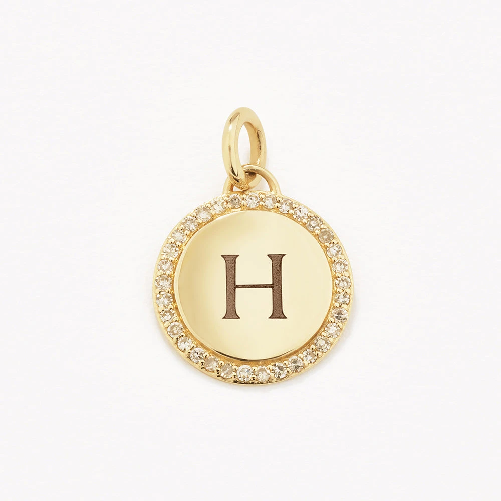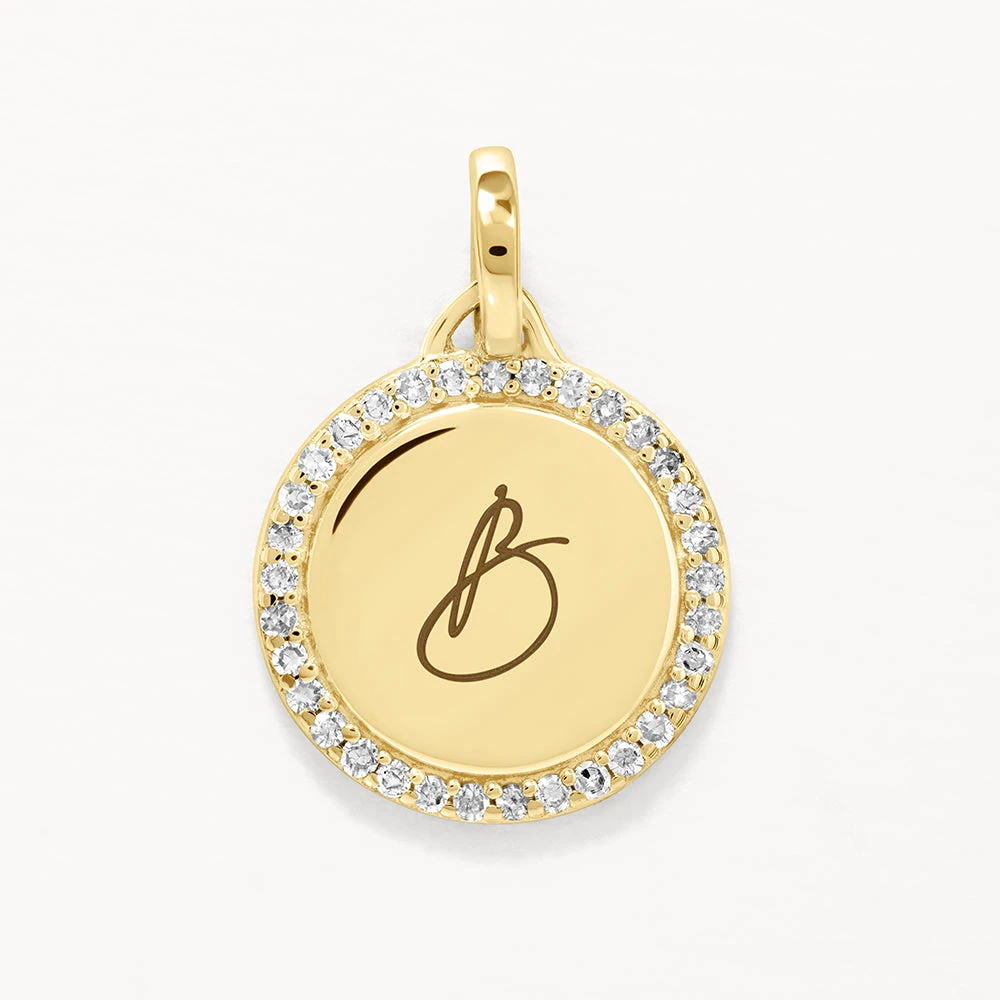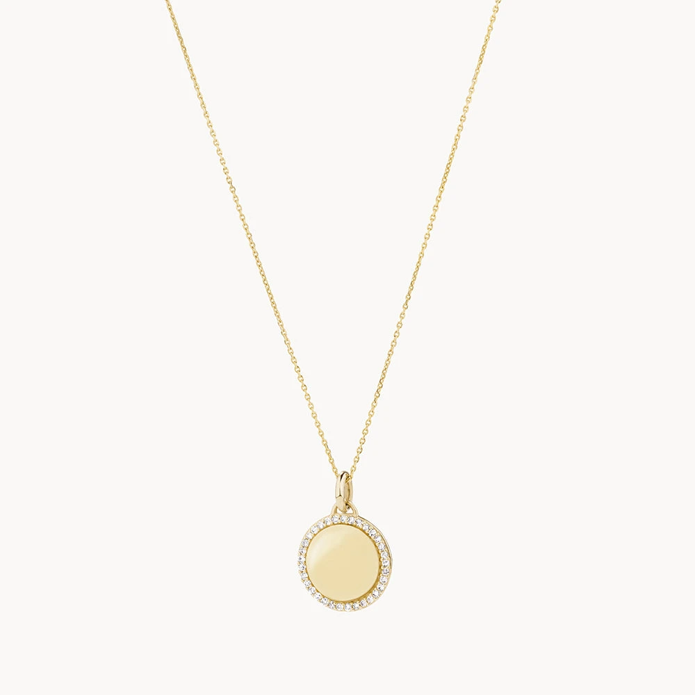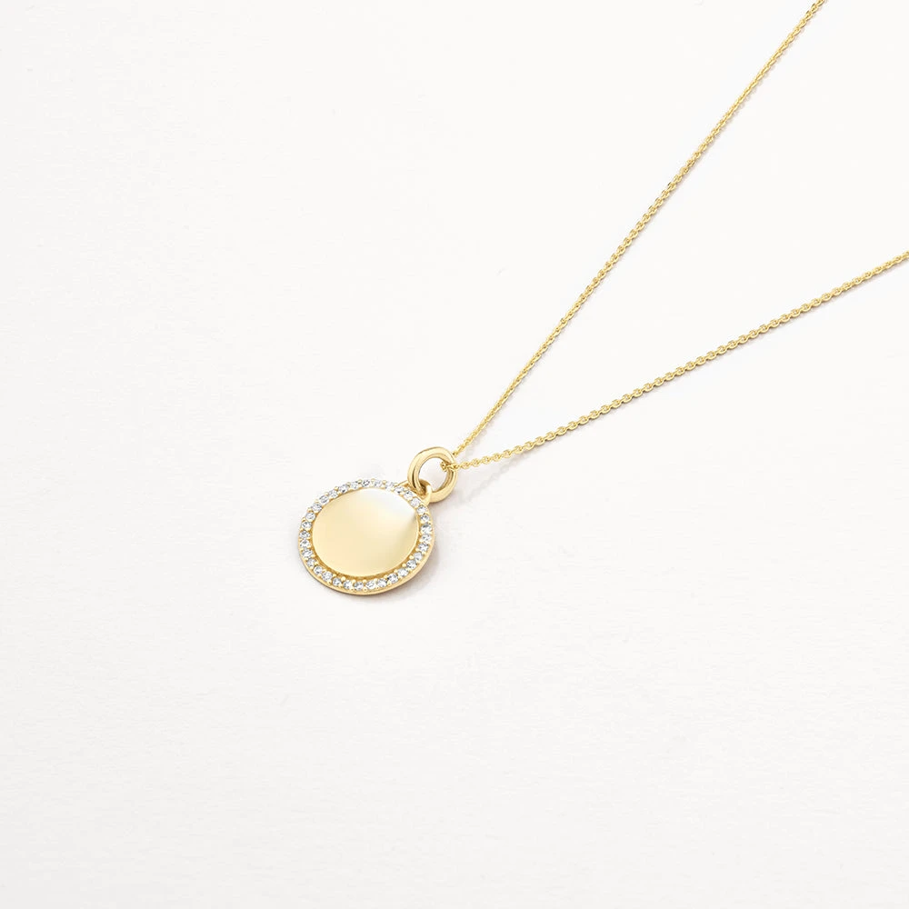 Add a luxurious touch to your personalised, monogram collection with our timeless engravable disc necklace. Crafted in 10k gold and bordered with micro diamonds this dainty necklace is equally perfect as a gift for someone you love, or as a gift-to-self. Wear this beauty alone for minimalist style or layer with additional chain necklaces for an elevated stack. Also available as a single pendant.