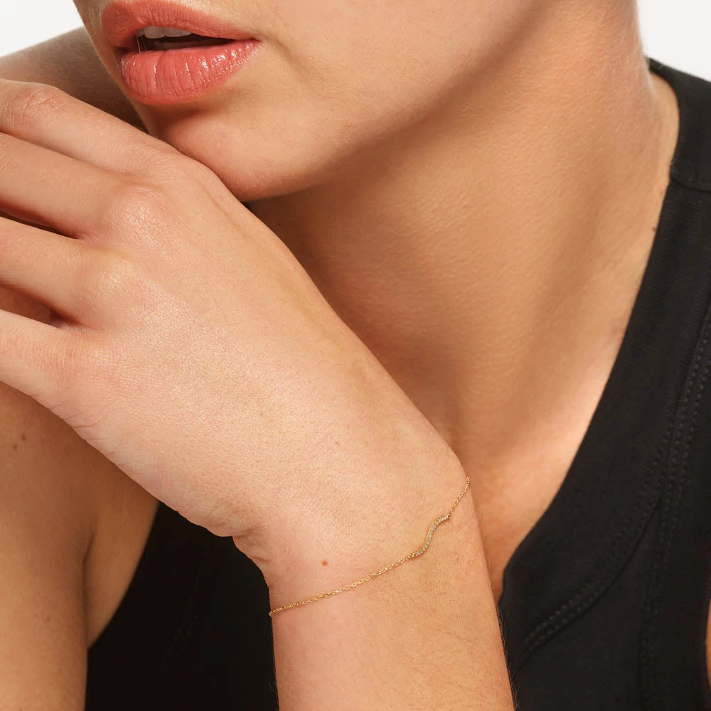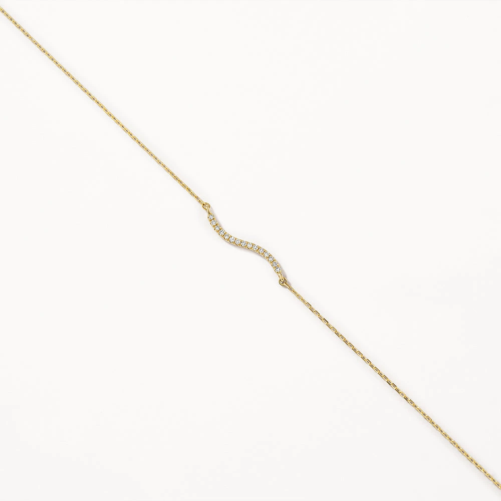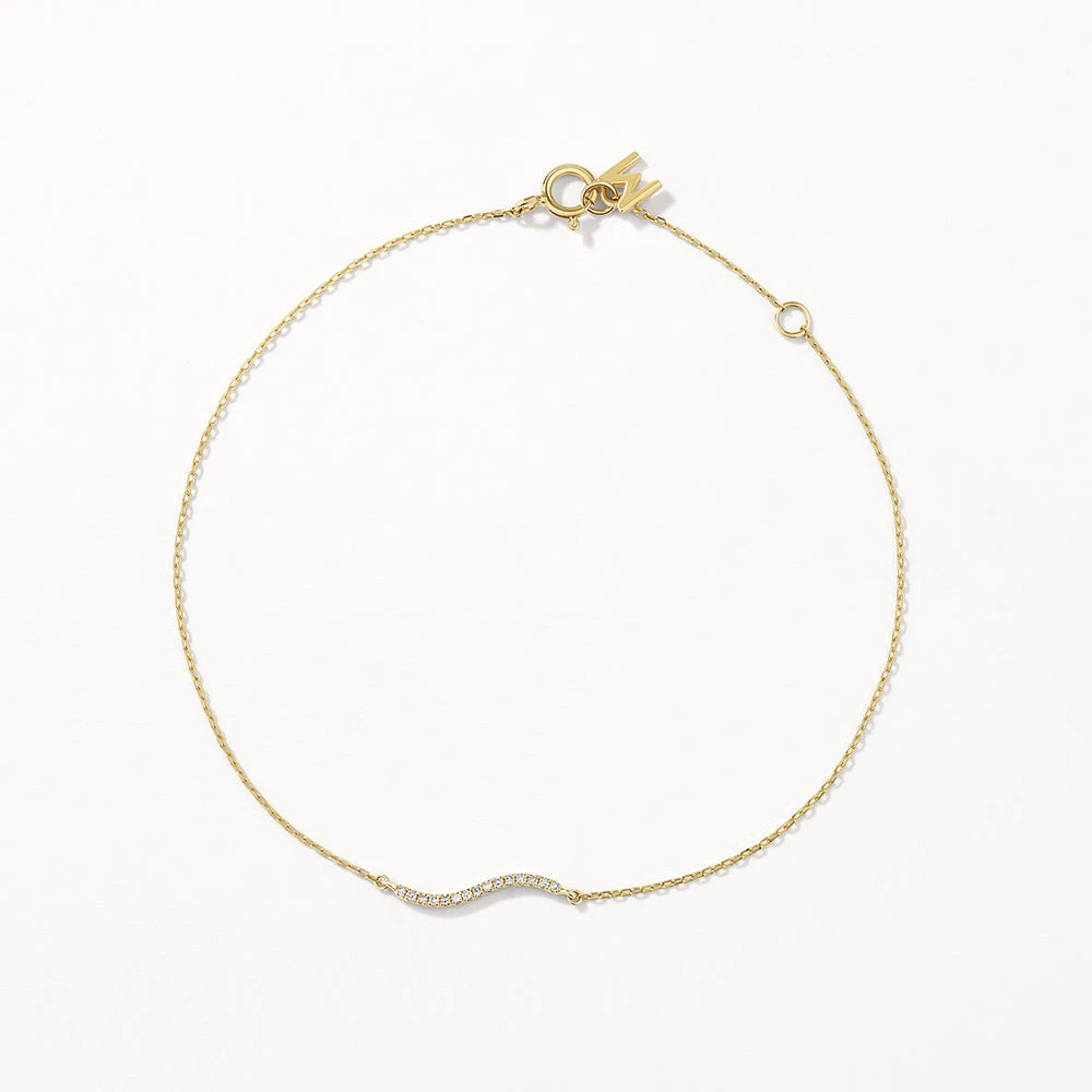 Our fine wave diamond bracelet is the subtly unique, minimalist bracelet of your dreams. The dainty wave design centrepiece features 15 natural diamonds with a 0.035 carat total weight, set in 10k yellow gold. Complete with a fine 10k gold chain, our wave bracelet is a precious piece with everyday wearability. Wear it alone for a minimalist look, or pair with your favourite gold and diamond jewellery essentials.