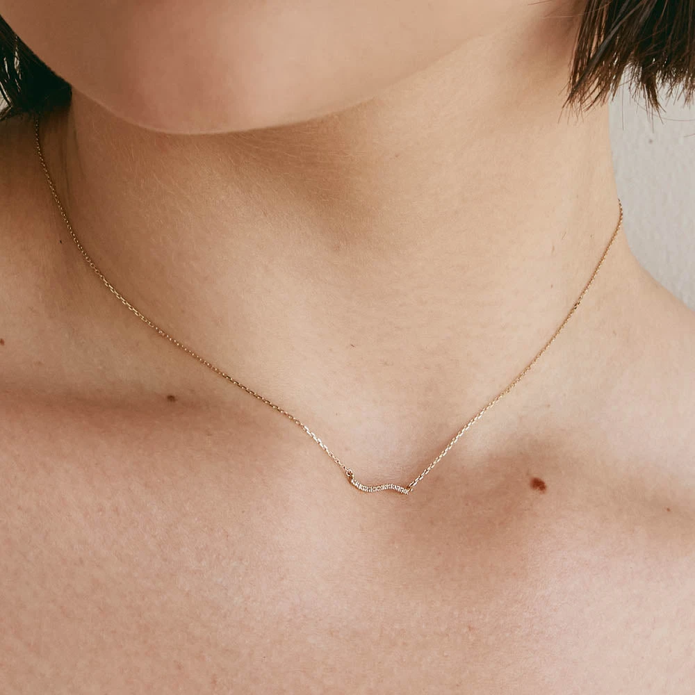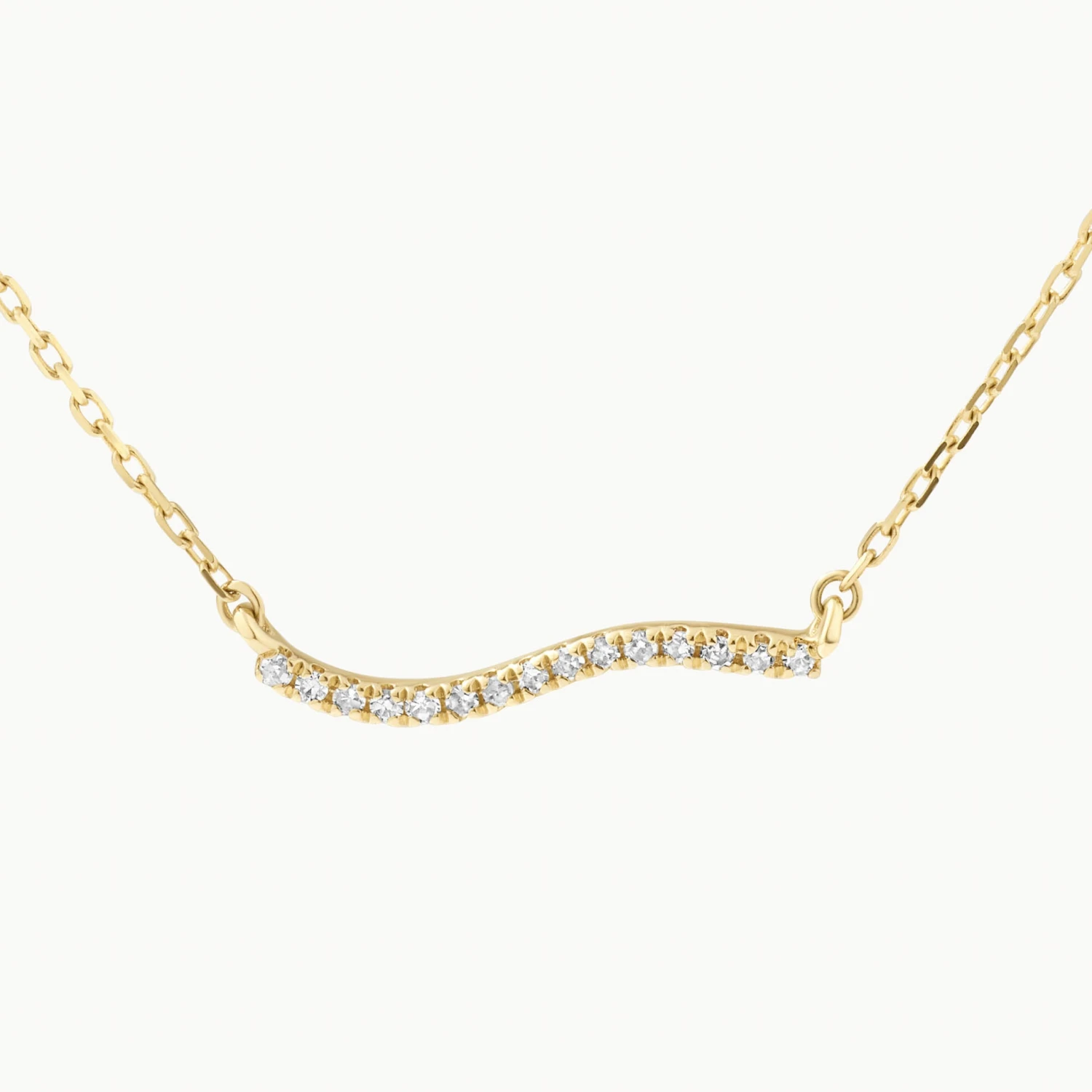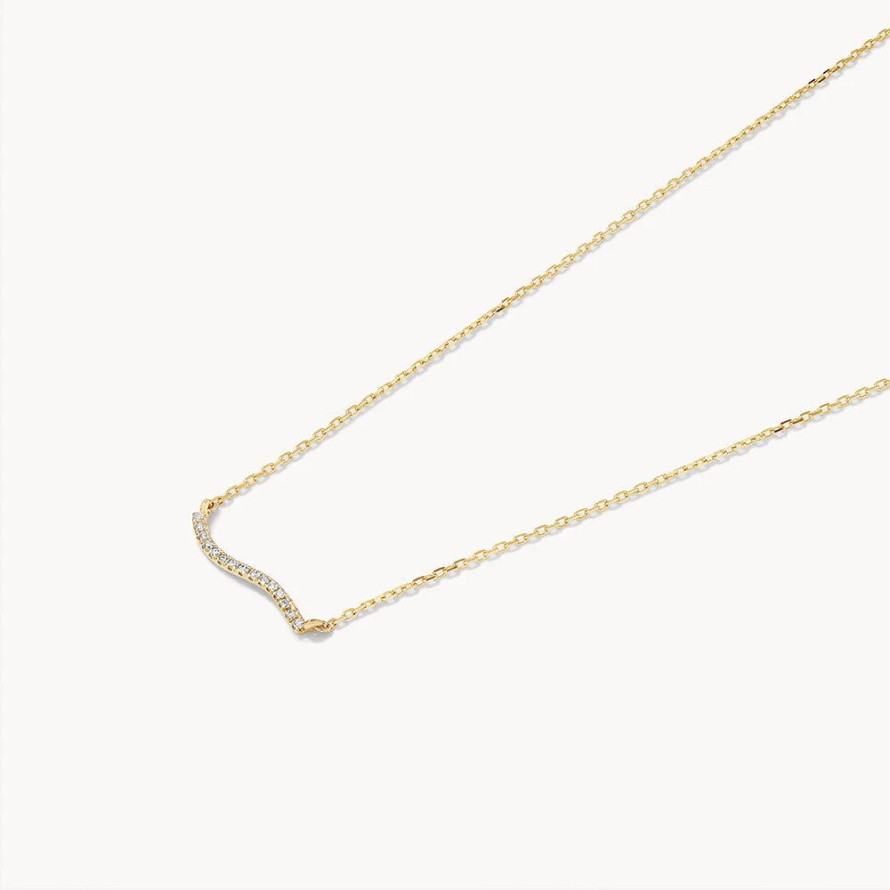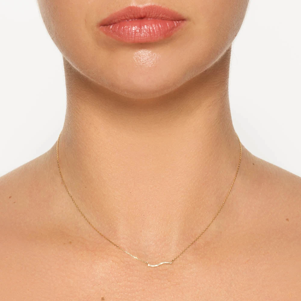 Our fine wave diamond necklace is the subtly unique, minimalist necklace of your dreams. The dainty wave design centrepiece features 15 natural diamonds with a 0.035 carat total weight, set in 10k yellow gold. Complete with a fine 10k gold chain with a 45cm length, our wave necklace is a precious piece with everyday wearability. Wear it alone for a minimalist look, or pair with your favourite gold and diamond jewellery essentials.