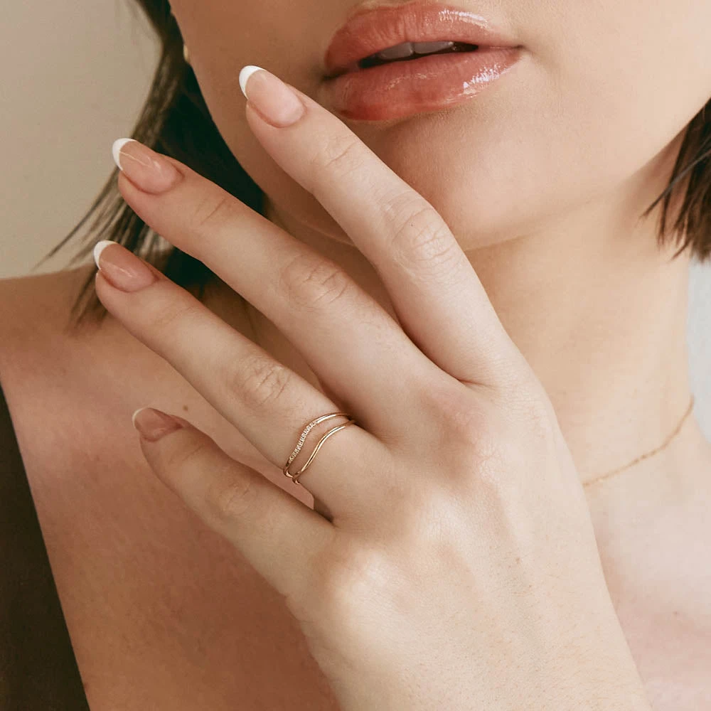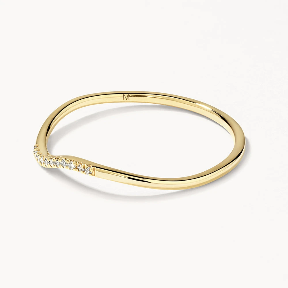 A stackable, minimalist gold diamond ring with a designer edge. This fine ring features a unique, curved silhouette reminiscent of the fluid movement of water. Crafted in 10k yellow gold with 11 natural diamonds totalling 0.02 carat, this wave ring is a forever piece that you can wear alone for understated radiance or stack with gold and diamond rings. Pair it with our gold fine wave ring for the perfect complement to enhance its curves. Available in five sizes.