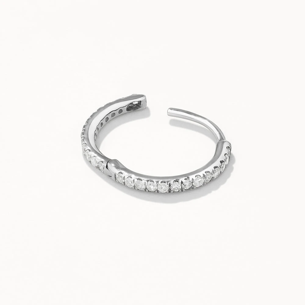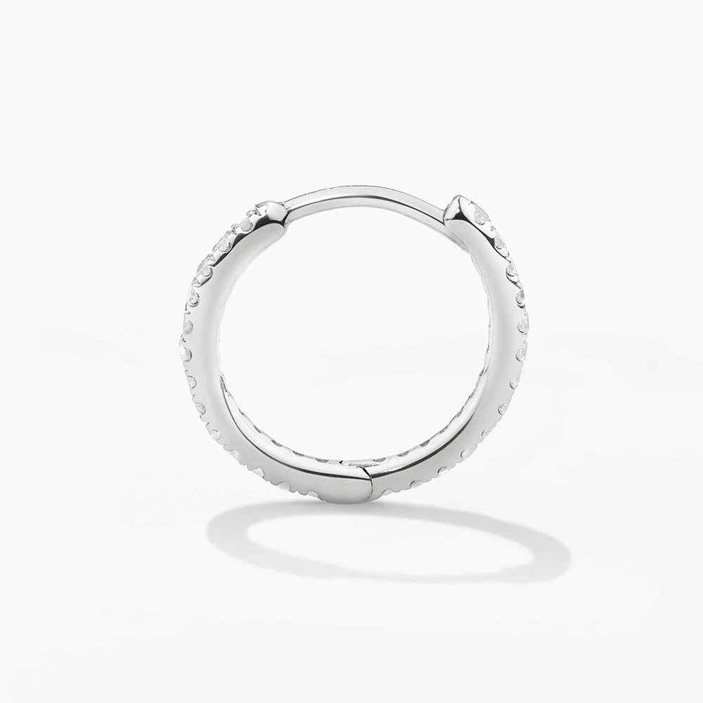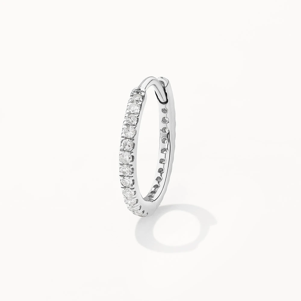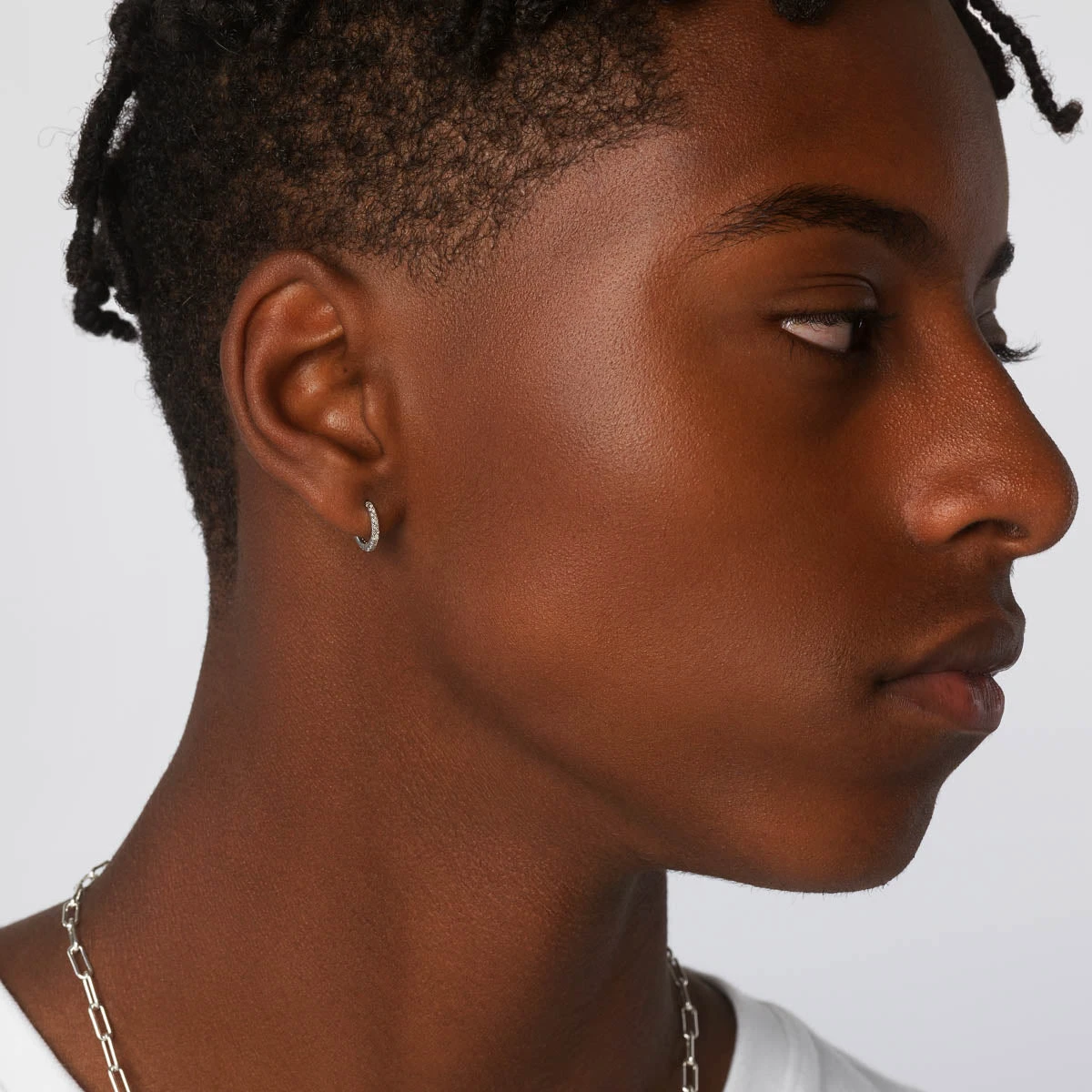 This petite, 7mm single diamond huggie is designed just for your helix piercing. Work the sterling silver single diamond micro helix huggie into a full micro-diamond stack, or pair it with a silver look for a dainty shimmer. Crafted in 925 sterling silver and featuring 20 classic, natural white diamonds, it’s the perfect daily style. Designed as helix piercing jewellery, this diamond huggie is sold individually as a single earring but can also be worn in lobe piercings.