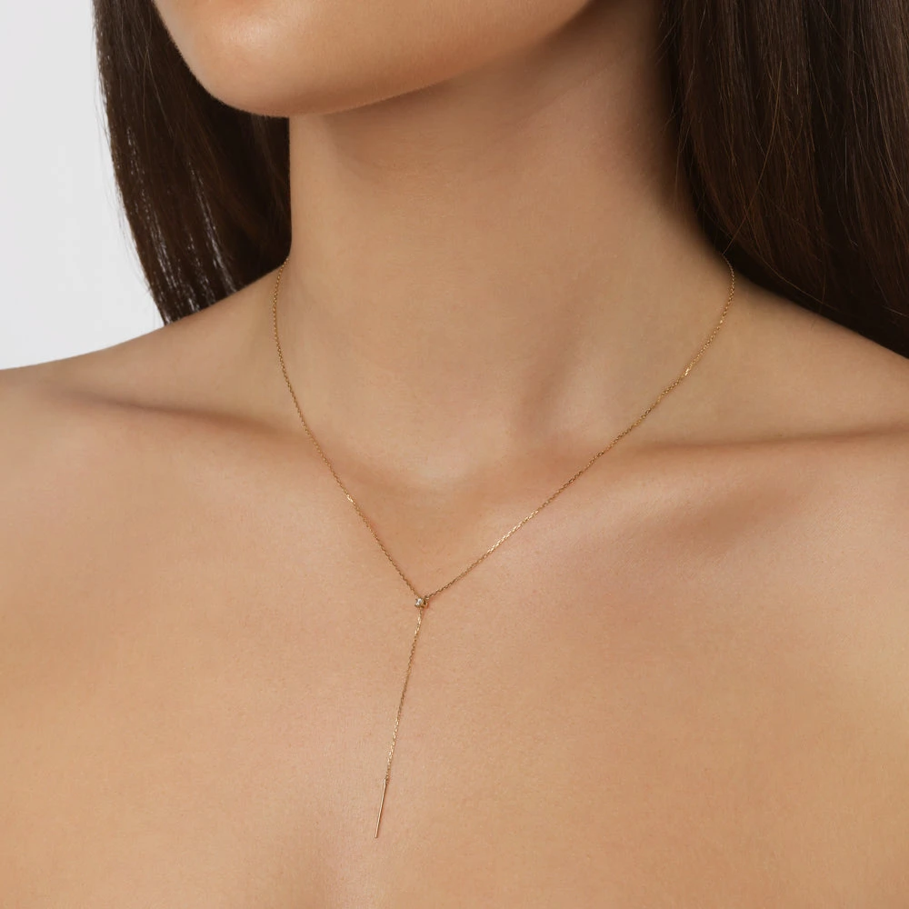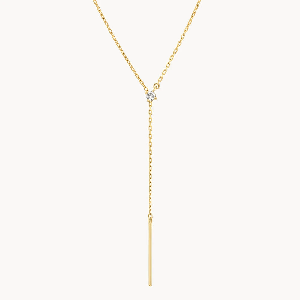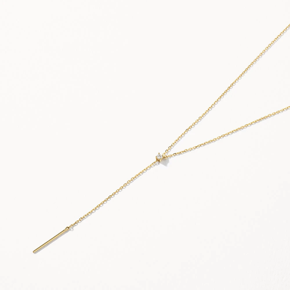 An elevated must-have, this fine diamond necklace will take pride of place in your collection and your every layered necklace look. The 10k gold chain features a fine bar at the end which threads through behind the diamond setting, to create a Y-shaped necklace with an adjustable drop length.