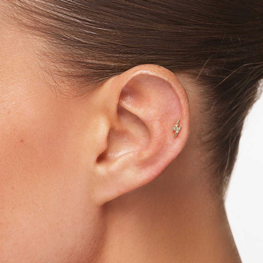 Bring a kitschy but elevated edge to your ear stack, with our lightning bolt helix stud. Designed specially for your cartilage piercing, this single stud brings a contemporary and playful touch to every curated ear. Wear it to contrast the rounded silhouette of stacked gold hoops, or add to a mixed-shape stud stack. Crafted in conflict-free, recycled 10k gold and natural diamonds with a 6.5mm post length. Also available in a 8mm length.