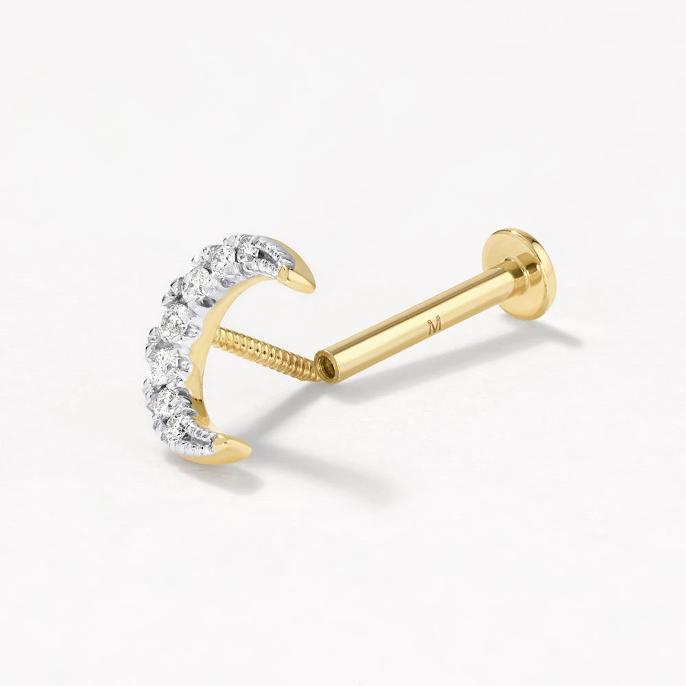 Personalise your collection with this diamond cartilage earring. Featuring a pave diamond crescent moon motif, this single flatback earring is specially designed for your helix piercing. Symbolising nature, renewal, and feminine energy, style this screw back moon stud with other motif designs for a personalised ear party stack. Available with an 6.5mm or 8mm post.