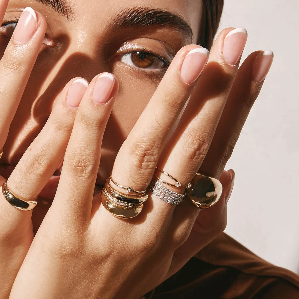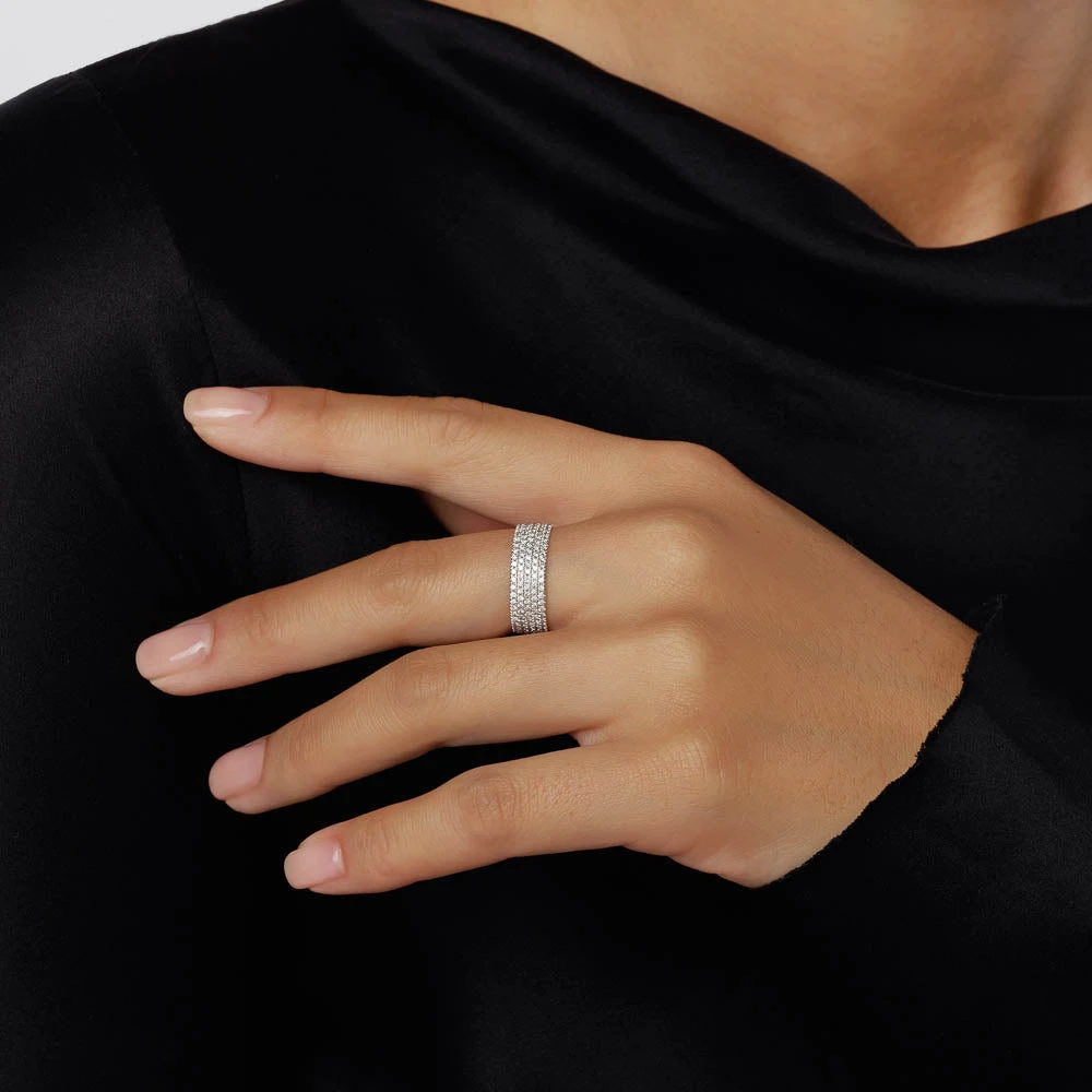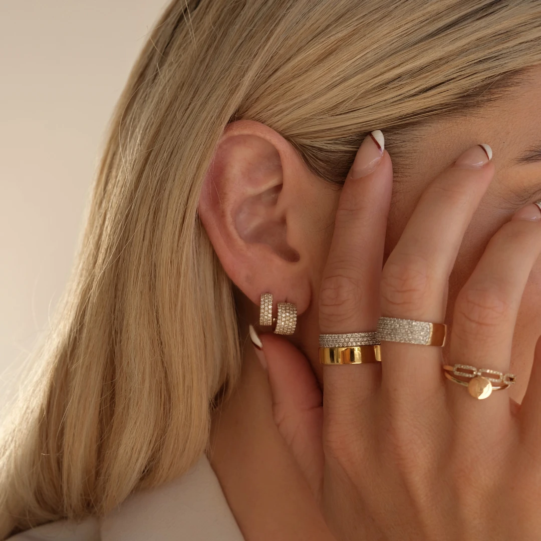 Meet the luxe diamond band ring of your dreams. Our boyfriend pave diamond ring features 119 micro natural diamonds, for shimmery, faceted sparkle. Wear it alone to keep full attention on this extra-special piece, or style with gold stacker rings for a statement look. Available in 5 sizes.