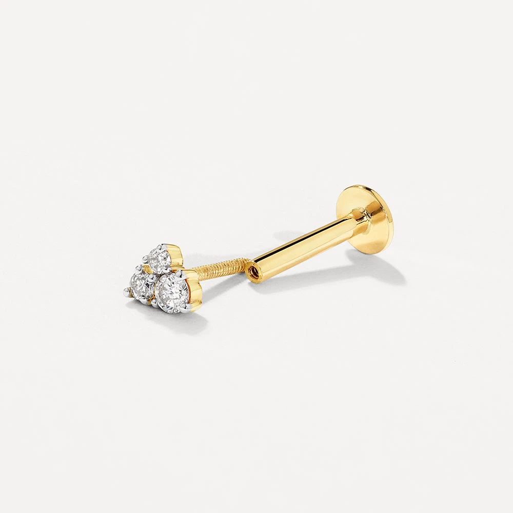 Elevate your ear stack with this minimalist yet luxe diamond helix stud. Designed for your cartilage piercing, this single diamond stud earring features a flat back, so it’s comfortable to wear in your helix. Available in two post lengths, 6.5mm and 8mm. Crafted in 10k gold with a trio of tiny diamonds, this will be a forever-favourite for your ear stack. Also available as a pair here.