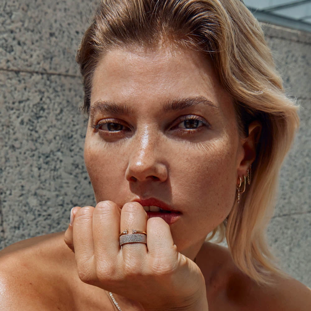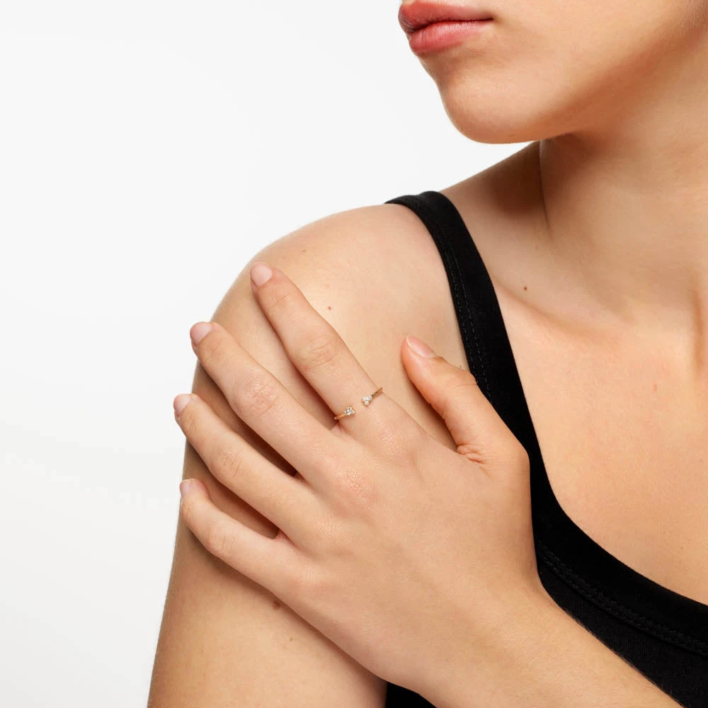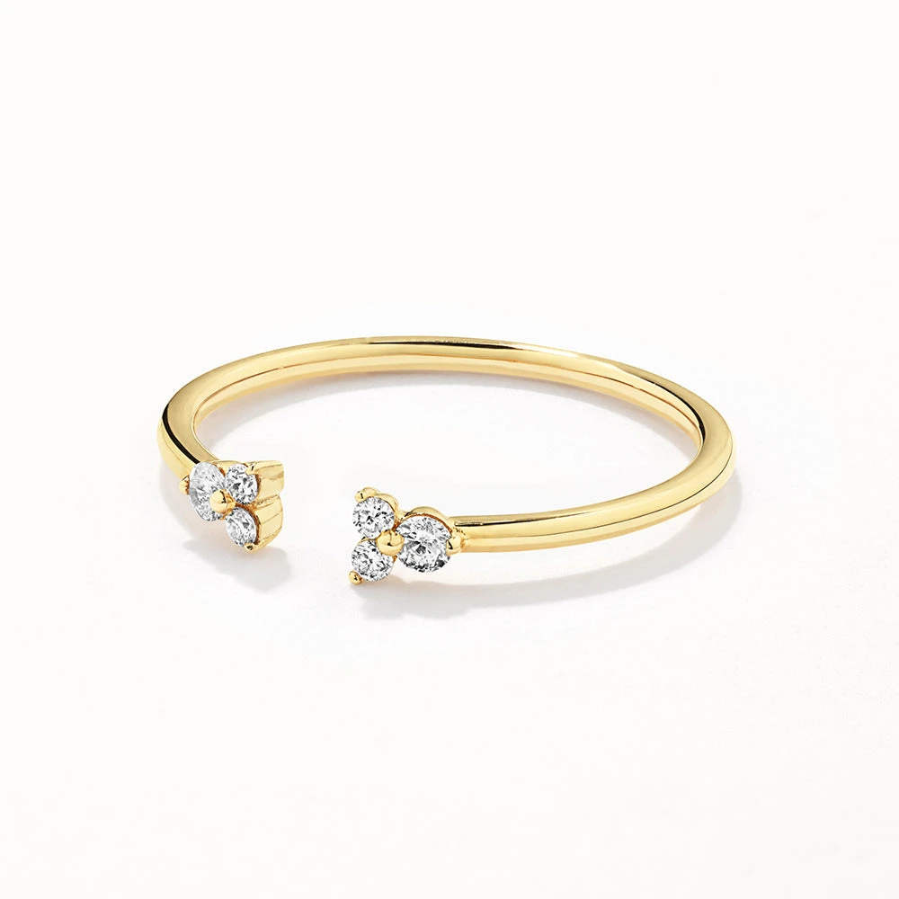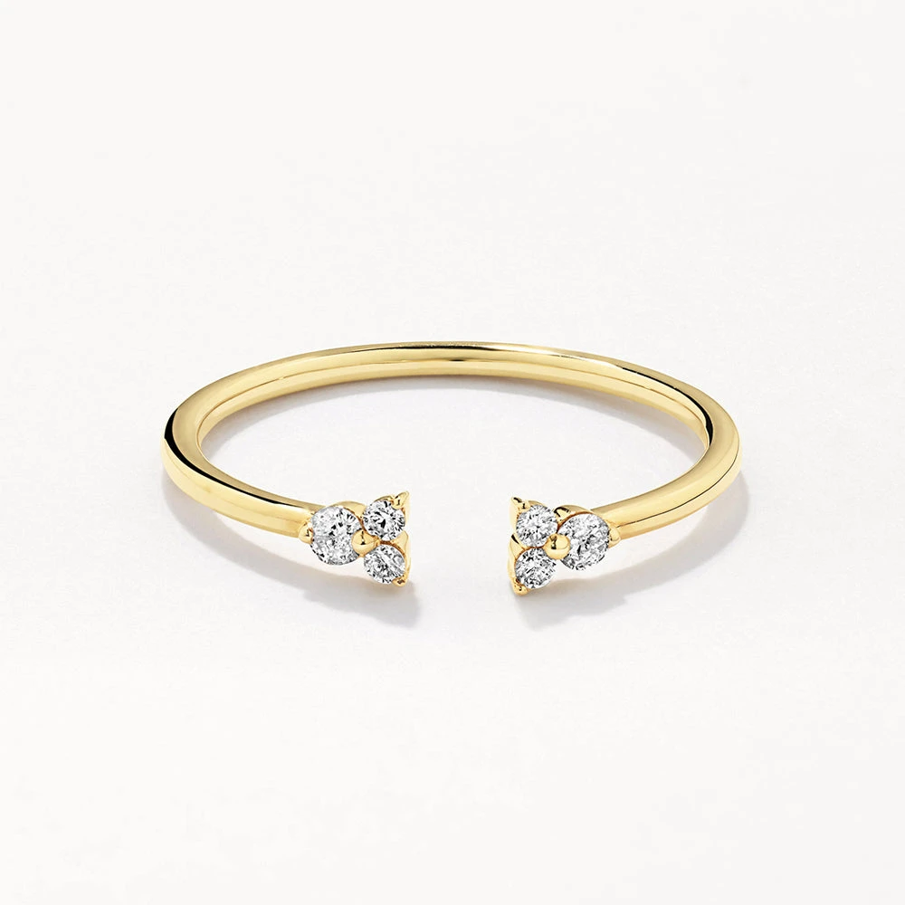 A petite diamond cluster ring to subtly elevate every look. This stacker ring features a total of 6 natural, round brilliant cut diamonds, set into two dainty clusters. Crafted in 10k gold, this open diamond ring is available in 5 sizes, so you can find your perfect fit. Wear it alone for quiet luxury, or stack it with gold and diamond rings.