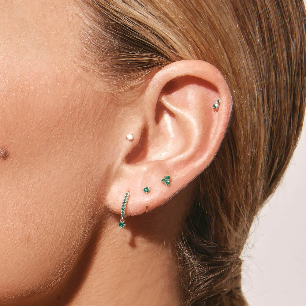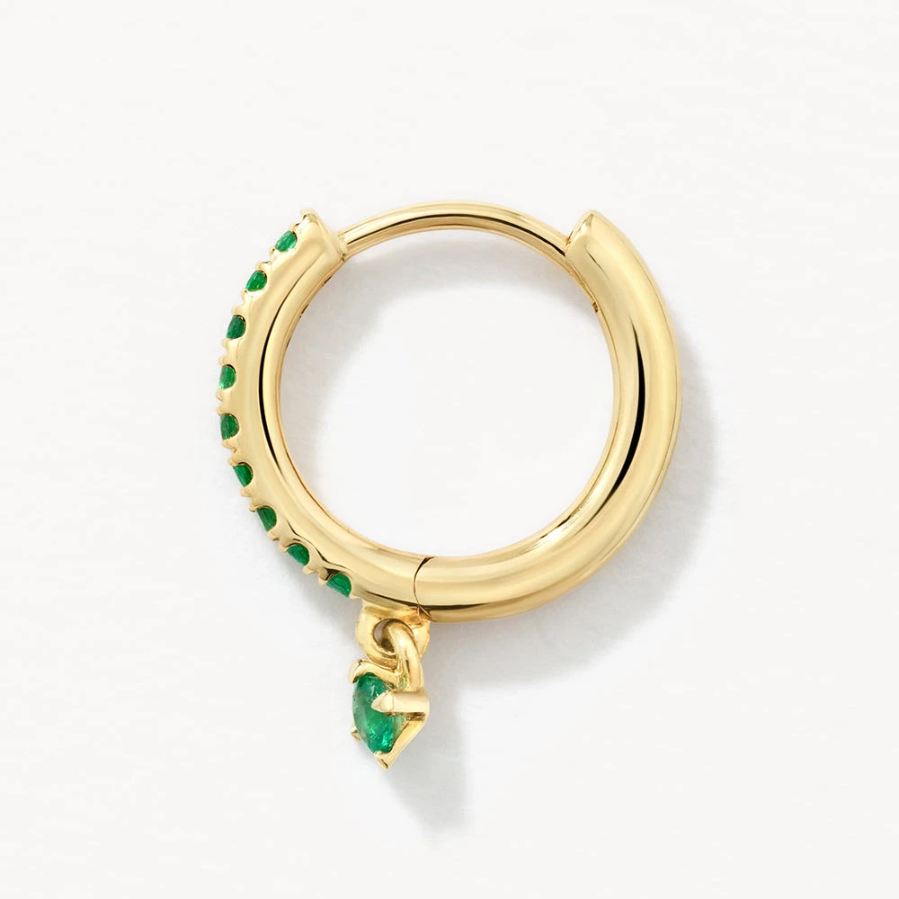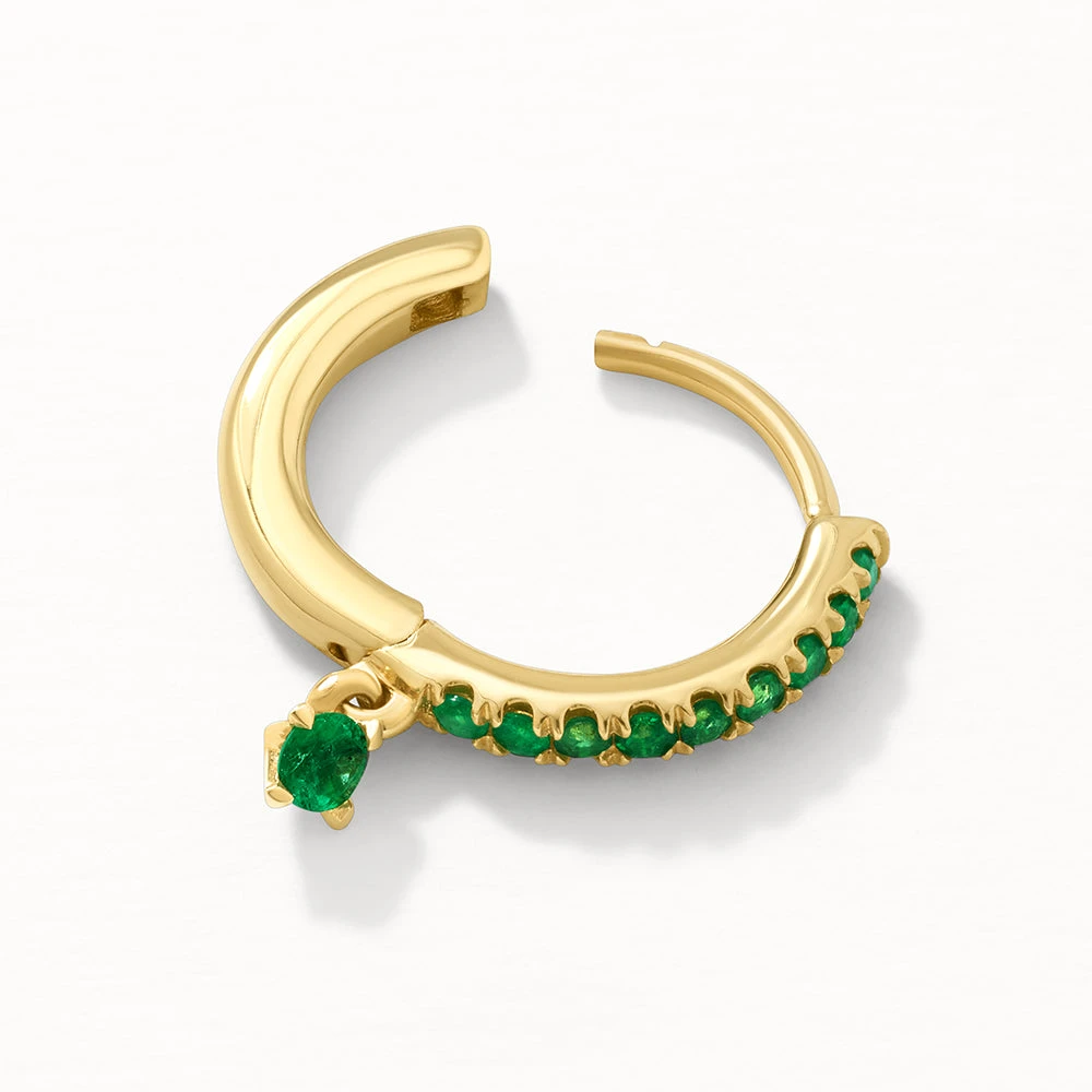 Elevate your curated ear look with this unique yet timeless, single emerald huggie. Combining a huggie and a drop earring, this cartilage piercing style features a petite, swinging emerald pendant to add movement to your look. Featuring natural emeralds in 10k solid gold, this single helix huggie will be your new wear-on-repeat favourite.
