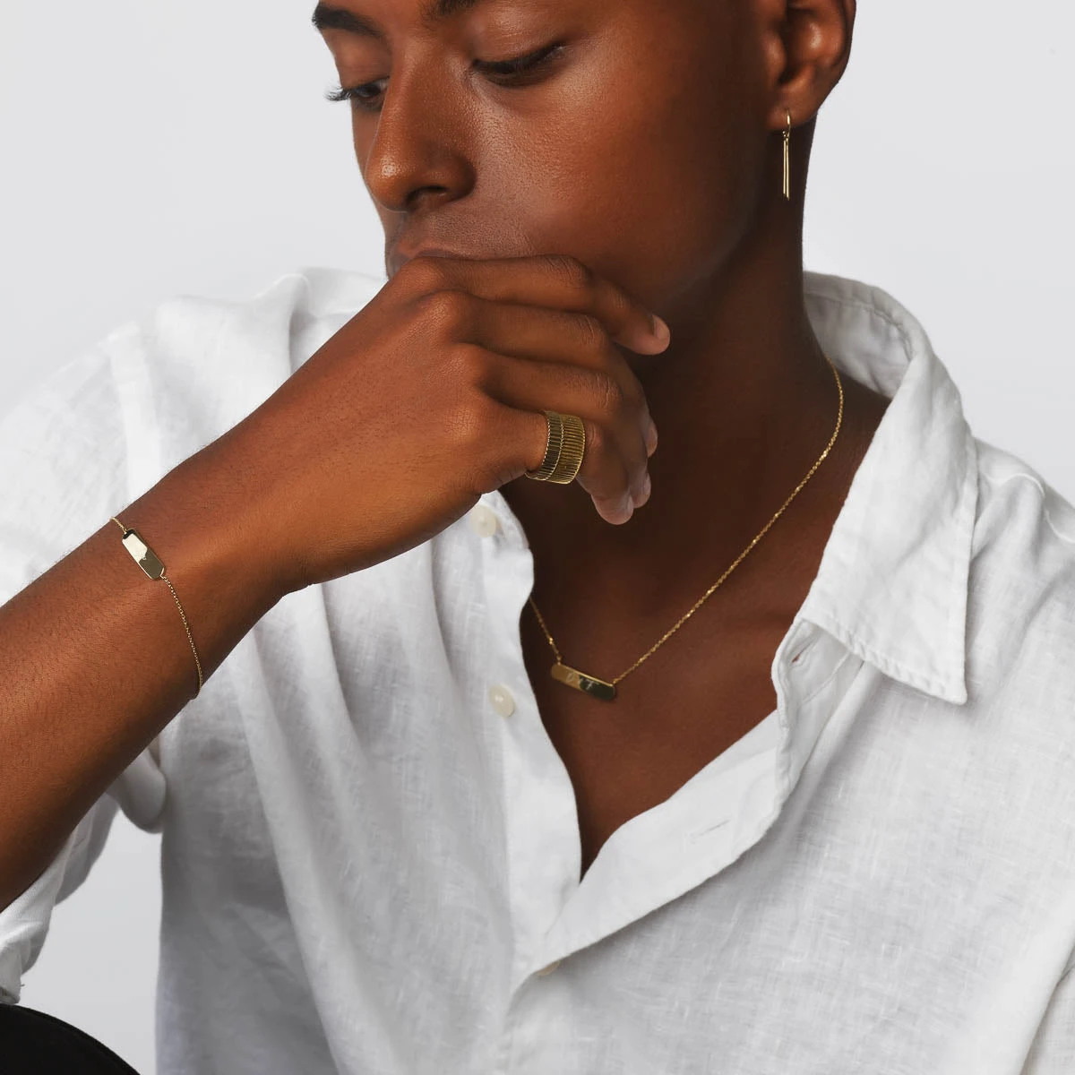 Simple and chic, this engravable gold bar bracelet is a must-have for your personalised jewellery look. Our bar style allows for a few letters, short name or nickname (up to 4 characters) to be engraved, so you can make it truly meaningful with our complimentary engraving service. Crafted in 18k fine yellow gold plating with a 19cm bracelet length, wear this gold bar bracelet alone for a refined look or layer with extra chain bracelets and a diamond tennis bracelet for statement, trending style. Keep it polished and pair this bracelet back with our Engravable Horizontal Bar Necklace in Gold.