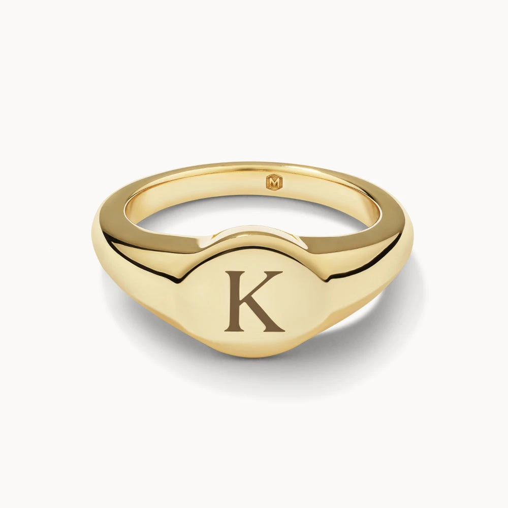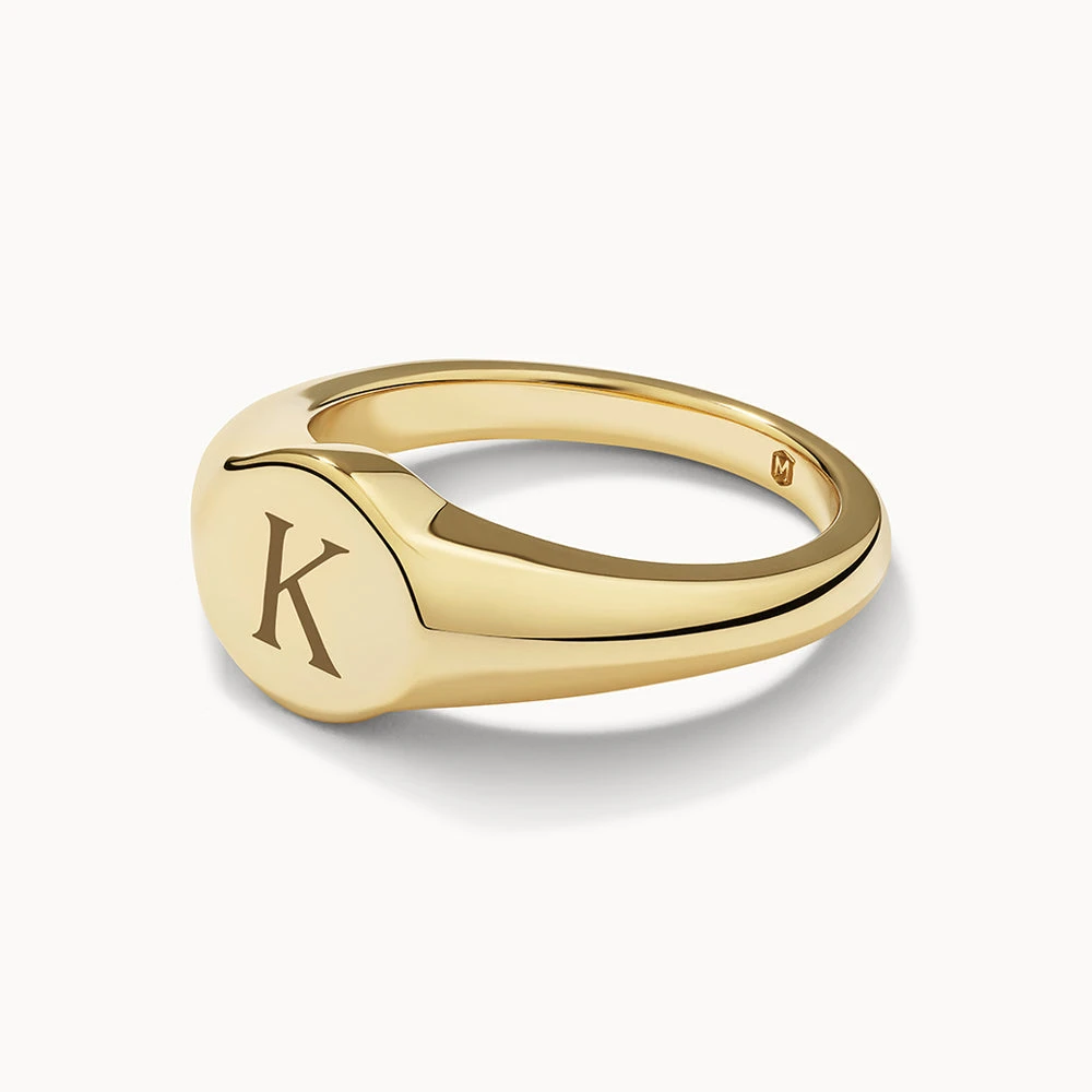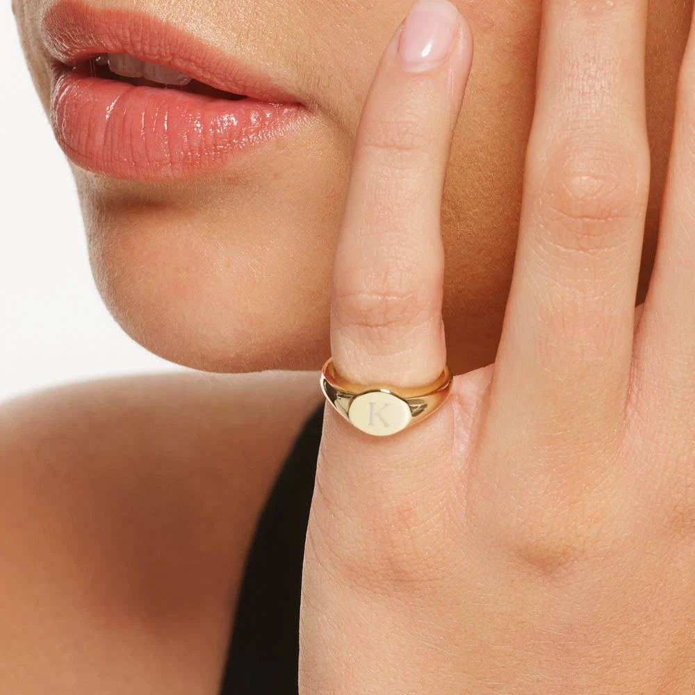 A signet ring is a jewellery wardrobe must-have, and this gold statement engravable ring is the perfect way to embrace the look like you mean it. Personalise this bold circle ring with our complimentary engraving service, then wear it on whichever digit you prefer – including as a pinky ring. Crafted in 18k gold plated sterling silver. Available in five sizes.