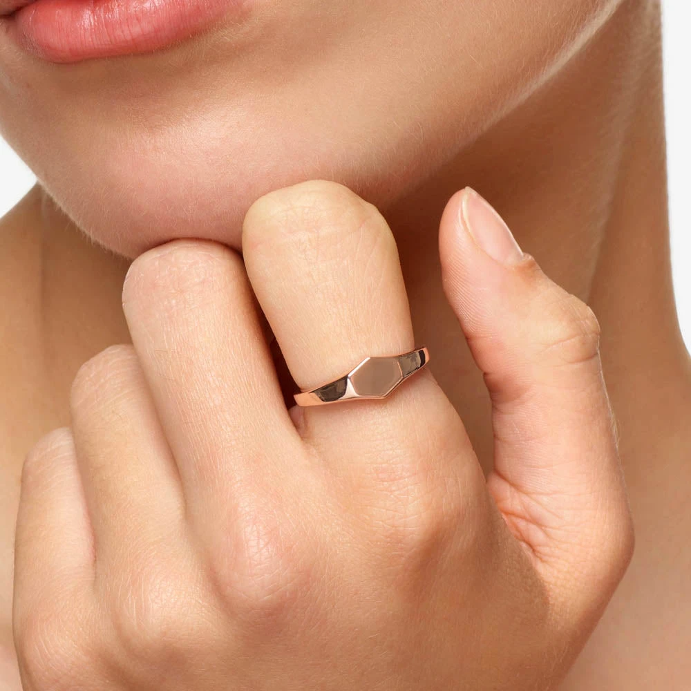 Add impact to your stack with our rose gold hexagon signet ring. Keep it simple and wear alone, or stack it with your rose gold ring stack. This much-loved chunky signet ring design is now available in additional, smaller sizes to fit your pinky finger, and can also be personalised with complimentary engraving so you can stack up a jewellery look on every digit.