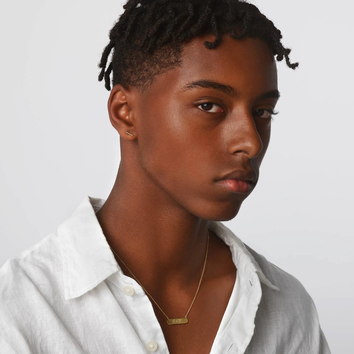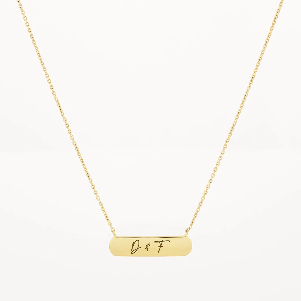 Simple and chic, this engravable bar necklace is a must-have for your personalised jewellery look. With a modern bar pendant that allows for a few letters, short name or nickname (up to 4 characters) to be engraved, you can wear this bar necklace alone for a refined look or layer it with additional engraved necklaces to build out your personalised engravable jewellery look. Crafted in 18k fine yellow gold plating, our horizontal bar necklace features a 45cm chain and our complimentary engraving service. Pair it back with our engravable bar bracelet in gold.