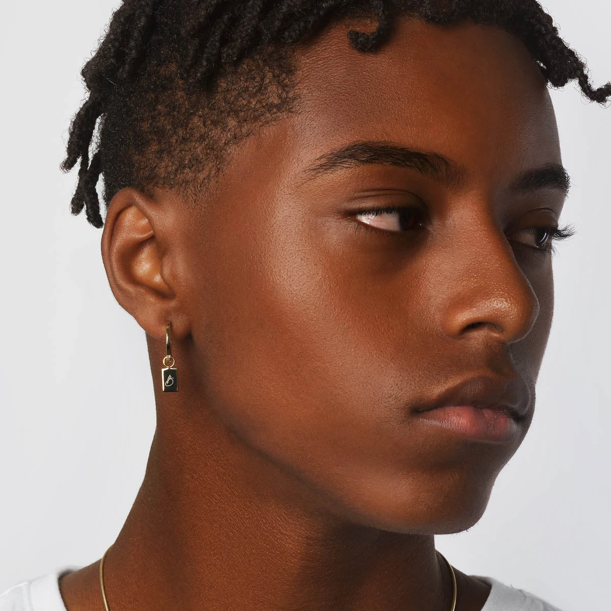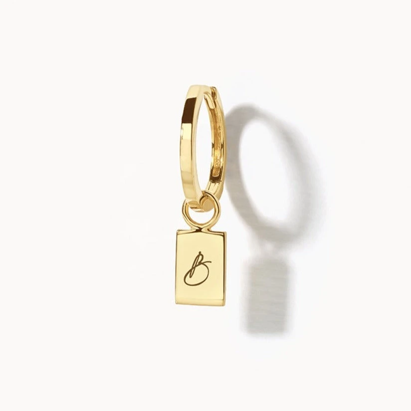 Elevate and personalise your curated ear look with our range of must-have earring charms. This dainty rectangular charm is crafted in precious 10k gold and can be customised with an engraving add your initial or that of a loved one for a meaningful touch. Designed to wear on a huggie or sleeper earring, it drops to add movement to your look and catch the light.