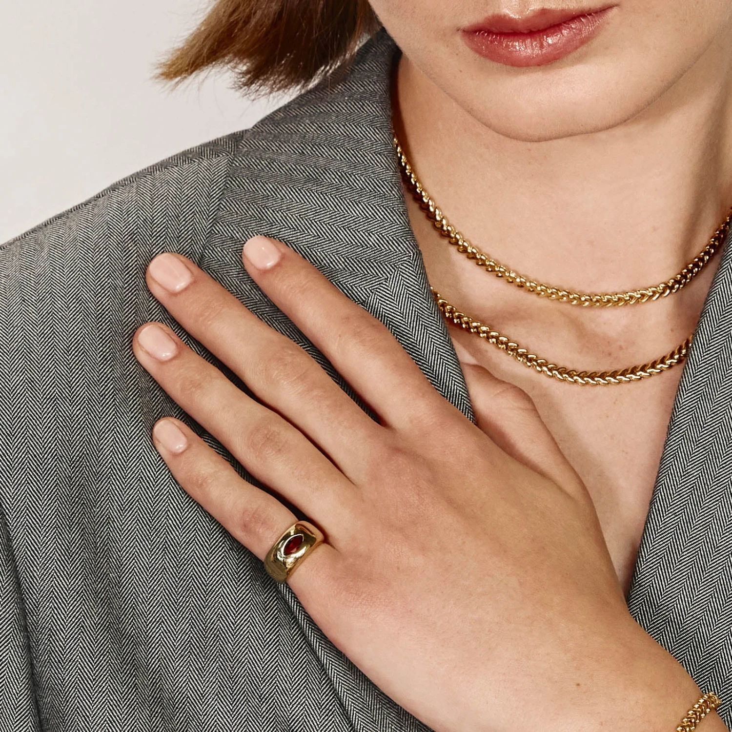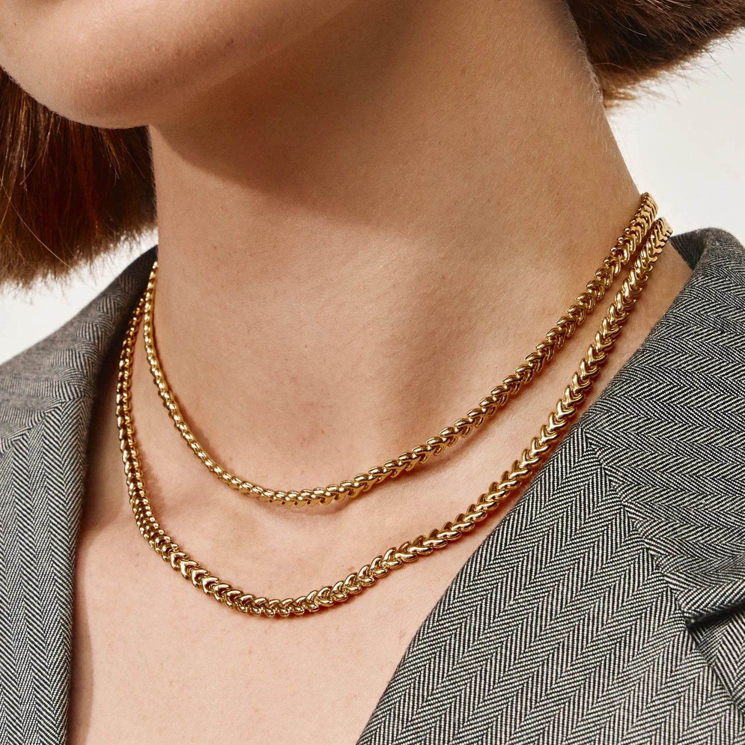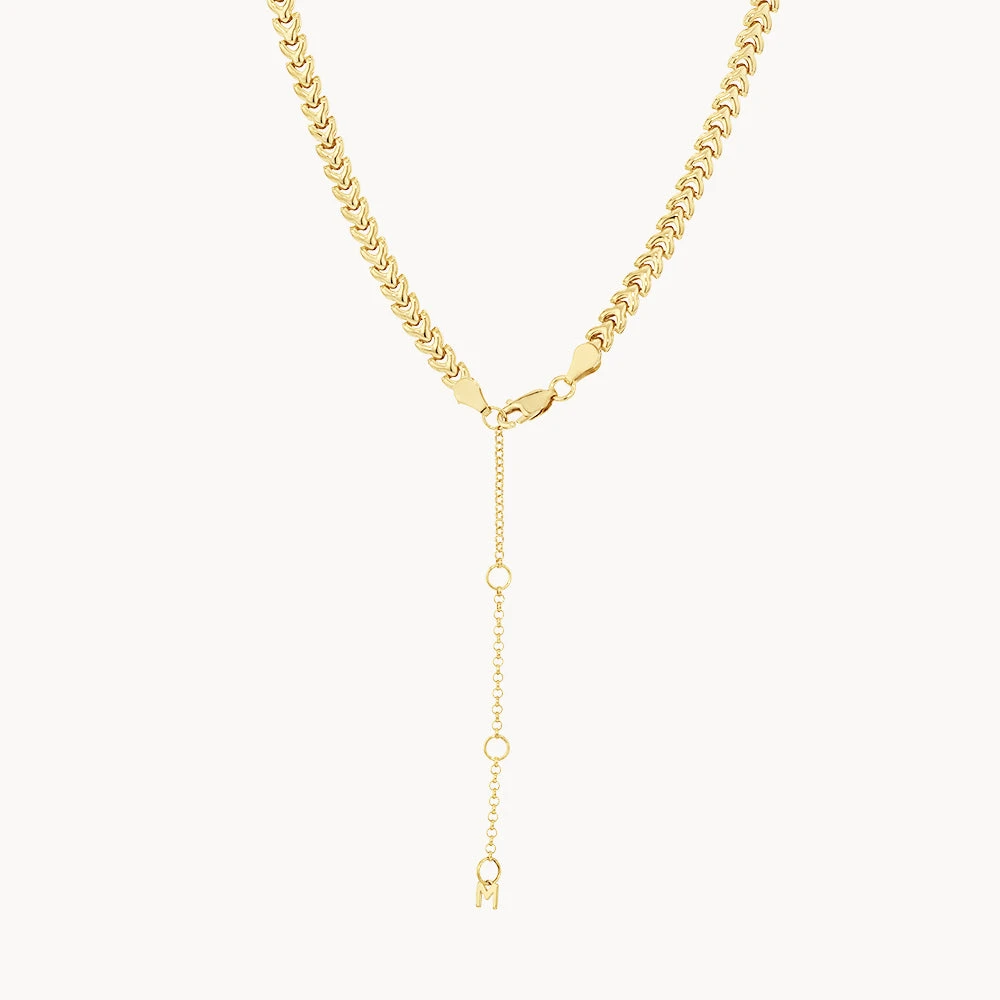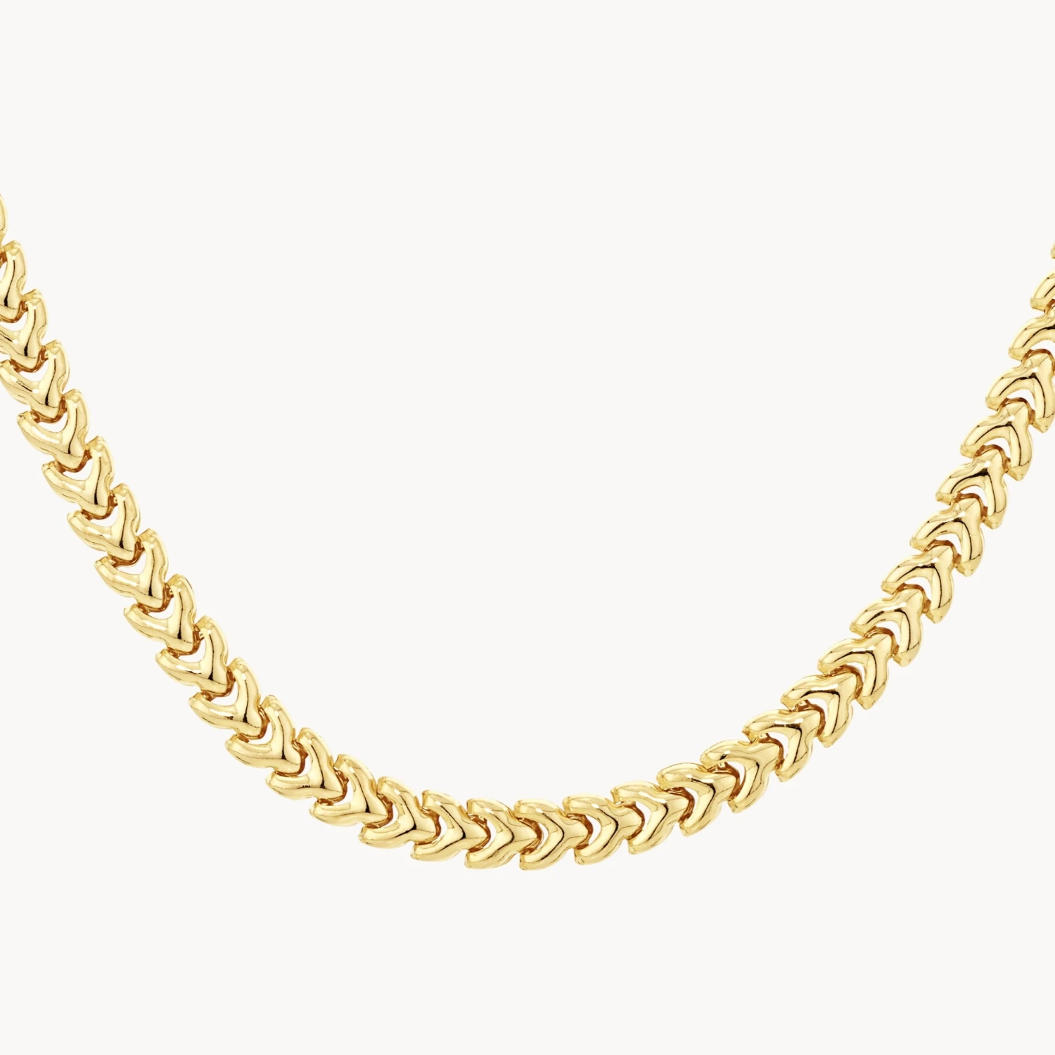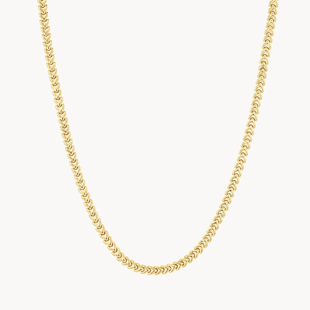 Introduce a chic new texture to your collection with our fishtail chain necklace. This gold plated necklace features a fishbone-style link design, creating unique dimension and depth. The perfect statement necklace to wear alone or layer, it features a 45cm length and is crafted in 18k gold plating. Pair it back with the fishtail chain bracelet for a matching look.