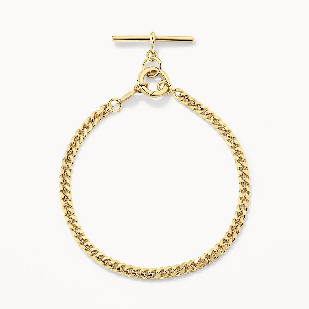 Every collection needs a classic, gold chain bracelet. We didn’t make the rules, we’re just here to tell you it’s non-negotiable. Luckily, this fob chain bracelet crafted in 18k fine gold plating is the perfect, timeless piece. Featuring a 19cm length, the curb chain is finished with a T bar fob closure. Pair it back with our fob curb chain necklace in gold for a sleek, matched look.