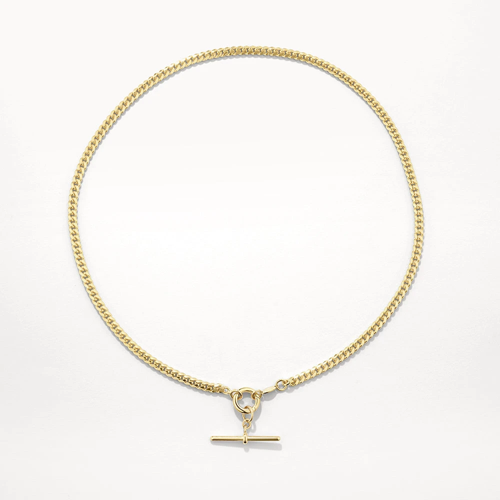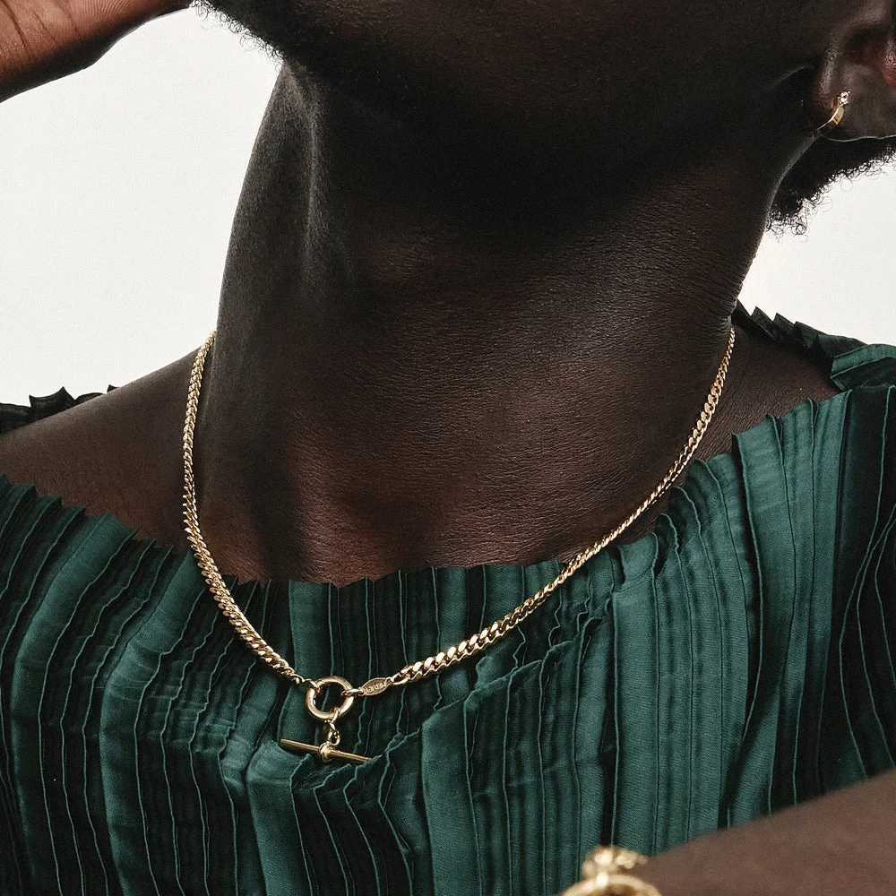 Every collection needs a classic, bold gold chain necklace. We didn’t make the rules, we’re just here to tell you it’s non-negotiable. Luckily, this fob chain necklace is the perfect, timeless piece. Featuring a 45cm curb chain and finished with a T bar fob closure, it’s crafted in 18k fine gold plating. Wear it with literally anything, though we recommend our fob curb chain bracelet in gold for that pulled-together look.