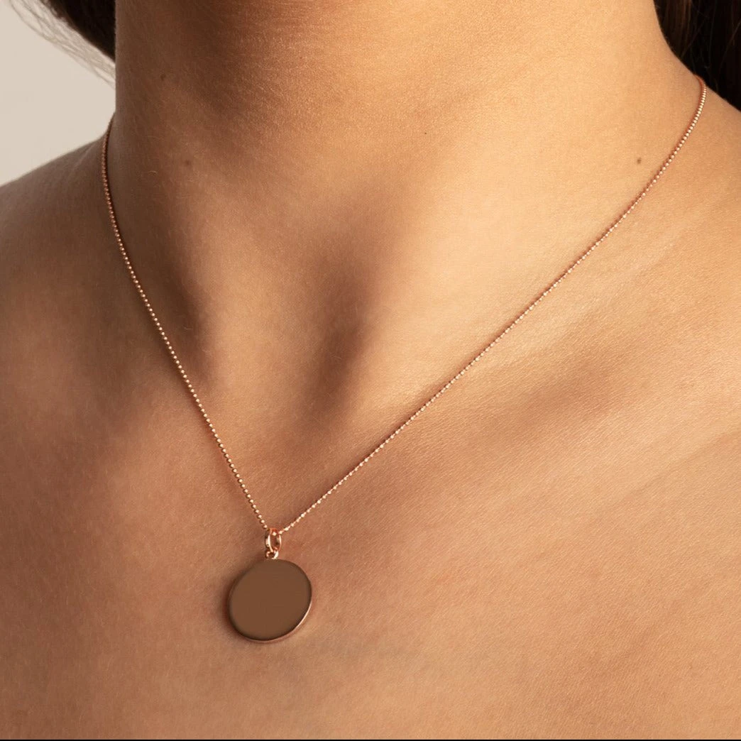 Whether you are looking for a rose gold pendant to add to your favourite chain, or to gift a personalised jewellery gift. There’s something classic about a simple circle pendant. Channel a timeless look with the engravable Full Moon pendant in 18k fine rose gold plating. This complimentary engraved circle pendant is a timeless jewellery staple for every occasion. Pair this pendant with the twizzle chain. Also available in gold and silver.
