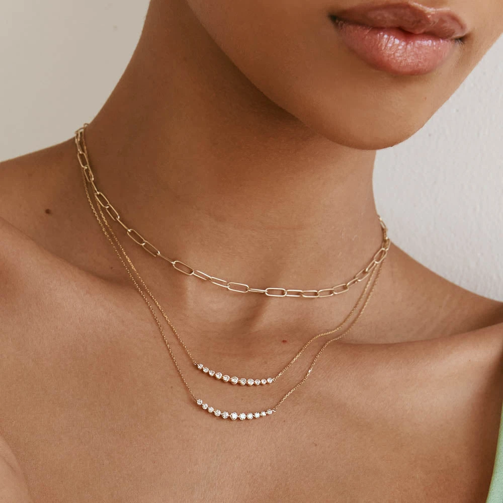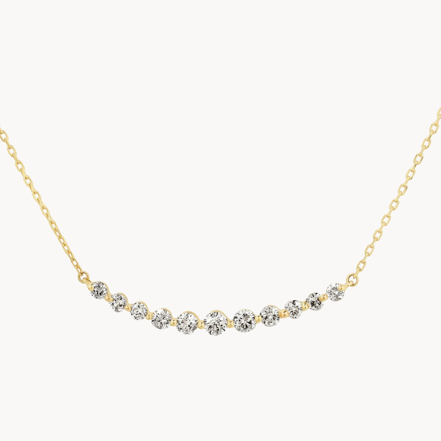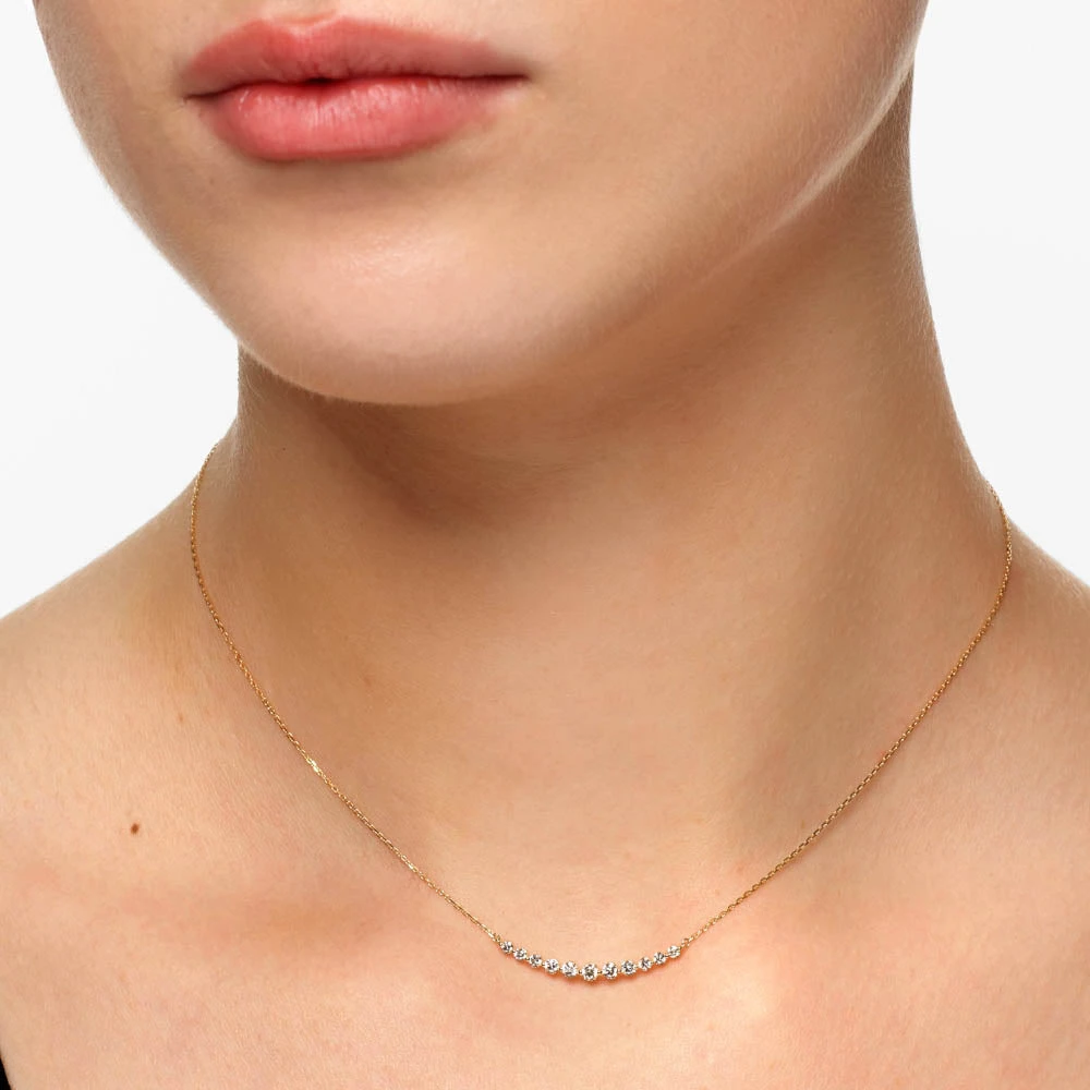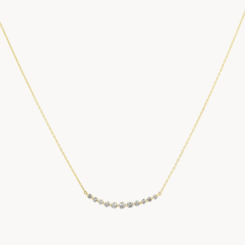When you’re ready to graduate to diamonds, this fine diamond bar necklace is the perfect piece. Timeless with its 5cm row of round brilliant diamonds and fine, 10k gold chain, it has a unique element with its graduated stone sizes. Featuring 11 natural diamonds, this necklace has the perfect amount of subtle brilliance to wear on its own, or to layer with your favourite gold chains.