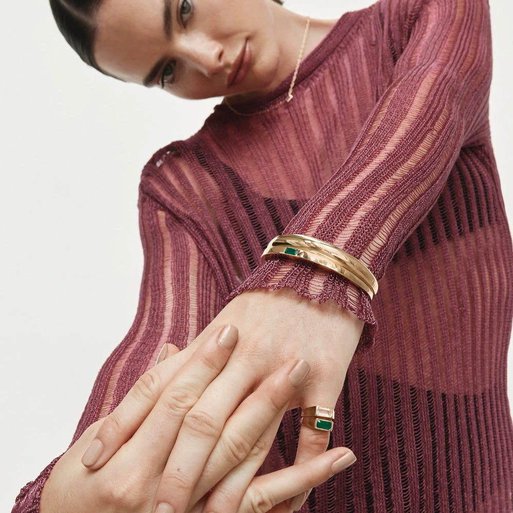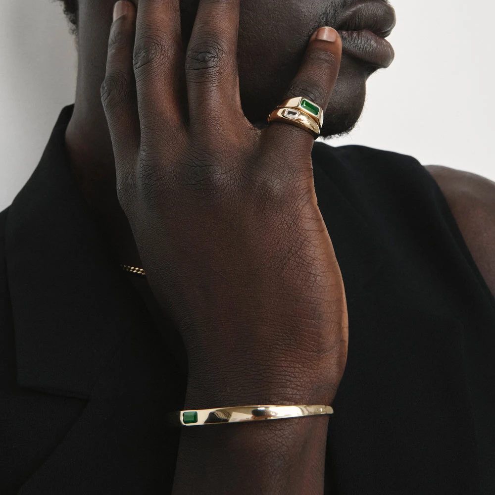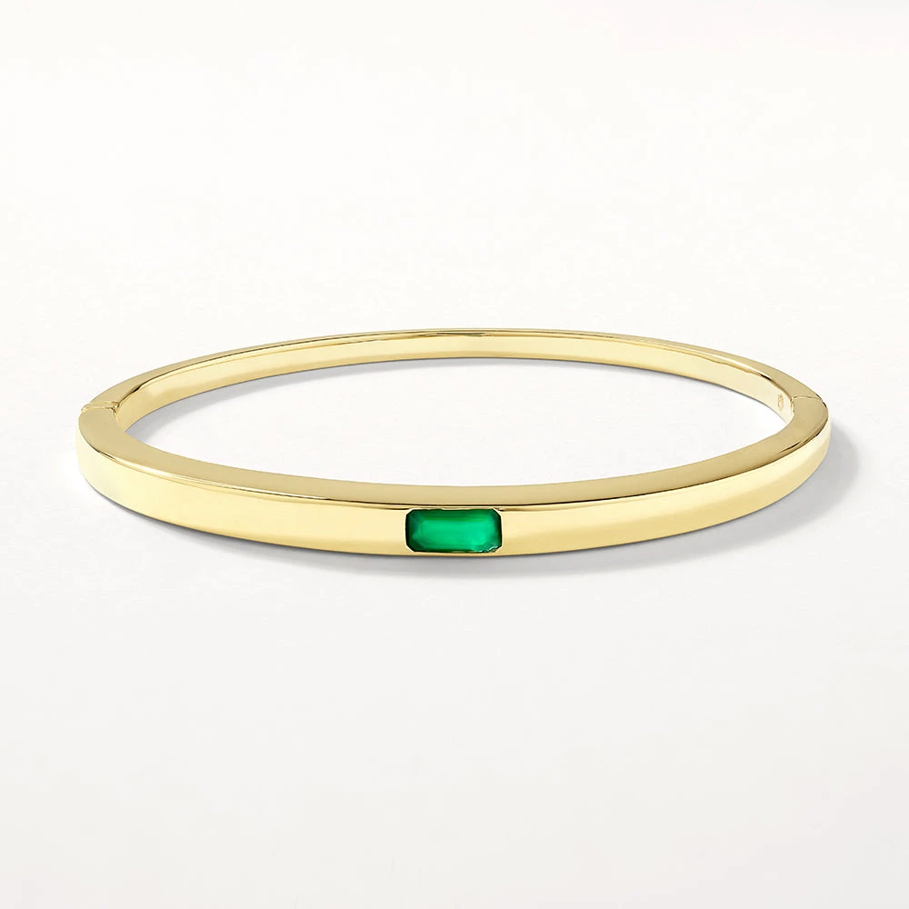 Our bold, square shape bangle is the ultimate contemporary piece. Featuring a sleek, plain gold bangle design with a minimalist pop of colour via an emerald cut, natural green agate. Crafted in 18k fine gold plating, wear our green agate bangle alone for chic simplicity or stack it with gold chain bracelets for a statement look.