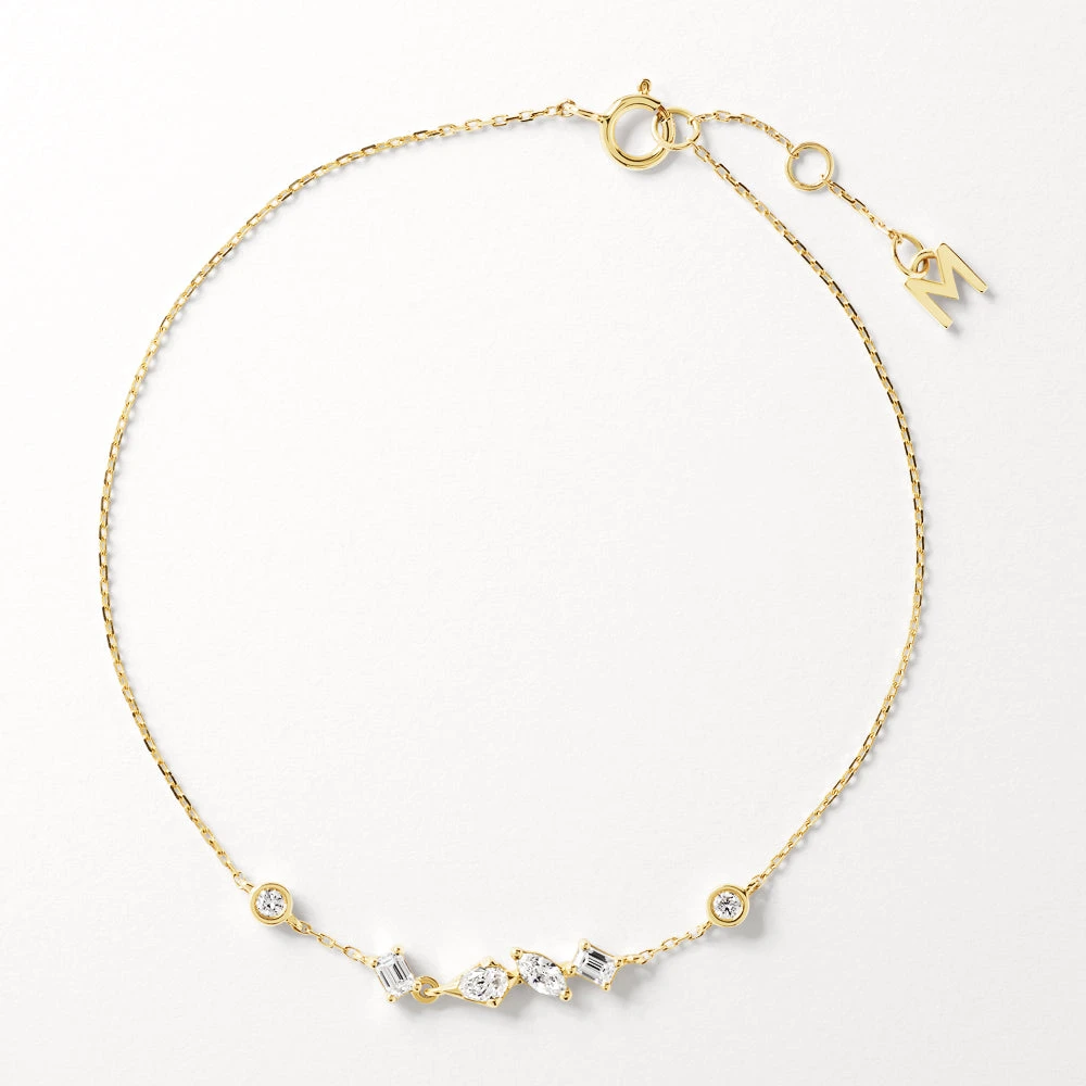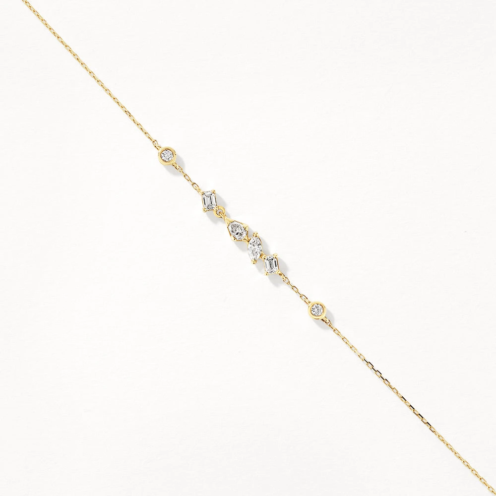 A delicate, intricately designed piece to brighten every look. This laboratory-grown diamond gold bracelet features a mix of round brilliant and fancy kite stones, set at different angles for a contemporary free-form vibe. With 0.28 carat total weight of laboratory-grown diamonds set in a fine 10k gold bracelet, this piece is adjustable from 17cm to 19cm in length.