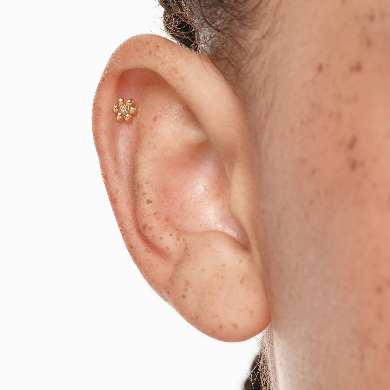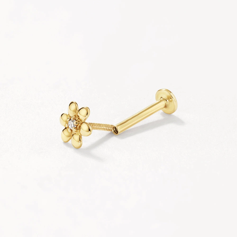 The cutest, modern flower earring to elevate your ear stack. This flatback stud is specially designed as a helix earring, and features a petite daisy motif with a natural diamond at its centre. Crafted in 10k gold, add it to every stack. Sold as a single earring, and available with a 8mm or 6.5mm post to suit your piercing.