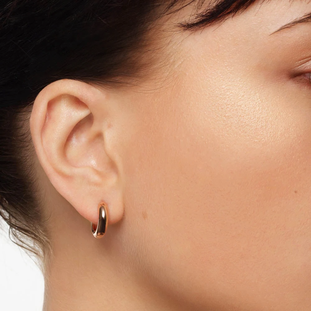 Everyday rose gold earrings. Simple as that. These cute 15mm curve hoops in a mini size are the perfect pair to pop on anytime and every time. Crafted in18k rose gold plating, work them into a polished ear stack with our midi curve hoops, or mix up an eclectic look alongside stud earrings and diamonds.