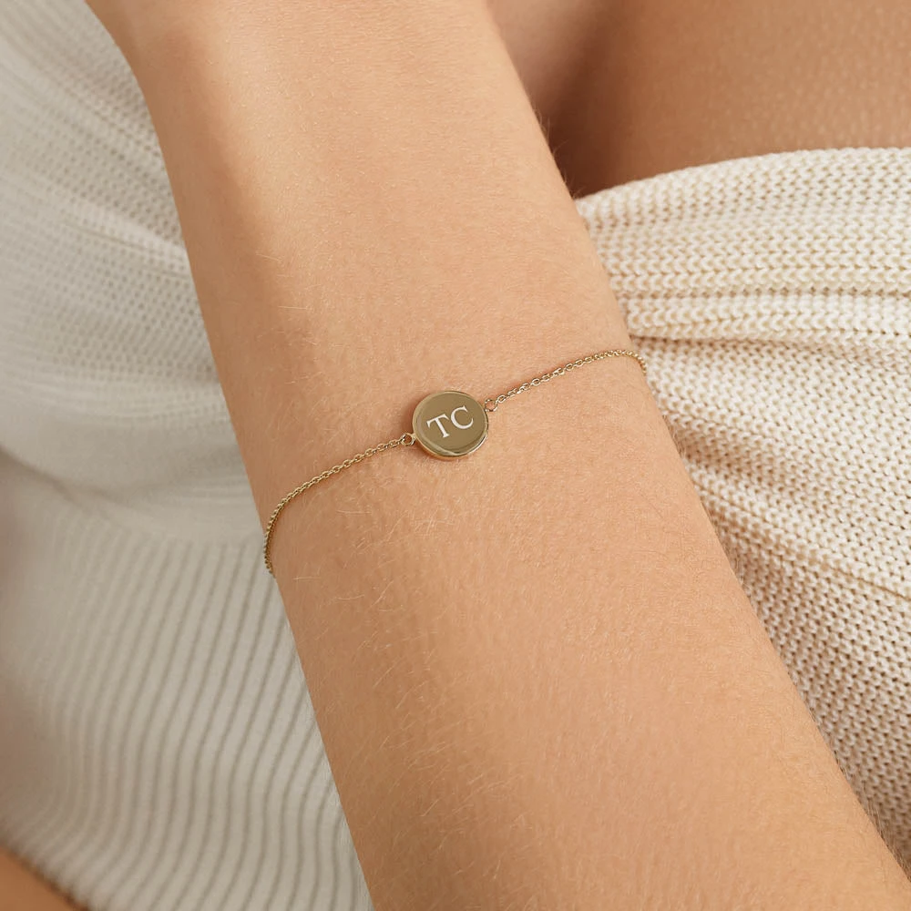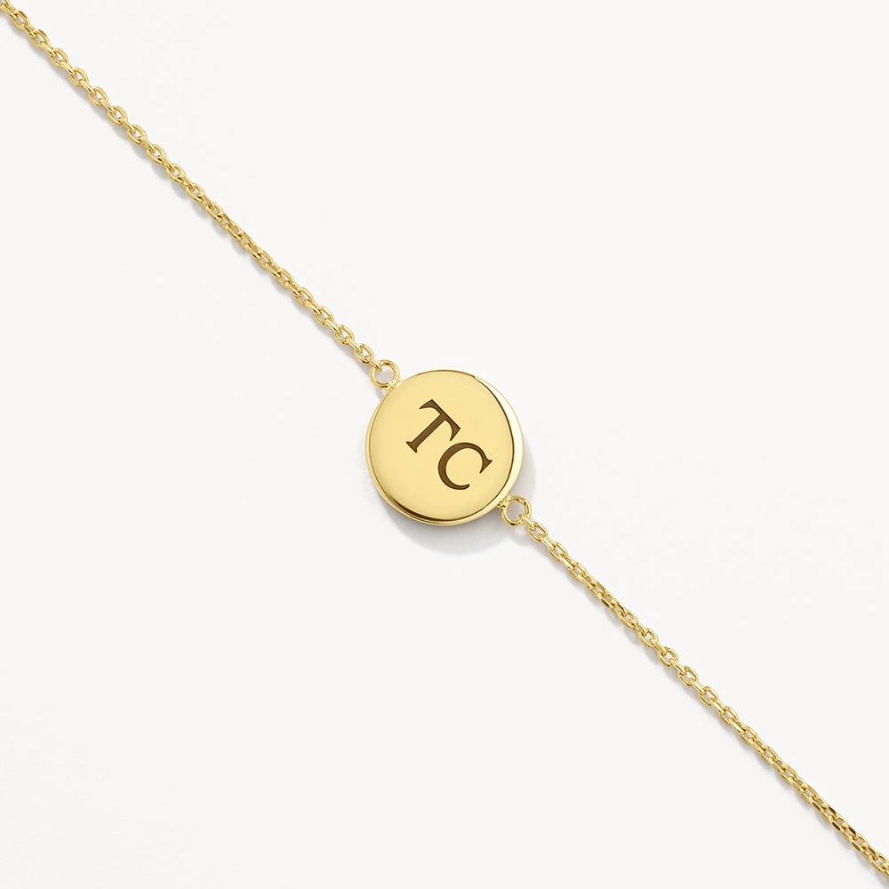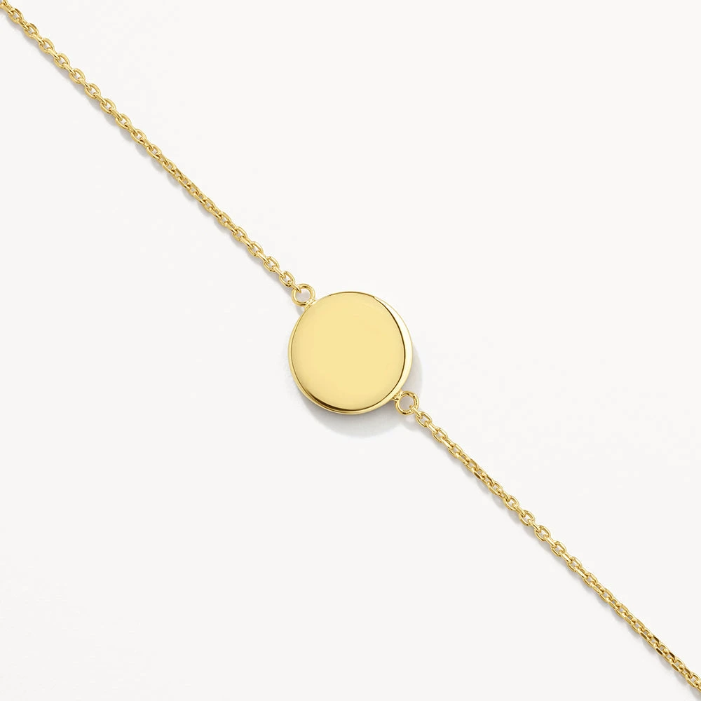 Personalise your wrist stack with our engravable gold circle bracelet. With a 19cm length, this fine chain bracelet features a minimalist engravable disc, which you can make your own with a complimentary engraving. Crafted in 18k fine gold plating over a sterling silver core, wear this engravable jewellery piece with our polished plain bangle for a curated wrist stack. Also available in silver.