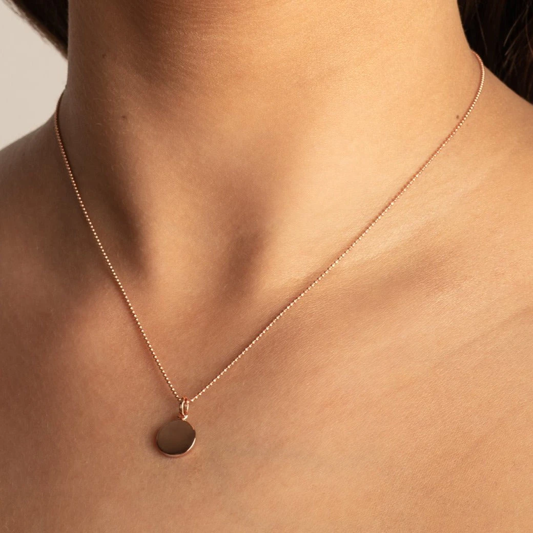 There’s something classic about a simple circle pendant. Channel a timeless look with the engravable mini full moon pendant in 18k fine rose gold plating. Whether you are looking for a rose gold pendant to add to your favourite chain, or to gift a personalised jewellery gift. This complimentary engraved circle pendant is a timeless jewellery staple for every occasion. Pair this pendant with the twizzle chain. Also available in gold and silver.