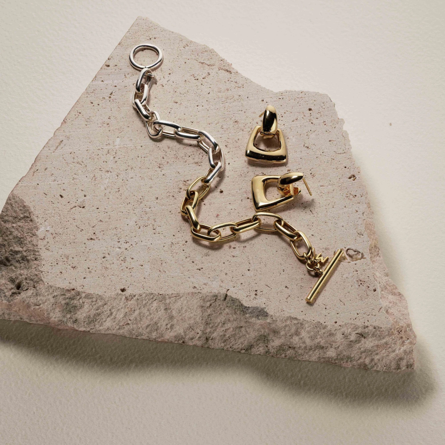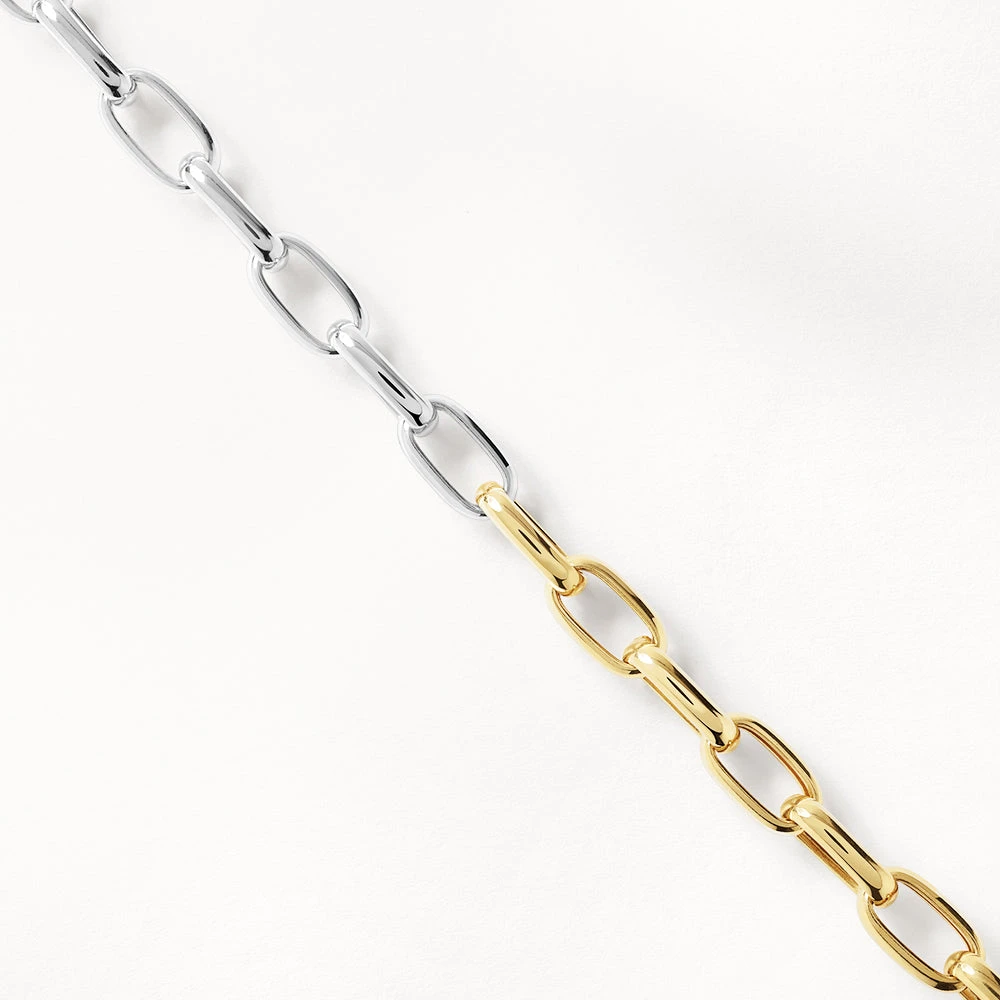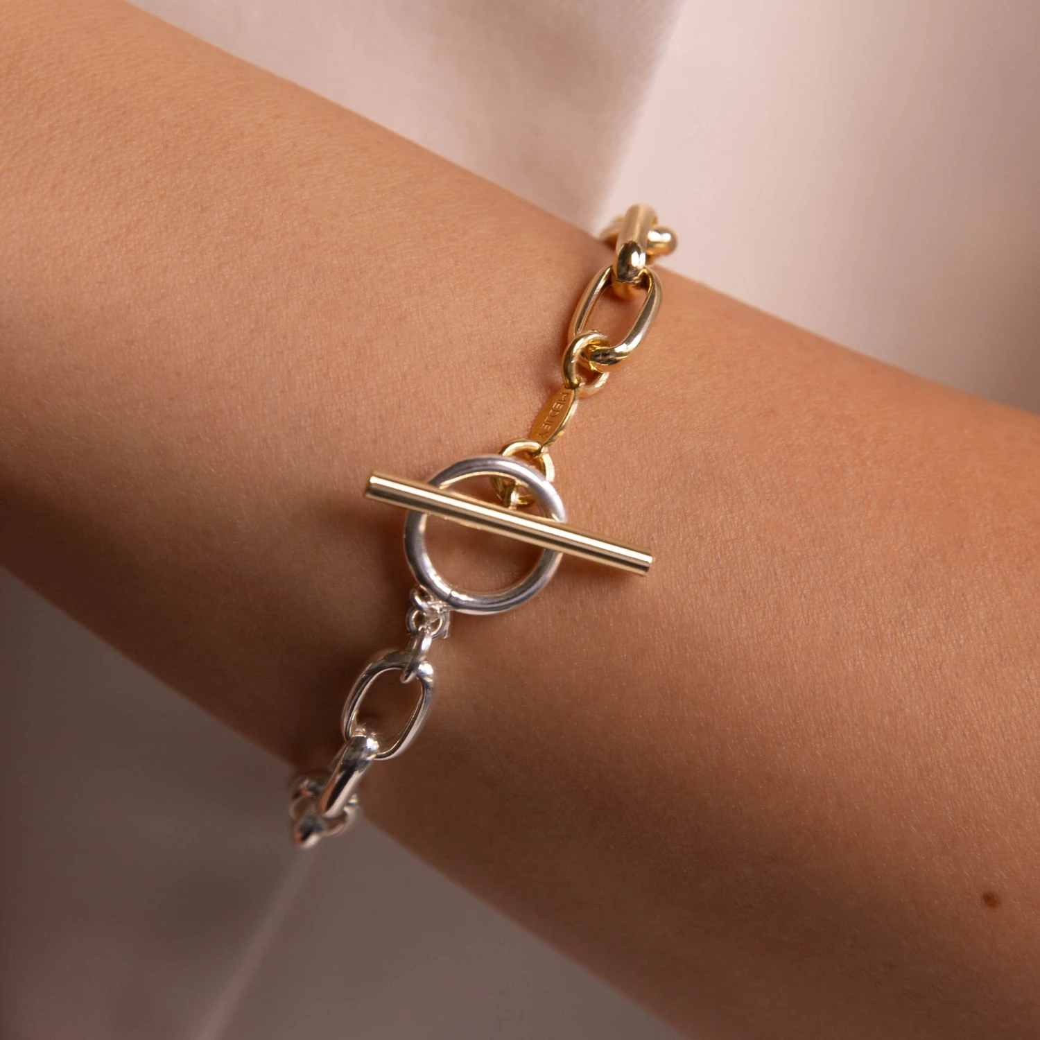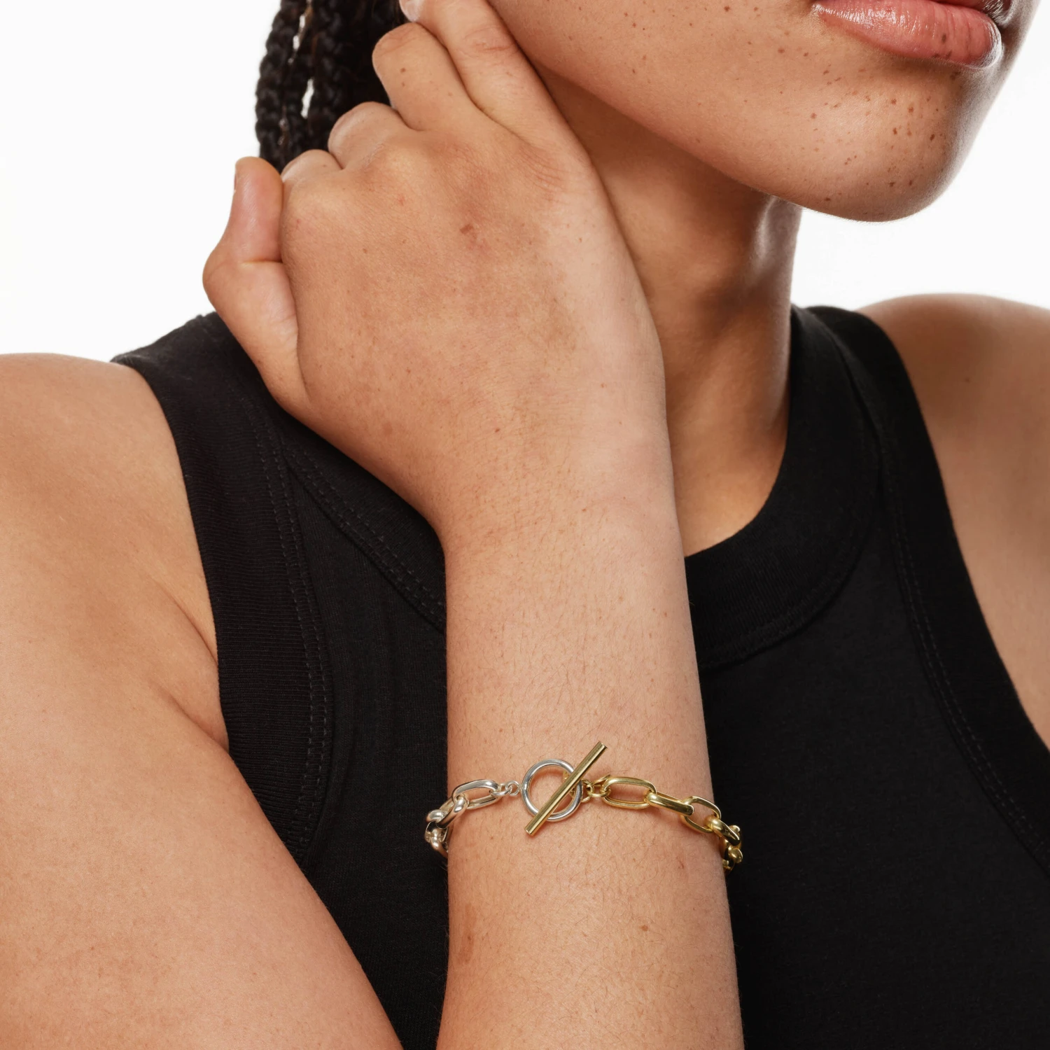 Embrace the modern mixed metal look with this two tone bracelet. With its half-and-half paperclip chain design crafted in 925 sterling silver and 18k gold plating, this silver and gold bracelet is finished with a classic t-bar fastening. Crafted with an 19cm length.