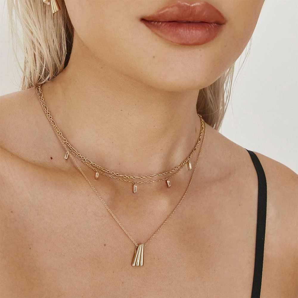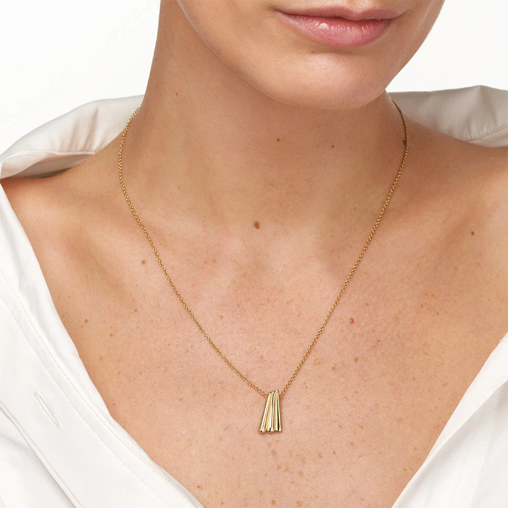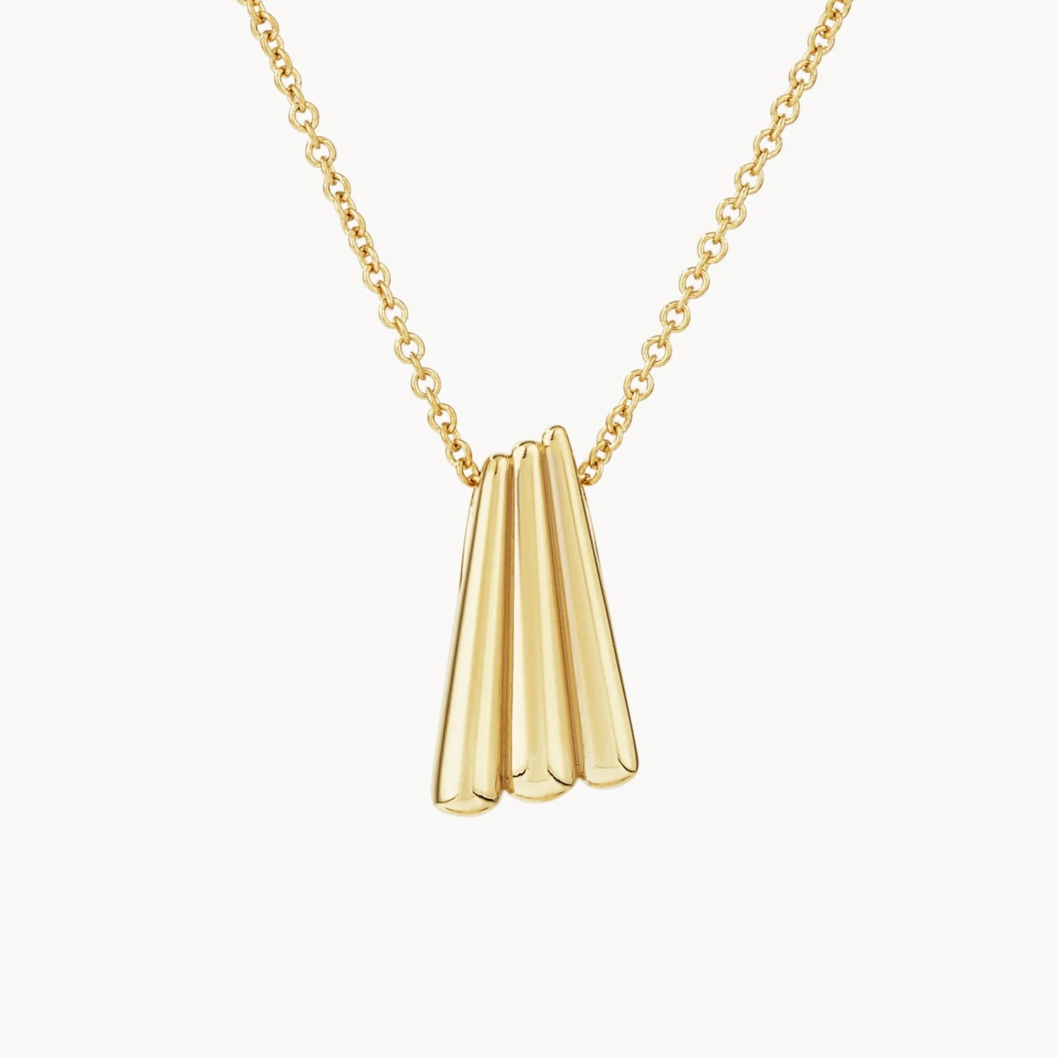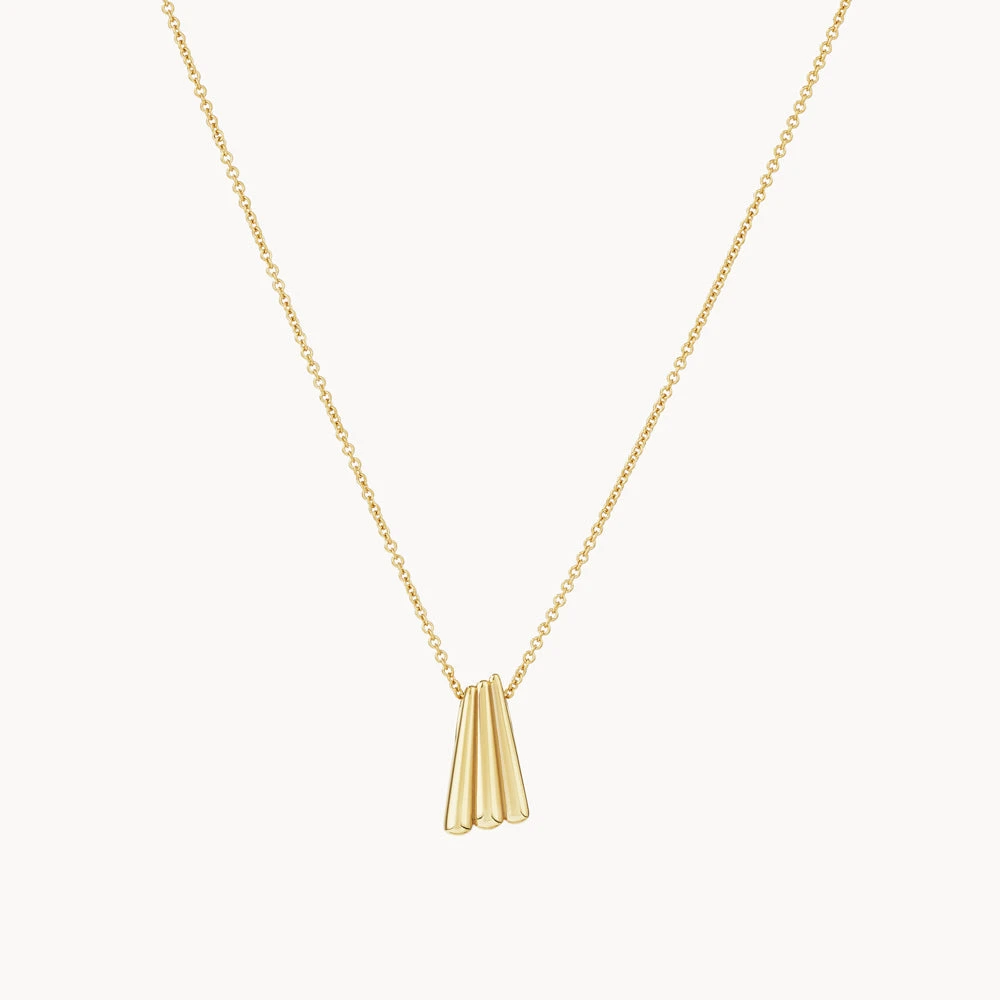 An embodiment of Art Deco design, this geometric fan pendant will bring a unique statement to your every look. With its ribbed jewellery design in lustrous 18k gold plating, this modern pendant necklace gives a nod to luxe vintage style.