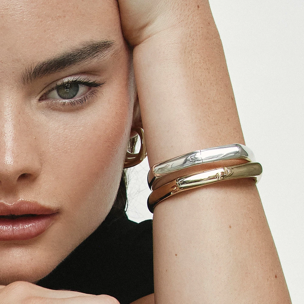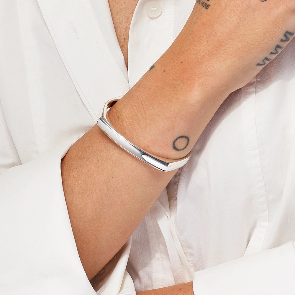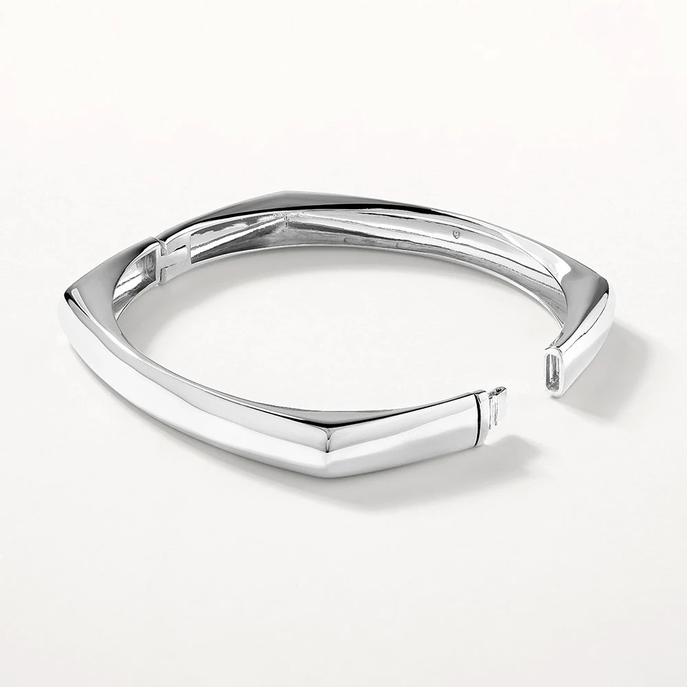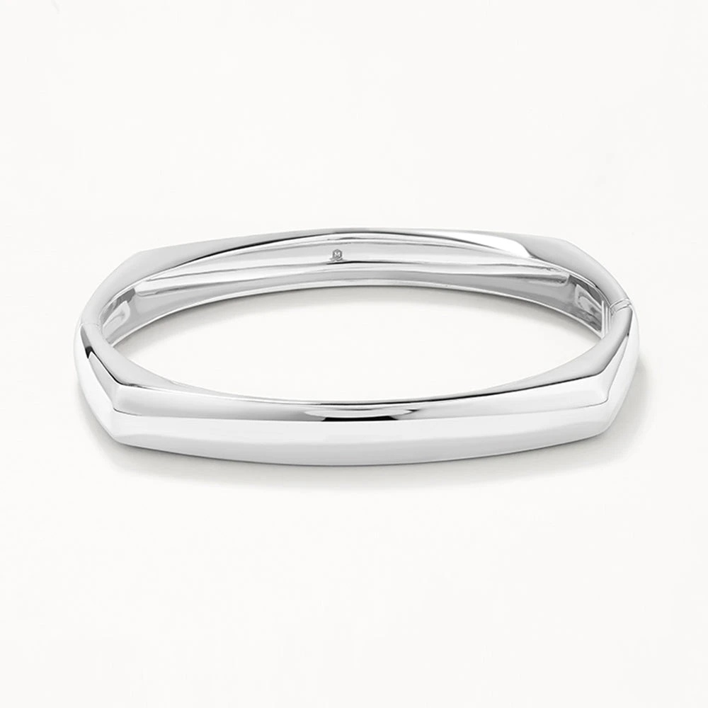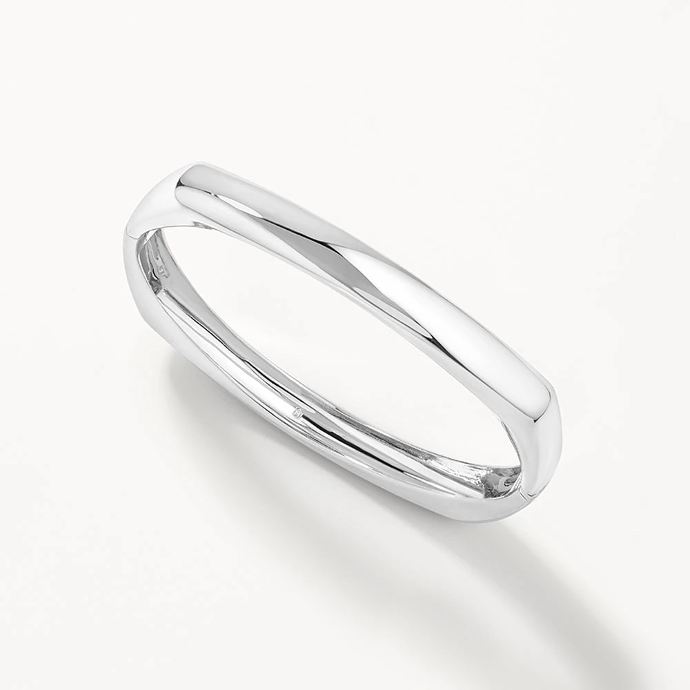 Refined elegance meets bold, retro glamour in our statement square silver bangle. Crafted in sleek 925 sterling silver, this square edge bangle is perfect to wear alone or to stack with round silver bangles and chain bracelets for an interesting mix of textures.