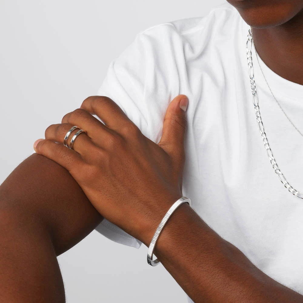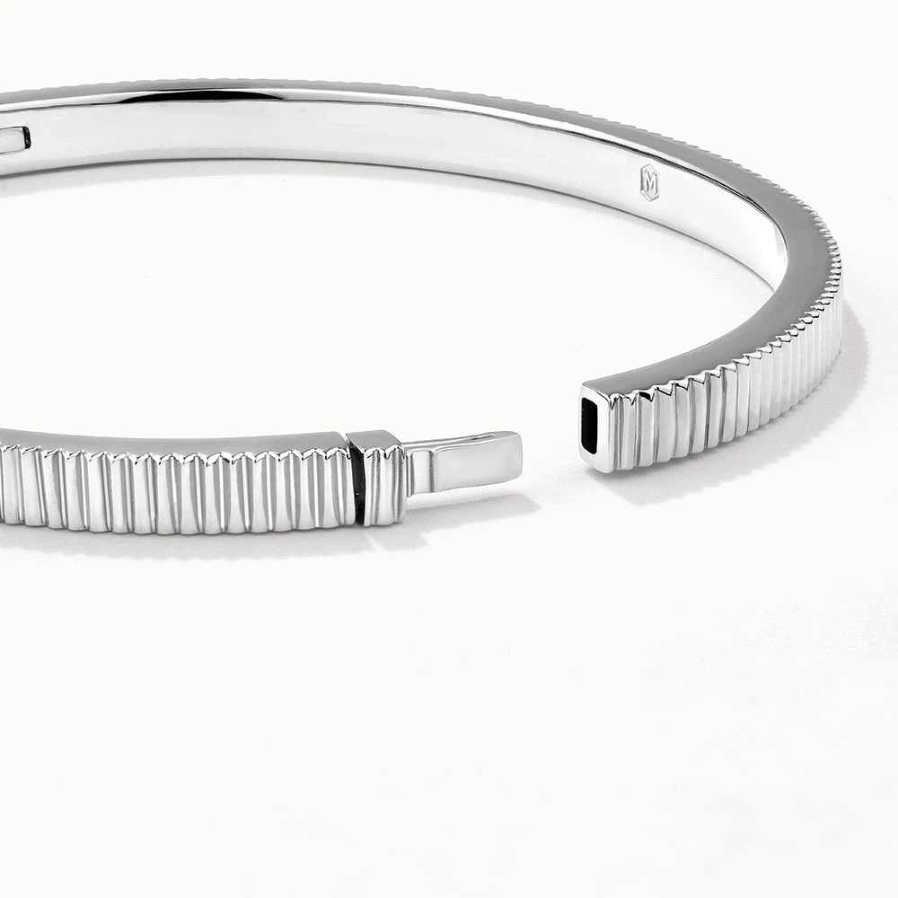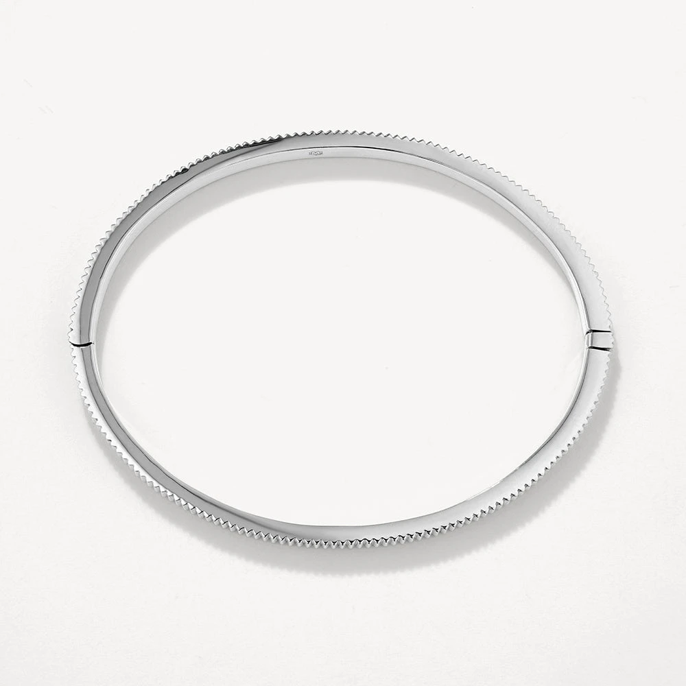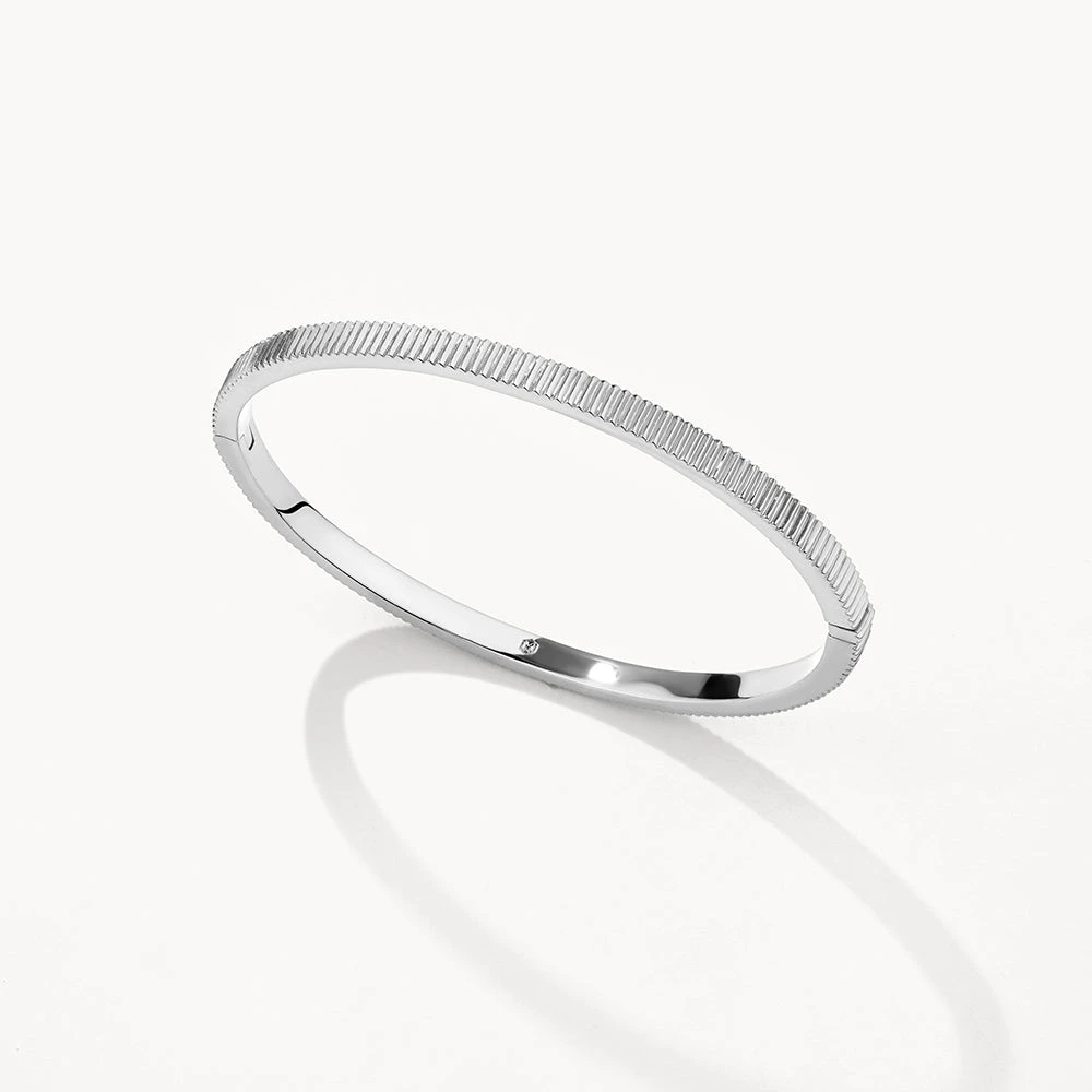 This ribbed 925 sterling silver bangle is the perfect statement jewellery piece to elevate your look, featuring a hidden clasp with a 65mm diameter. The textured bangle in silver is timeless and versatile, with a subtle geometric texture, wear it alone for a minimalist vibe or stack it up. Made in sterling silver, we love it pairing this thin silver bangle with a diamond tennis bracelet and a classic chain style such as our rope chain bracelet in silver.