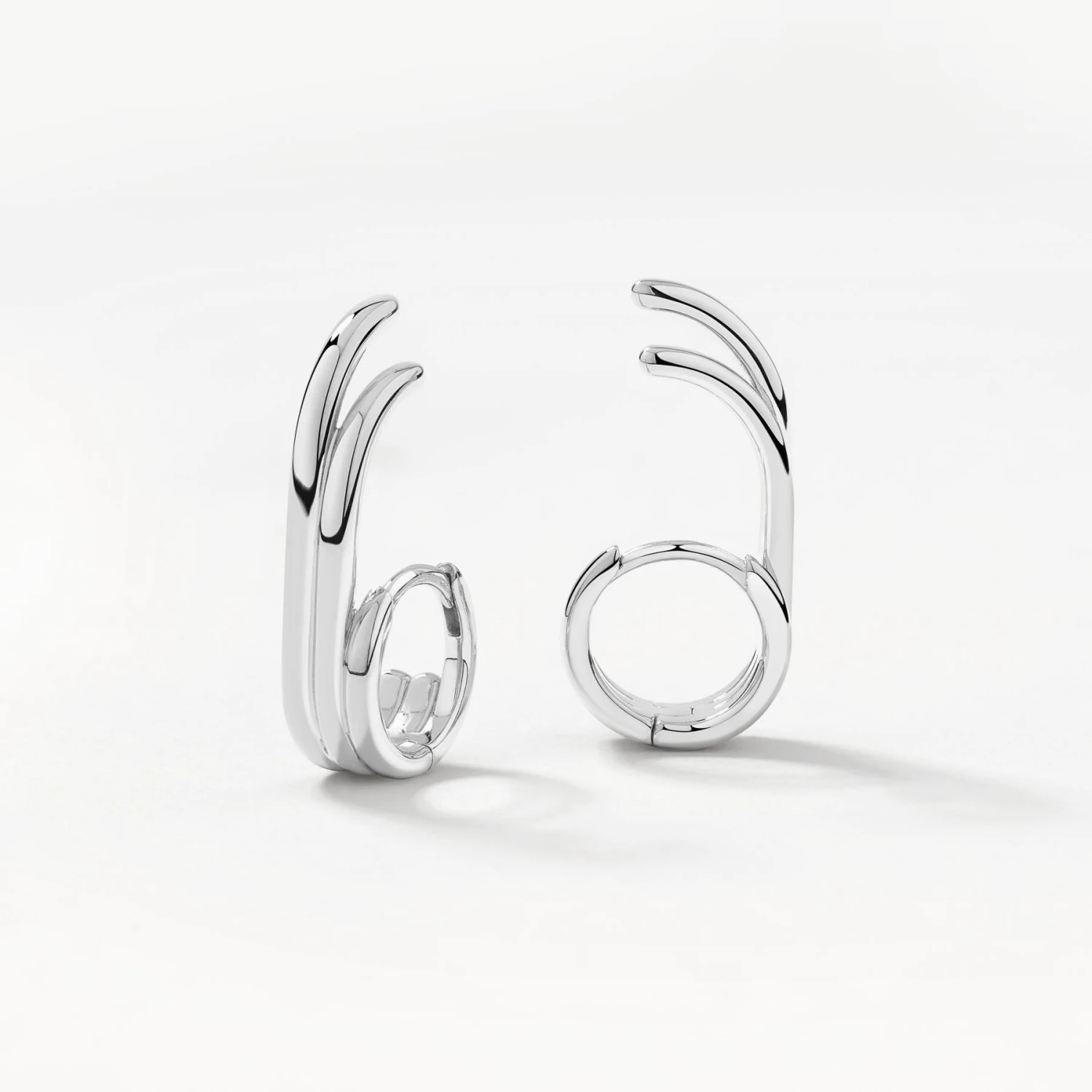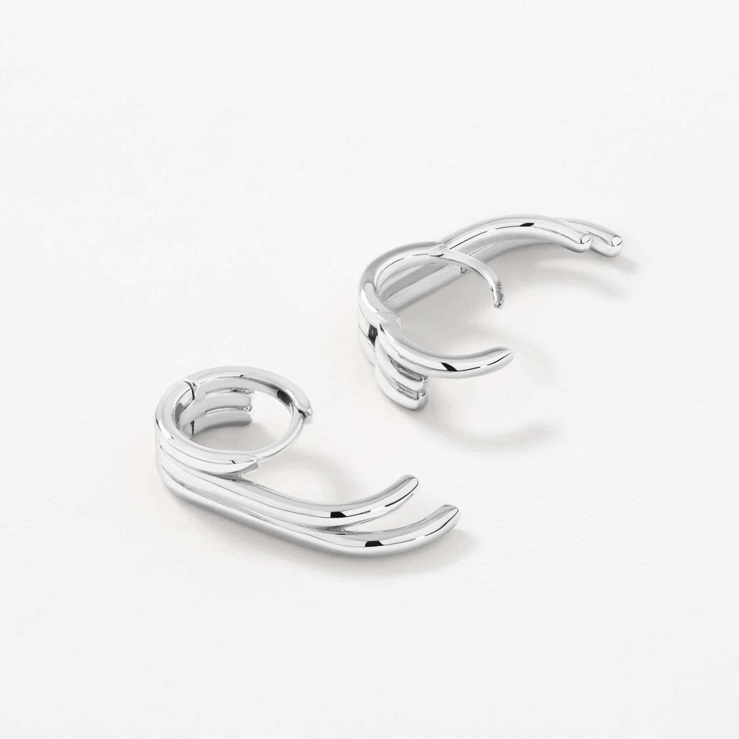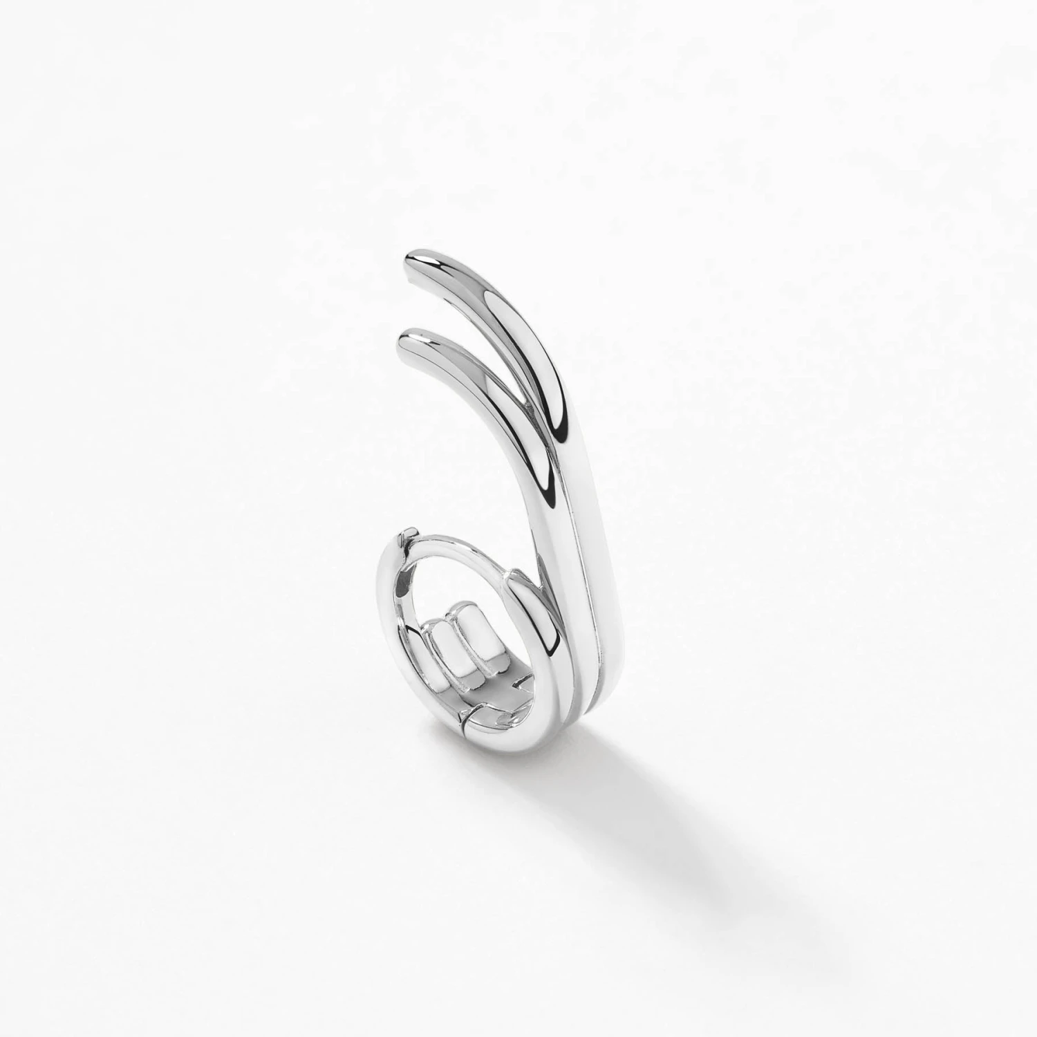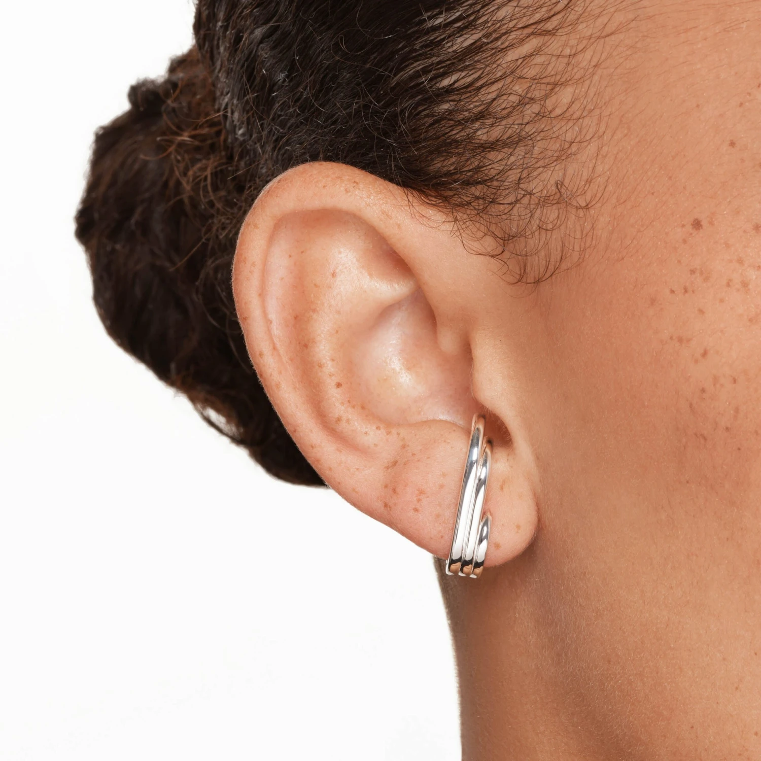 Add dimension and geometric texture to your ear party stack with this silver triple band earring. Its suspender huggie design features three layered lines and combines as a lobe cuff for statement edge and an instant stacked look in one piece.