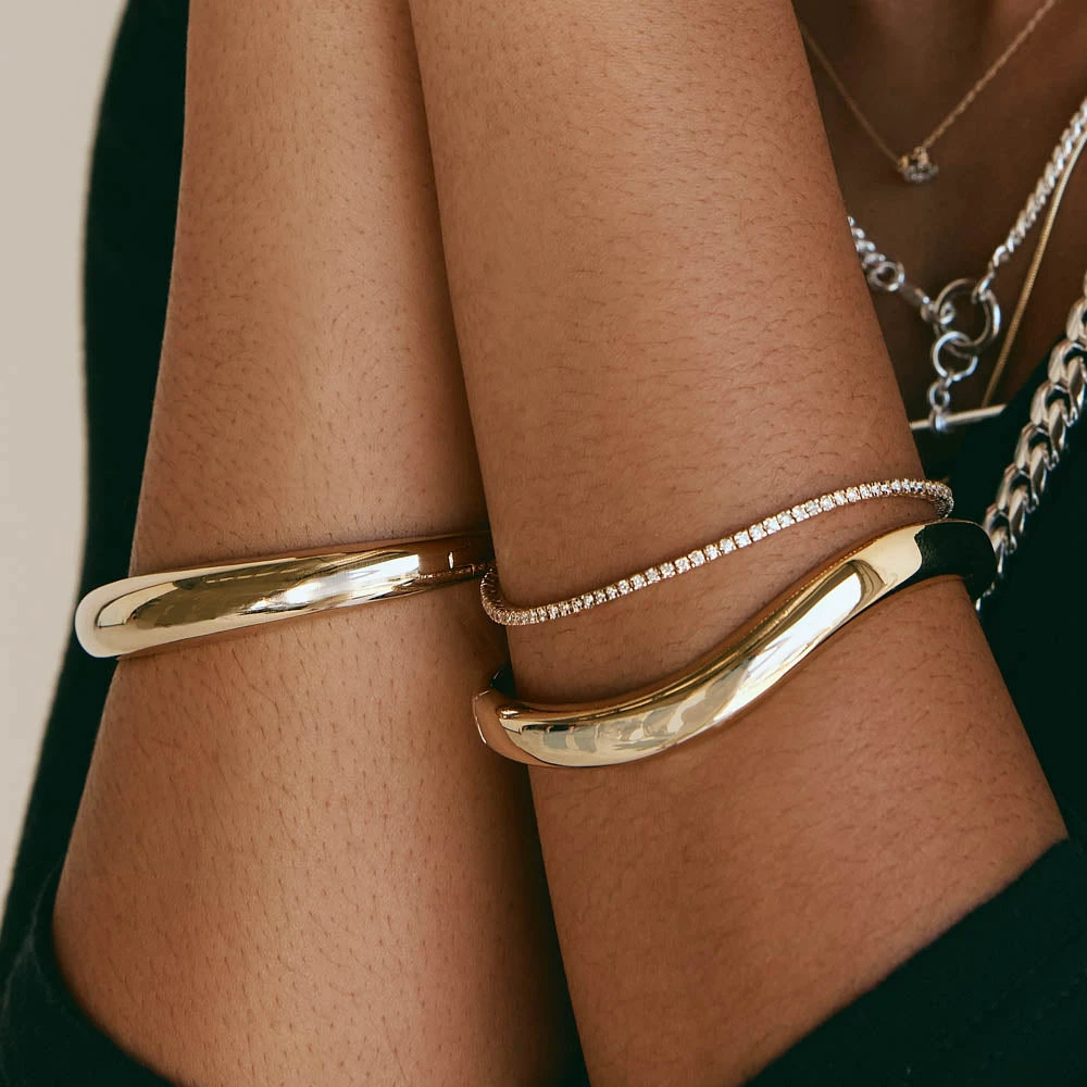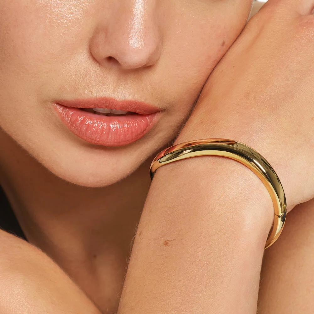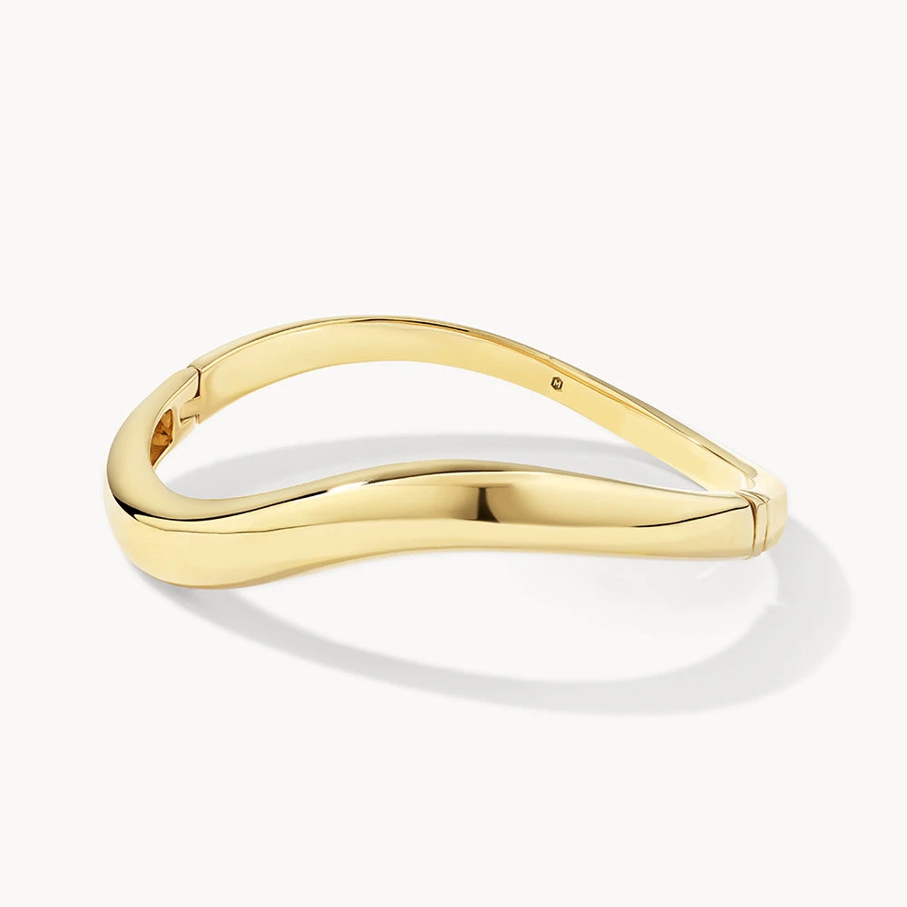 A fresh yet timeless style for summer (and every season), our wave bangle is the perfect unique piece to elevate all your looks. With a bold, fluid dome design, this statement bangle can easily be worn alone for effortless elegance, or stacked with other gold bangles and chain bracelets for a personalised look. Crafted in 18k gold plated sterling silver, pair your wave bangle back with everything from bright maxi dresses and neutral linens to denim this season. Stack it with our gold white topaz wave bangle for the full look.
