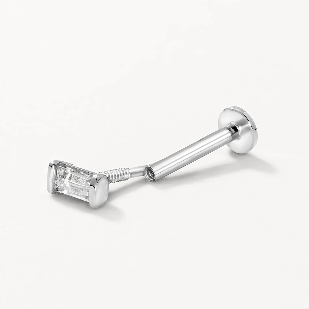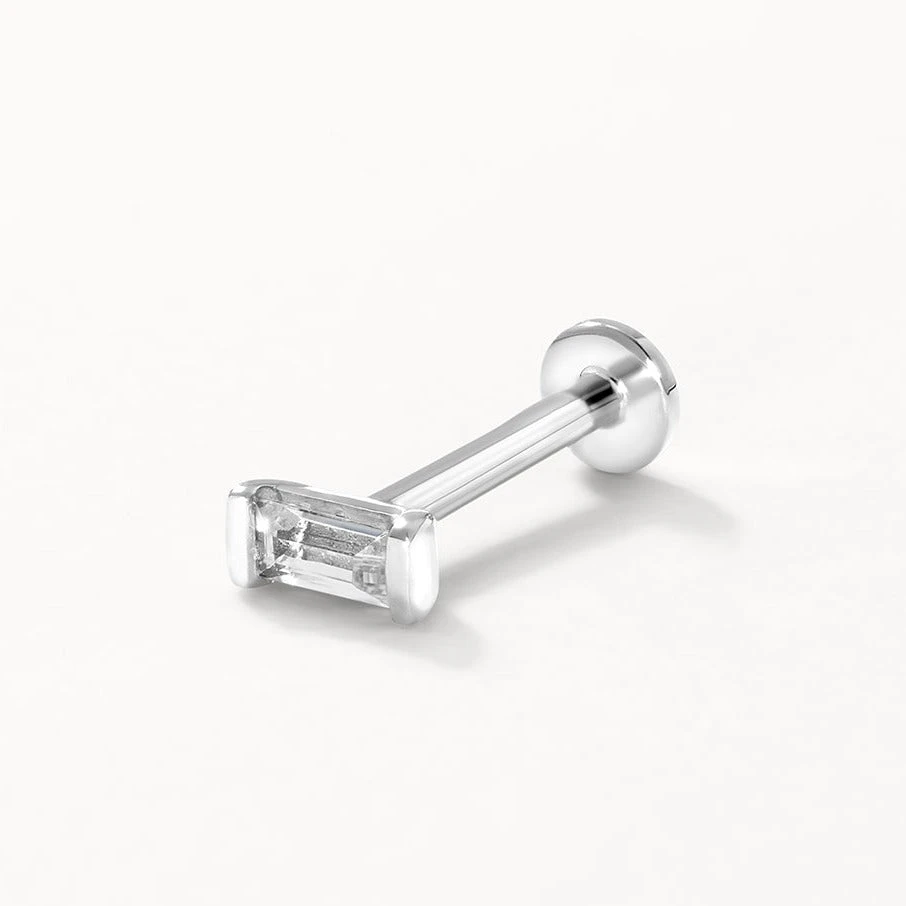 Bring an edge to your ear stack with this white sapphire helix stud. Featuring a natural stone in a modern baguette cut, this flat back stud will bring a touch of sparkle to your look. It’s crafted in 925 sterling silver and comes in two post lengths so you can choose your perfect fit and wear it on repeat.