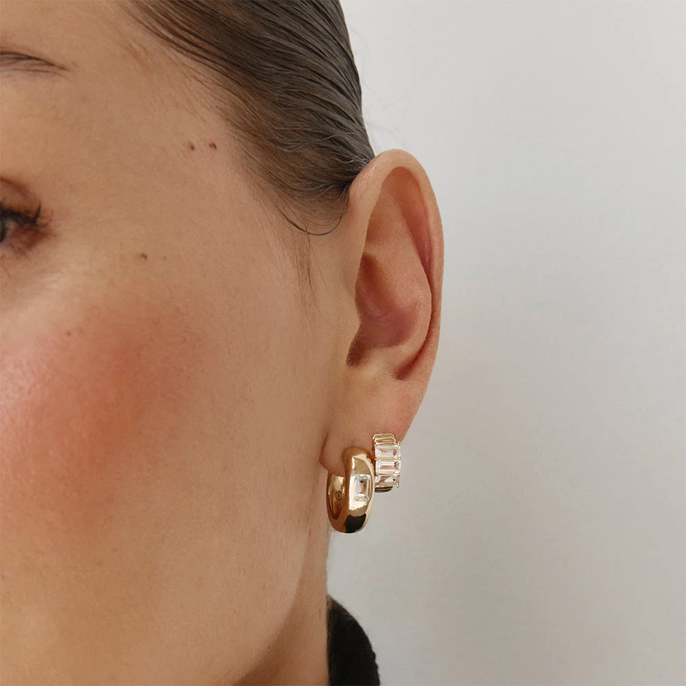 The perfect statement huggies to elevate your everyday style. These textured earrings feature a unique ribbed design, adorned with a trio of natural white topaz stones. Crafted in 18k fine gold plating, these white topaz earrings can be worn alone for a bold-meets-minimalist look, or stacked with gold hoops.