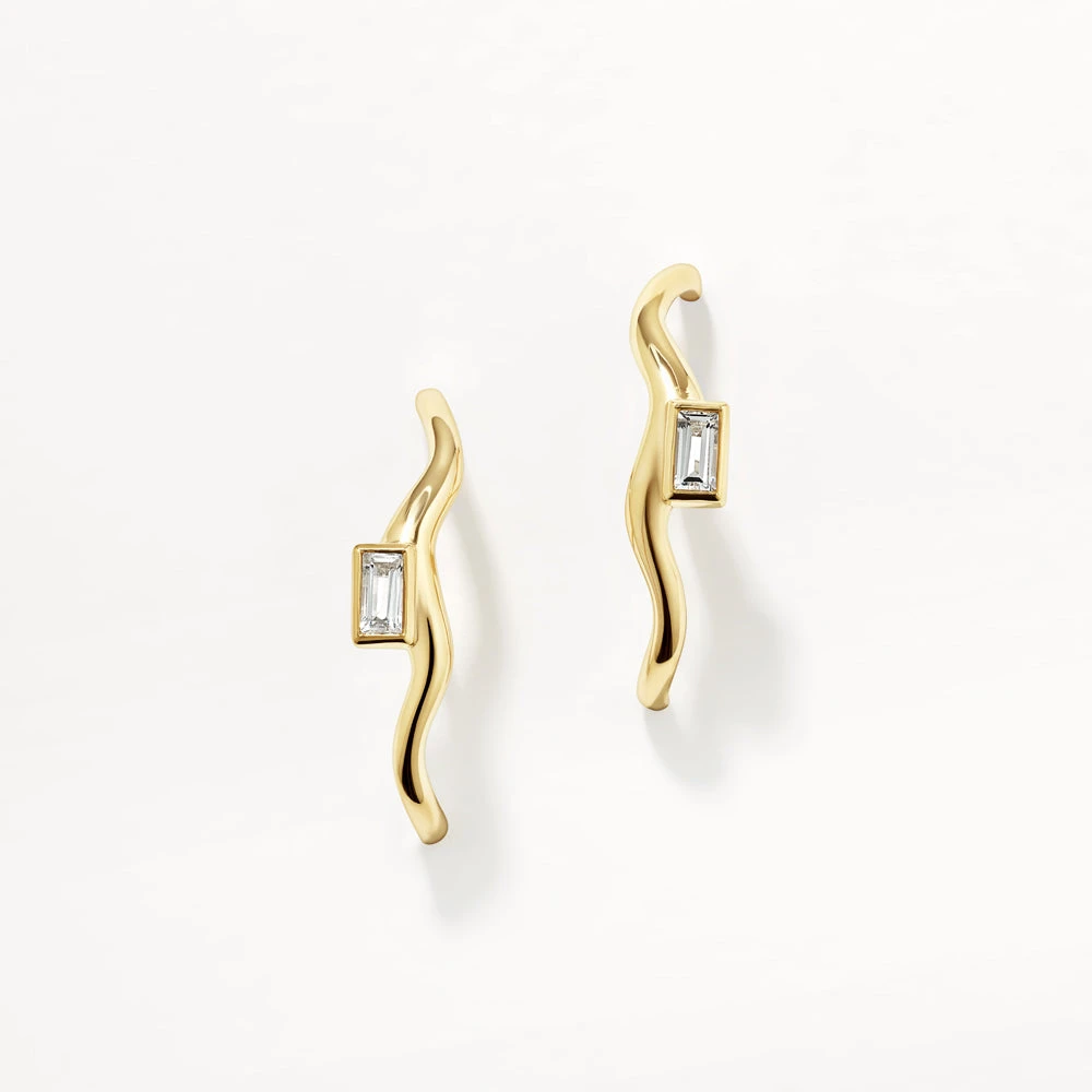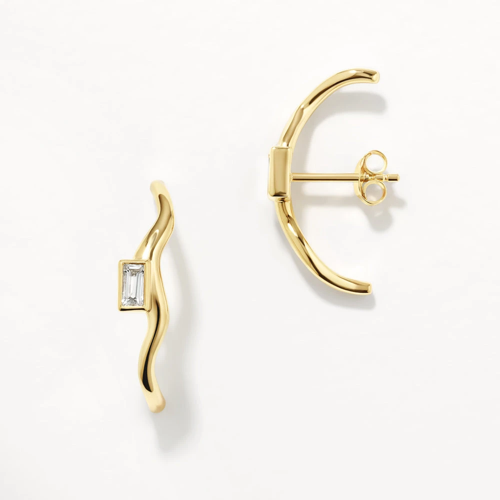 Elevate your earring collection with these modern suspender earrings. Worn through your piercing, these white topaz earrings also hug your lobe and feature a baguette topaz and wavy profile. Crafted in 18k fine gold plating and natural white topaz.