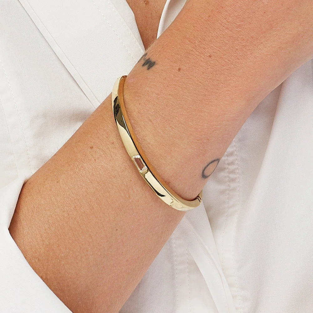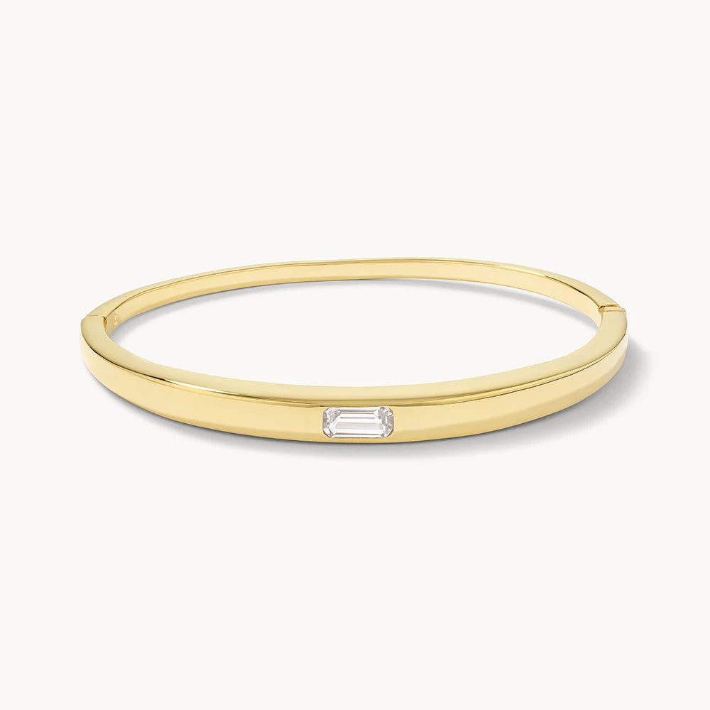 Our bold, square shape bangle is the ultimate contemporary piece. Featuring a sleek, plain gold bangle design with a minimalist touch of radiance via an emerald cut, natural white topaz. Crafted in 18k fine gold plating, wear our white topaz bangle alone for chic simplicity or stack it with gold chain bracelets for a statement look.