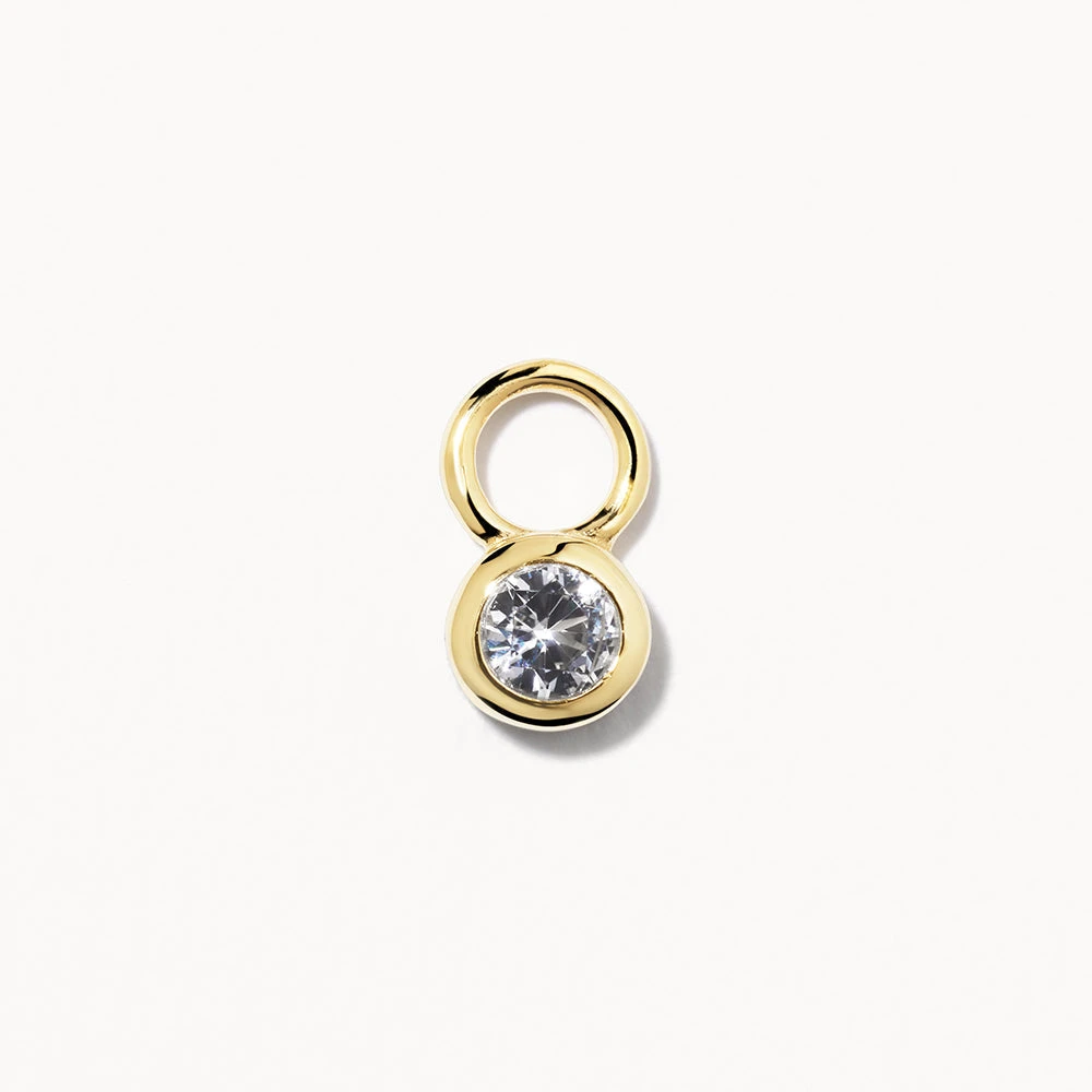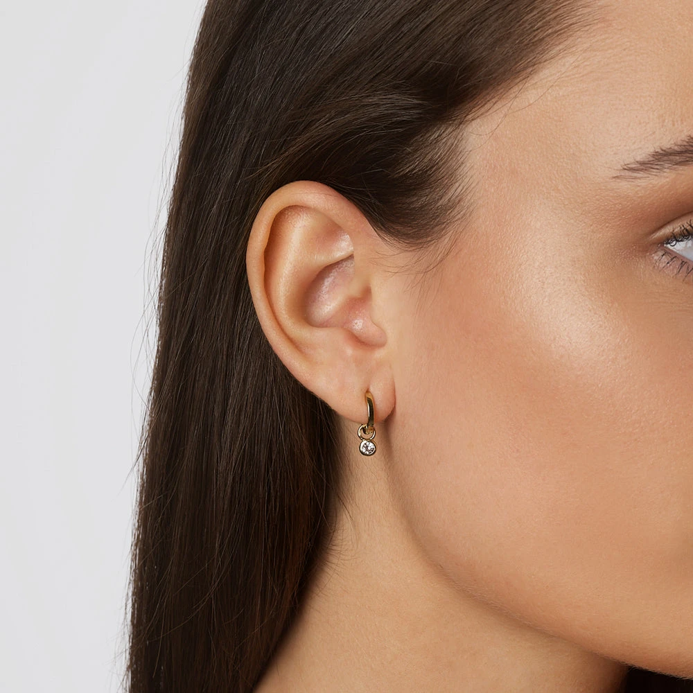 Elevate and personalise your curated ear look with our range of must-have earring charms. This dainty circle charm features a natural white topaz gem set in 10k yellow gold. Designed to wear on a huggie or sleeper earring, it drops to add movement to your look and catch the light. Wear one at a time, or mix and match a stack of hoop earrings and charms for your bespoke look.