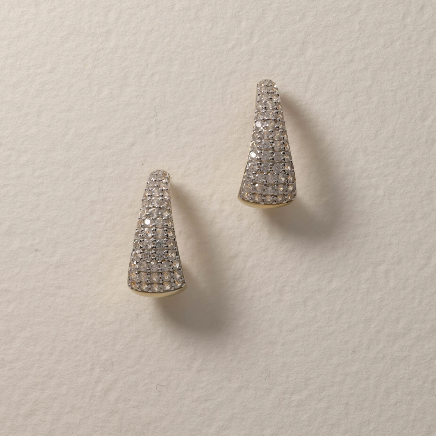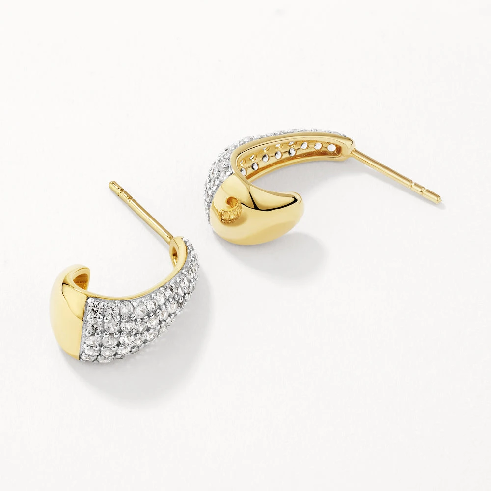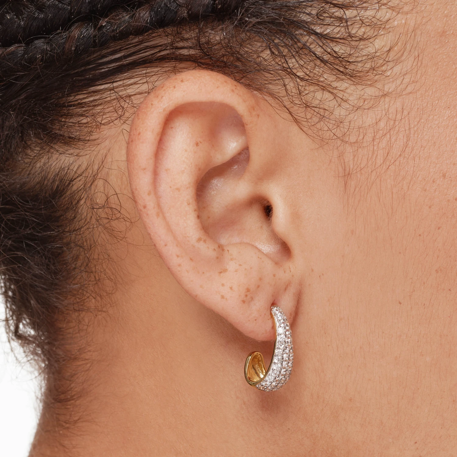 Bring statement shimmer to your everyday look with these white topaz earrings. With a graduated dome design adorned in pave white topaz, these 18k gold plated half hoop earrings are bold yet versatile. Finished with a stud closure, wear them alone or as part of a statement ear stack.