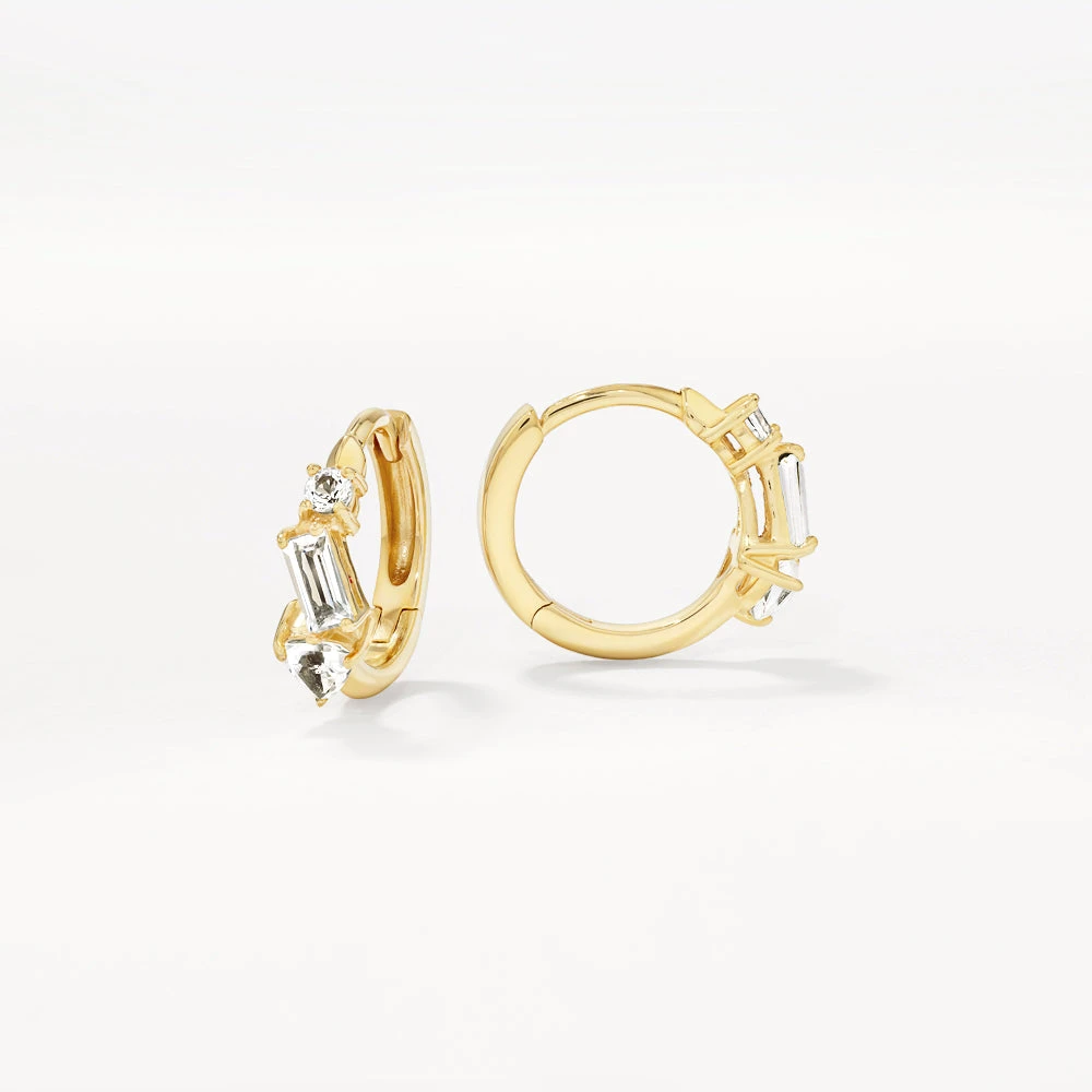 Swap out your everyday gold huggie earrings for this fancy-cut cluster pair. With each huggie featuring a trio of marquise, pear, and round cut white topaz stones, these gemstone earrings bring a textured and twinkling silhouette to every look. Crafted in 18k fine gold plating, pair them back with the fancy cut pendant necklace for a unique polished look.