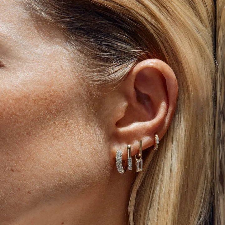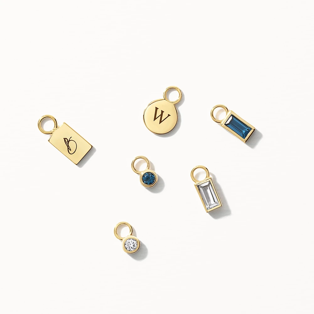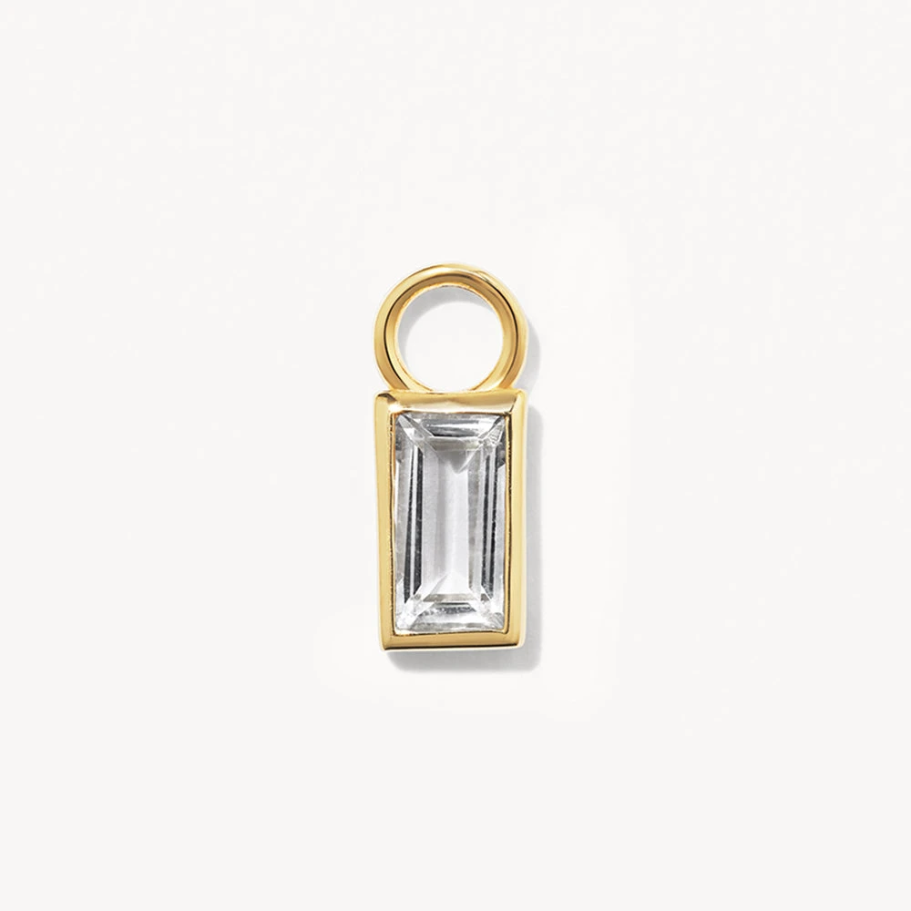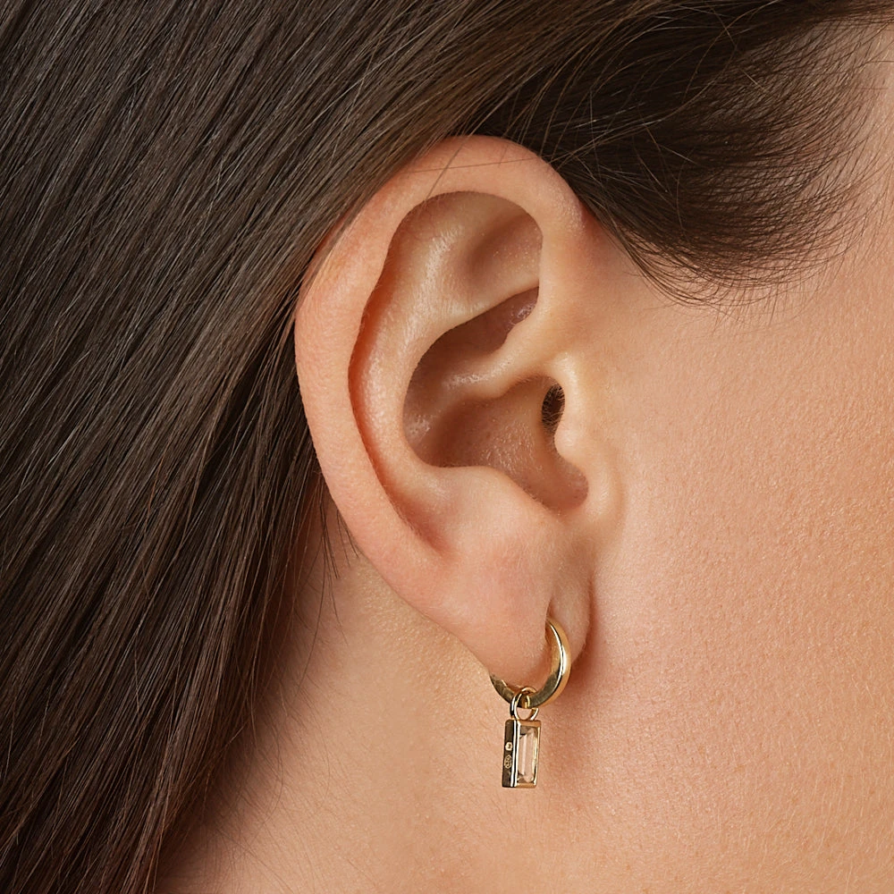 Elevate and personalise your curated ear look with our range of must-have earring charms. This dainty rectangular charm features a natural white topaz gem set in 10k yellow gold. Designed to wear on a huggie or sleeper earring, it drops to add movement to your look and catch the light. Wear one at a time, or mix and match a stack of hoop earrings and charms for your bespoke look.