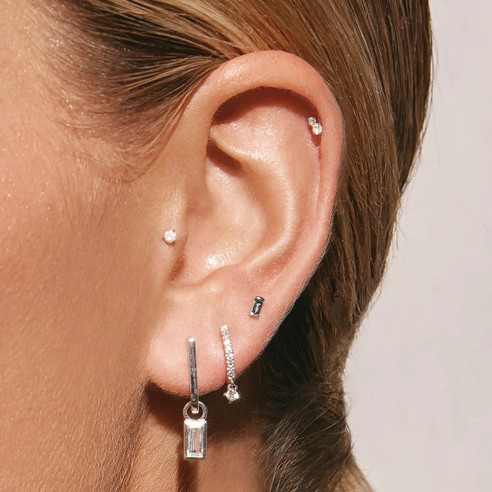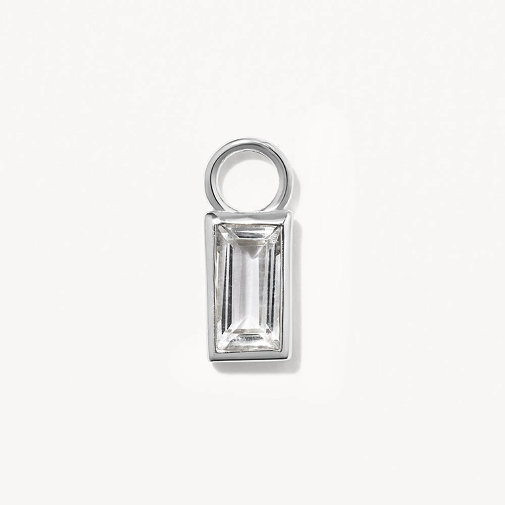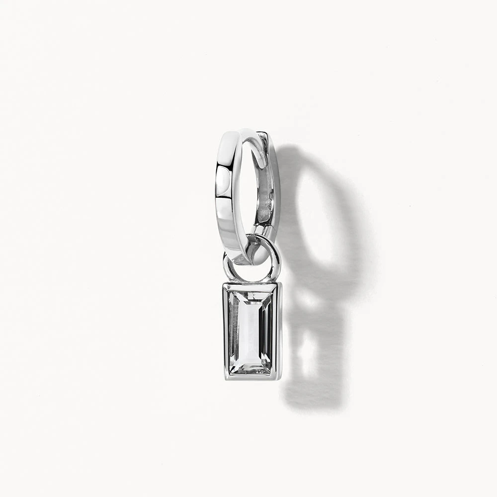 Elevate and personalise your curated ear look with our range of must-have earring charms. This dainty rectangular charm features a natural white topaz gem set in 925 sterling silver. Designed to wear on a huggie or sleeper earring, it drops to add movement to your look and catch the light. Wear one at a time, or mix and match a stack of hoop earrings and charms for your bespoke look.